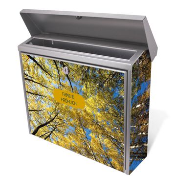 Der Briefkasten besteht aus Edelstahl, einem hochwertigen Material das witterungsbeständig ist. Das Motiv besteht aus einer wetter- und UV-festen Folie, die Ihren Briefkasten zusätzlich vor Kratzern schützt. Der Postkasten ist 31,5cm hoch, 38,5cm breit und 12cm tief. Der Briefeinwurf ist 33,2cm x 2,7cm, Format DIN C4. Der Briefkasten wird mit Montagematerial und zwei Schlüsseln geliefert.