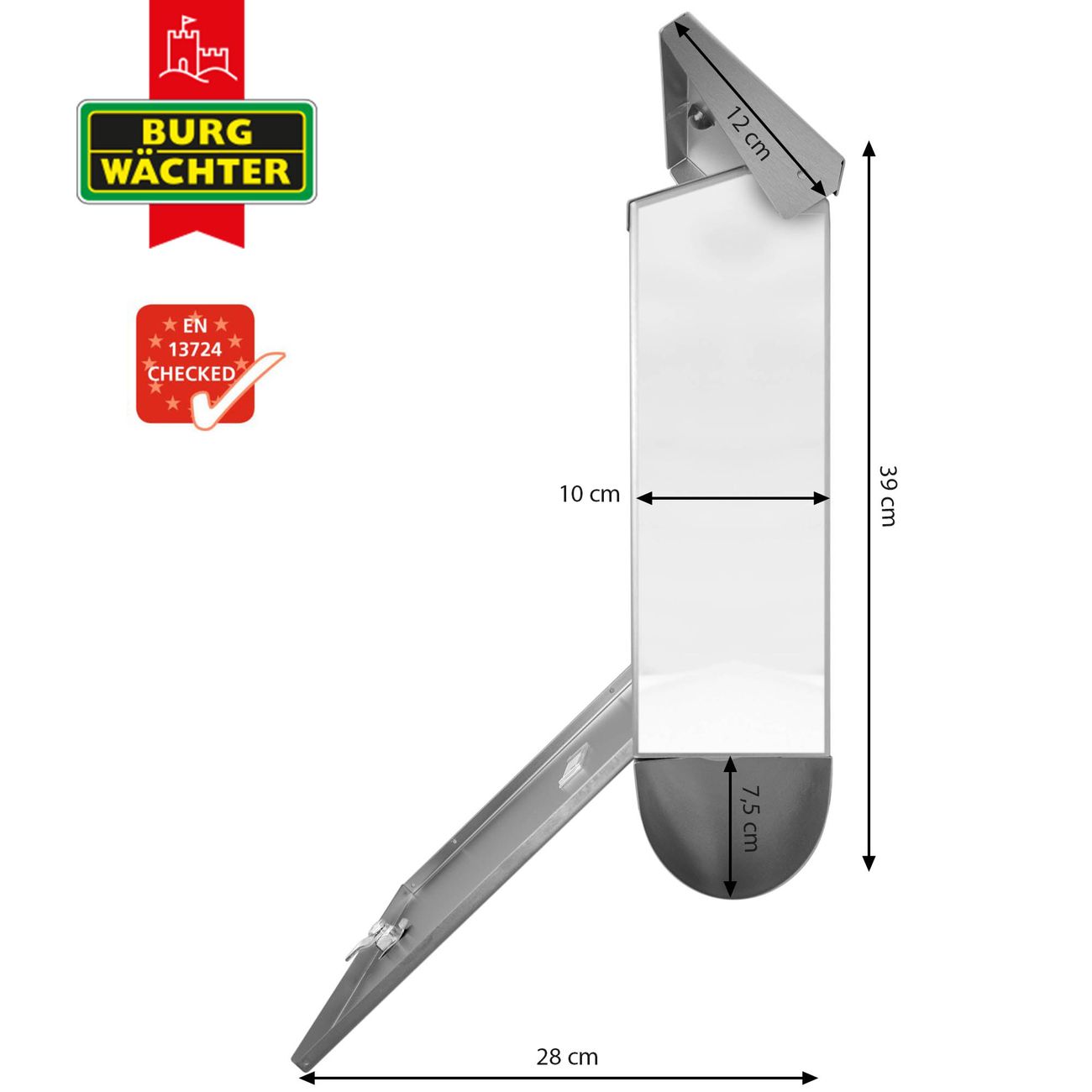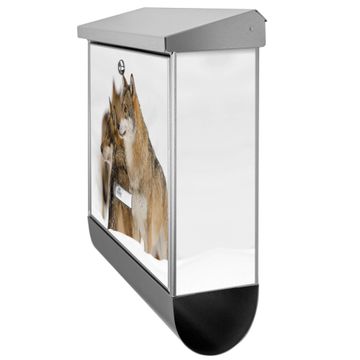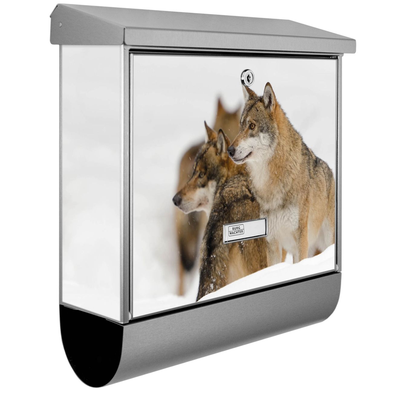 Der BURG-WÄCHTER Edelstahl Briefkasten mit Motiv Wölfe und Zeitungsrolle bietet Ihnen mit seinem Fassungsvermögen genügend Platz auch für große A4 Sendungen und Zeitschriften. Das integrierte Regendach schützt Ihre Post vor dem Eindringen von Regen.