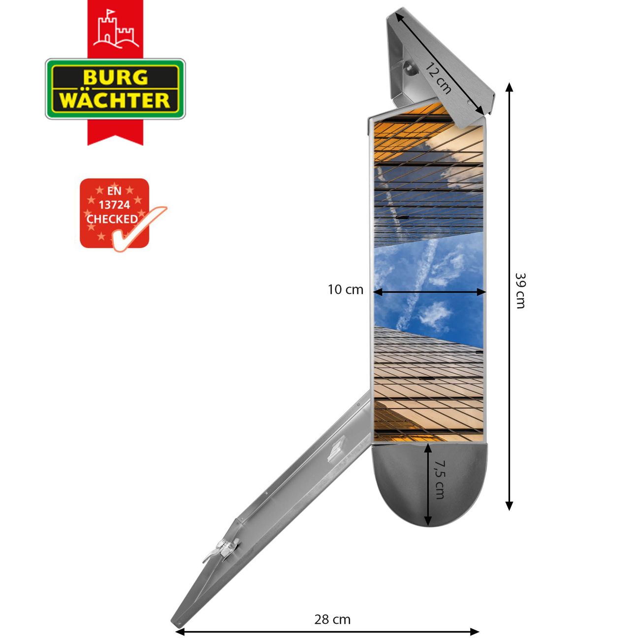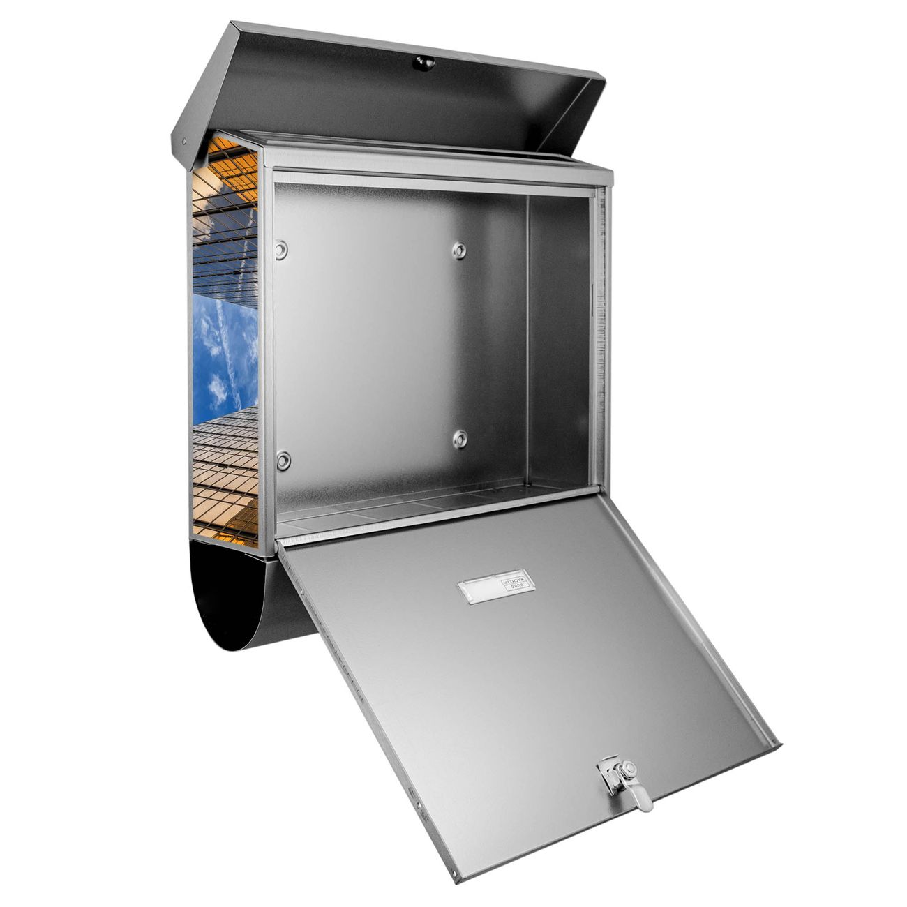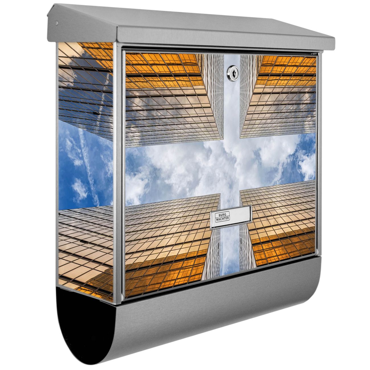 Der BURG-WÄCHTER Edelstahl Briefkasten mit Motiv Wolkenkratzer 2 und Zeitungsrolle bietet Ihnen mit seinem Fassungsvermögen genügend Platz auch für große A4 Sendungen und Zeitschriften. Das integrierte Regendach schützt Ihre Post vor dem Eindringen von Regen.