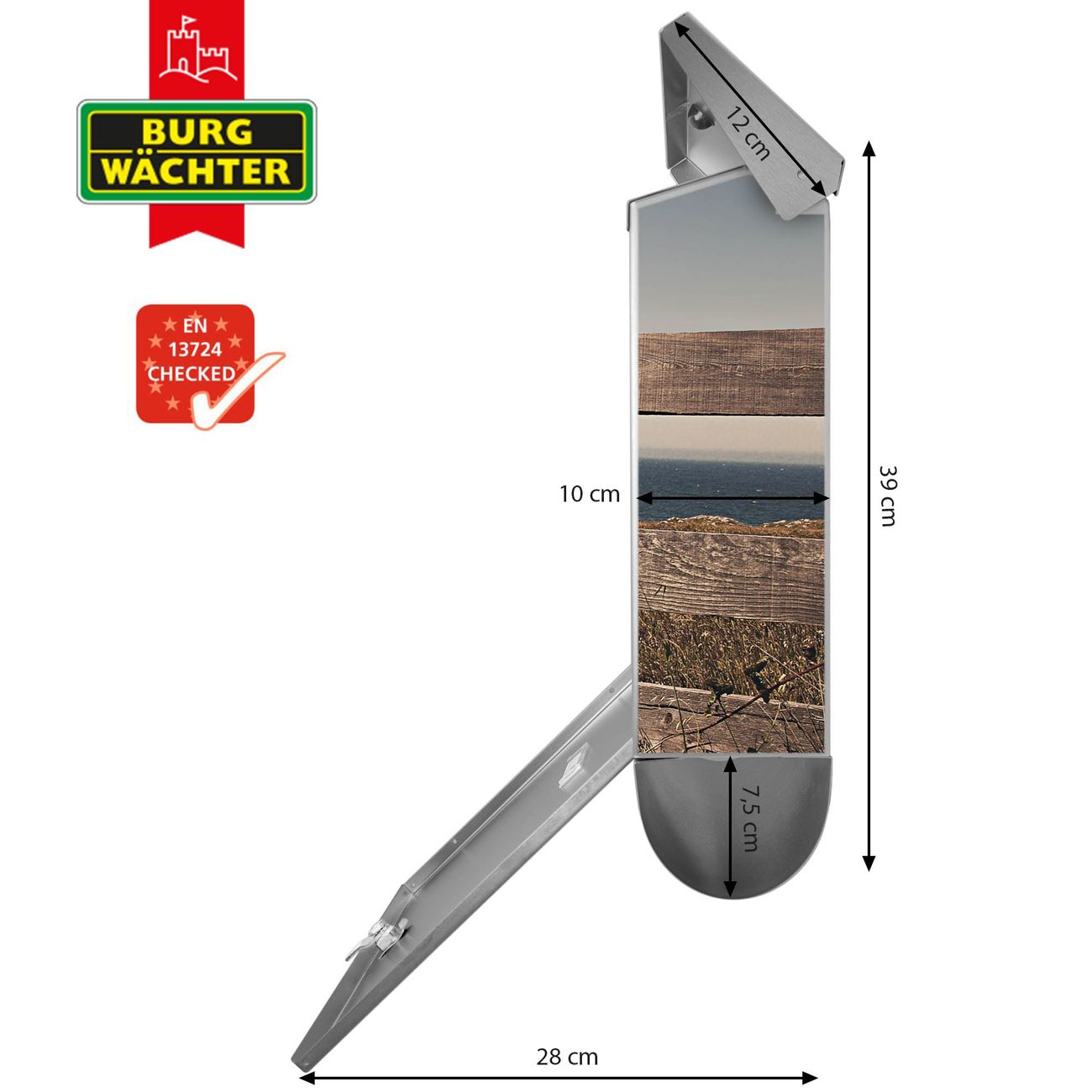 Der BURG-WÄCHTER Edelstahl Briefkasten mit Motiv Zaun am Meer und Zeitungsrolle bietet Ihnen mit seinem Fassungsvermögen genügend Platz auch für große A4 Sendungen und Zeitschriften. Das integrierte Regendach schützt Ihre Post vor dem Eindringen von Regen.