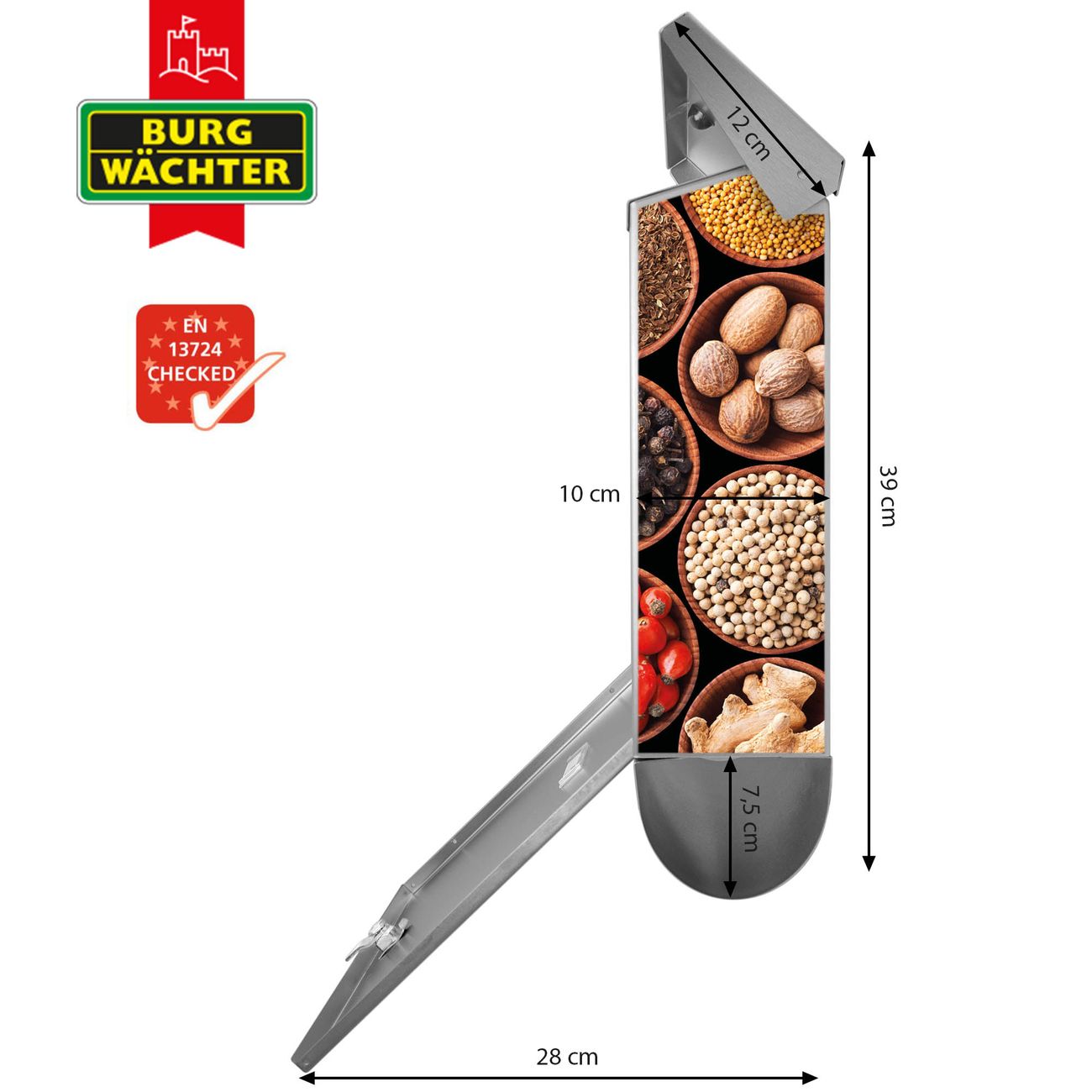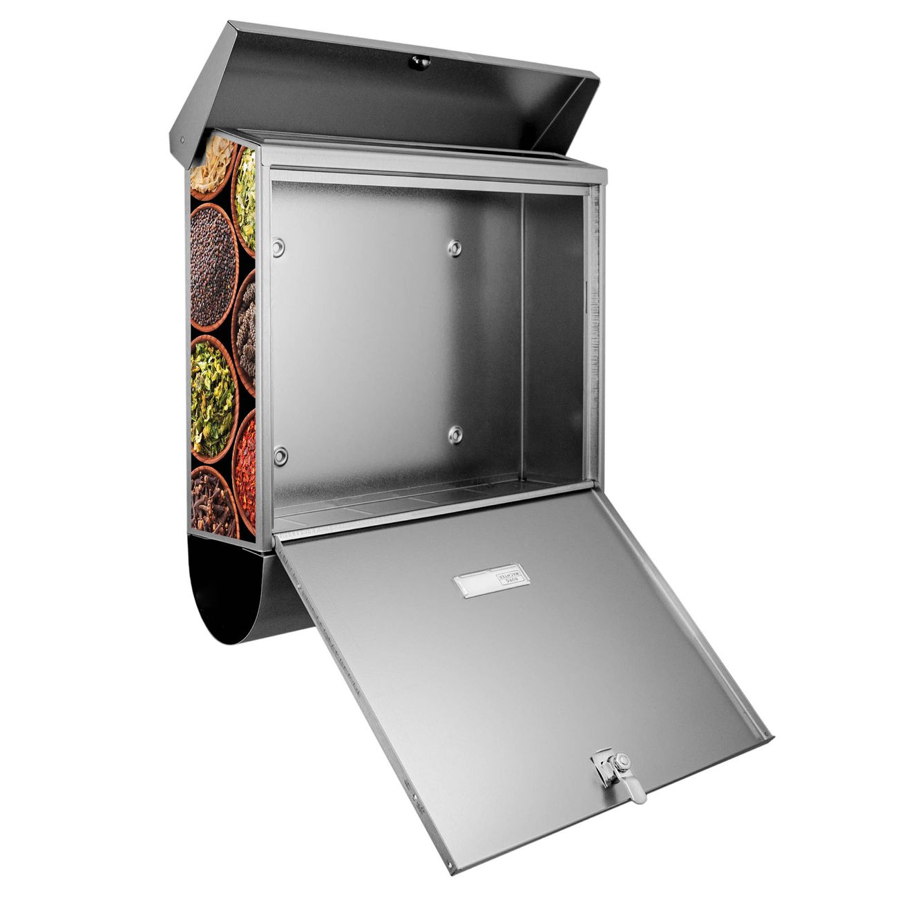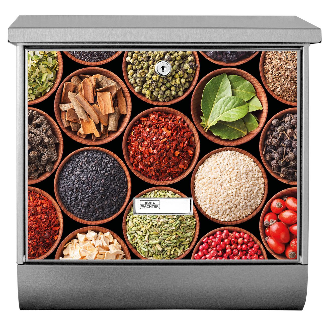 Der BURG-WÄCHTER Edelstahl Briefkasten mit Motiv Zutaten und Zeitungsrolle bietet Ihnen mit seinem Fassungsvermögen genügend Platz auch für große A4 Sendungen und Zeitschriften. Das integrierte Regendach schützt Ihre Post vor dem Eindringen von Regen.