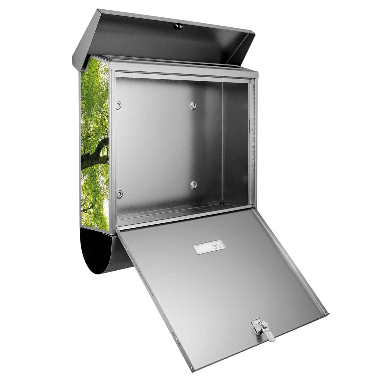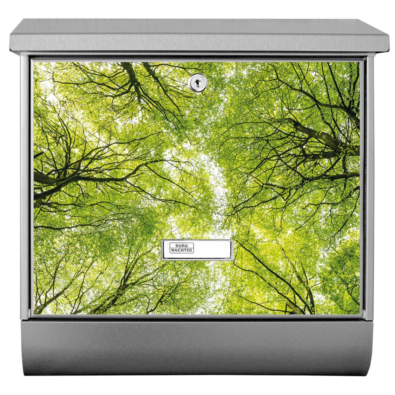 Der BURG-WÄCHTER Edelstahl Briefkasten mit Motiv Zwischen Bäumen und Zeitungsrolle bietet Ihnen mit seinem Fassungsvermögen genügend Platz auch für große A4 Sendungen und Zeitschriften. Das integrierte Regendach schützt Ihre Post vor dem Eindringen von Regen.