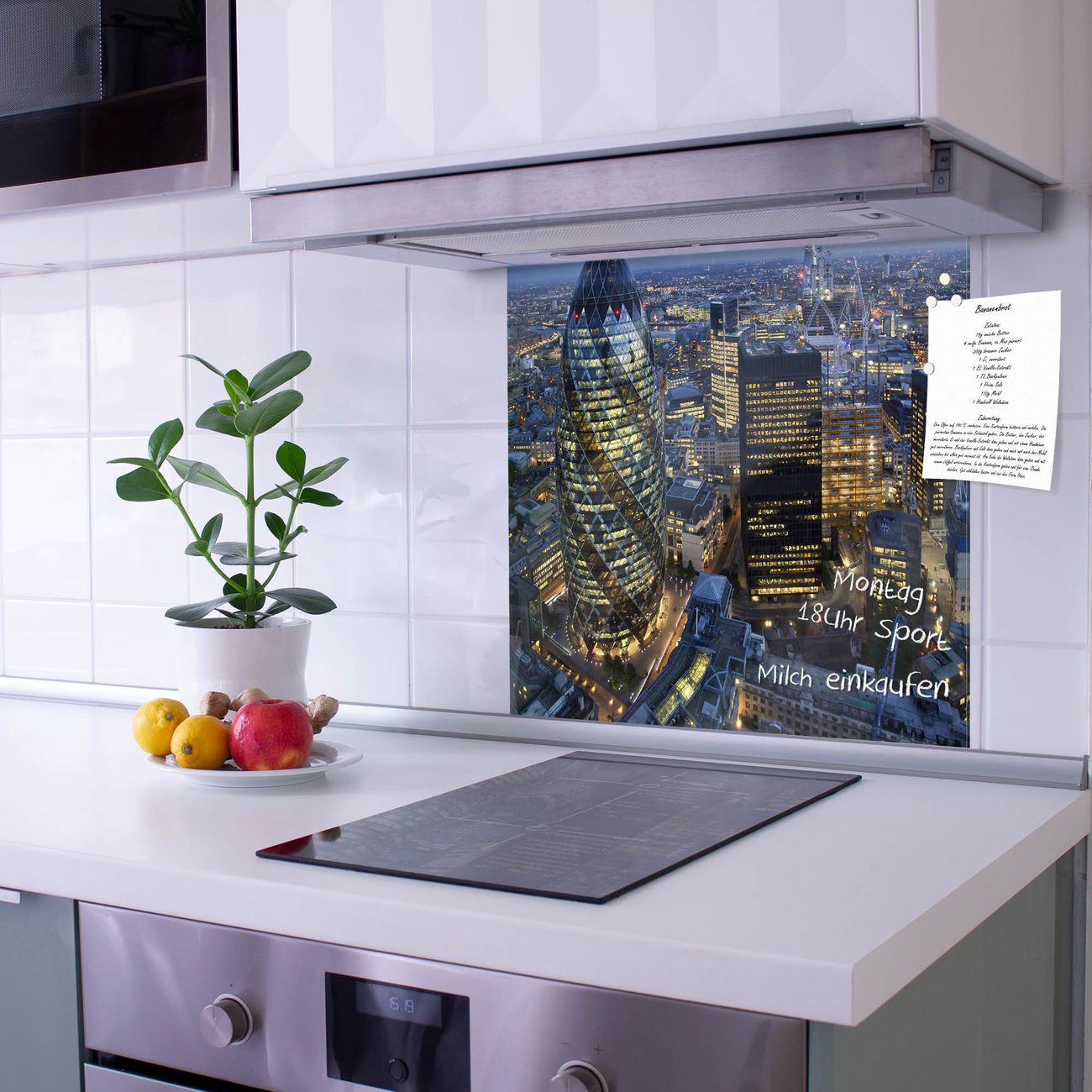 Die Küchenrückwand ist eine elegante Mehrzwecktafel: als Spritzschutz hinter Herd oder Waschbecken, hält Notizen wie ein Memoboard, ist beschreibbar mit Kreidestiften oder Whiteboard-Markern, sieht umwerfend als Glasbild aus. Sie besteht aus gehärtetem Glas, die Rückwand aus einem magnetischen Stahlblech. Durch die superflache Bauweise haben Sie die Wahl aus einer Vielzahl von Befestigungsmöglichkeiten. Sie können die Küchenrückwand mit einem Montagekleber superflach an die Wand kleben oder Sie wählen eines unserer passenden Befestigungssets, welches eine optimale Montage garantiert. Die Küchenrückwand besteht aus zertifiziertem Sicherheitsglas. Durch die mitgelieferten 4 Neodym-Magnete ist Ihre Glas Magnettafel sofort einsatzbereit.