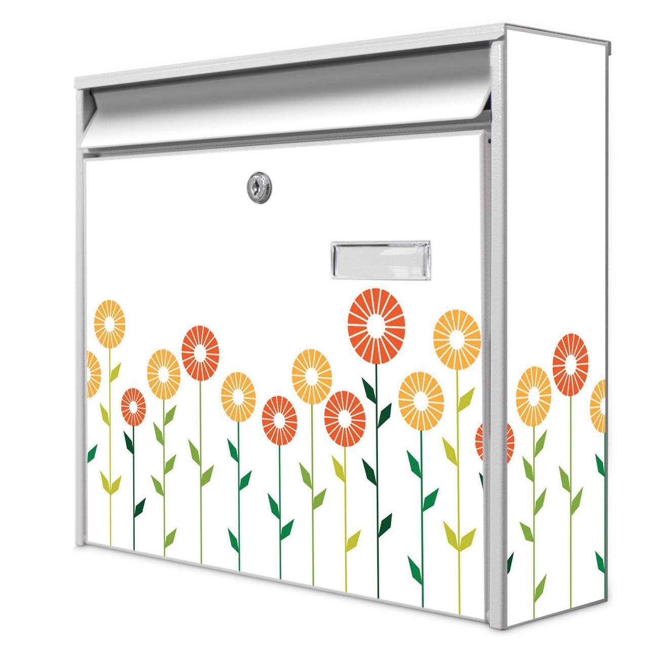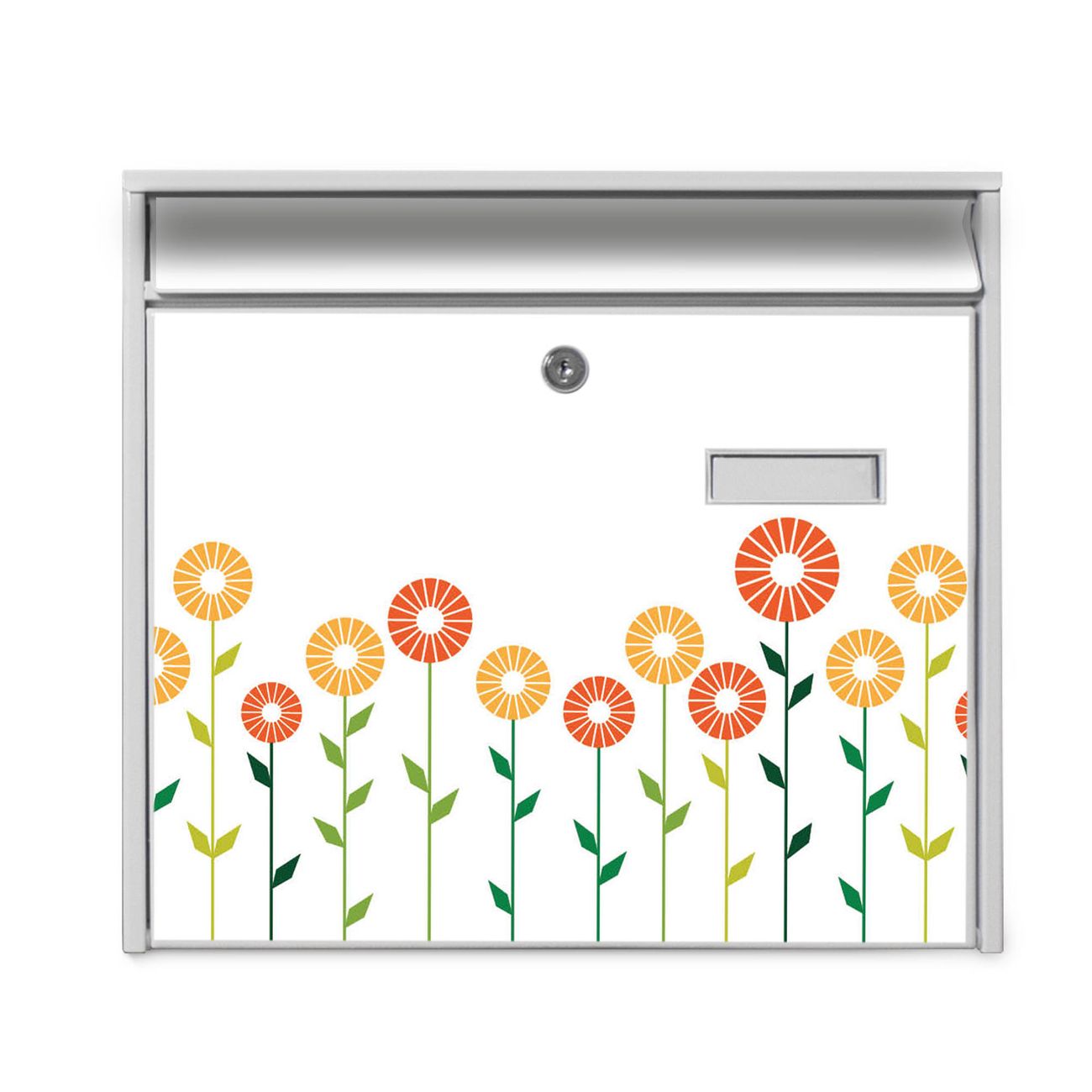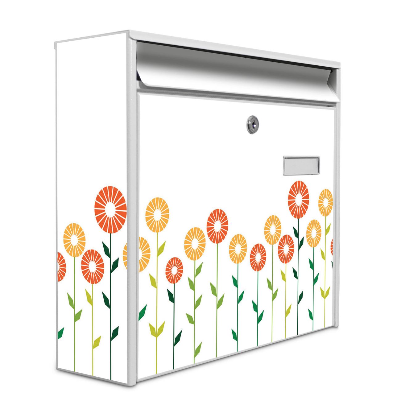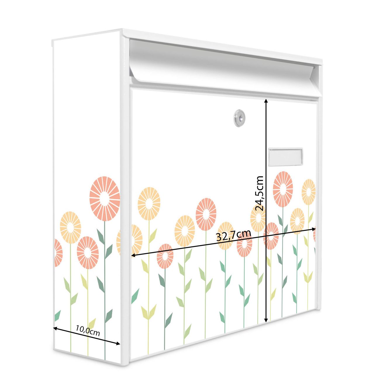 Der Burg Wächter Mail Briefkasten mit Motiv Abstrakte Margeriten bietet Ihnen mit seinem Fassungsvermögen genügend Platz auch für große A4 Sendungen. Auf Wunsch können Sie bei uns den passenden Standfuß kaufen und so aus dem Wandbriefkasten einen Standbriefkasten machen. Wir bieten Ihnen ebenfalls Namensschilder, bereits beschriftet oder frei zu beschriften, und verschiedene selbst gestaltete Bitte-Keine-Werbung-Aufkleber.