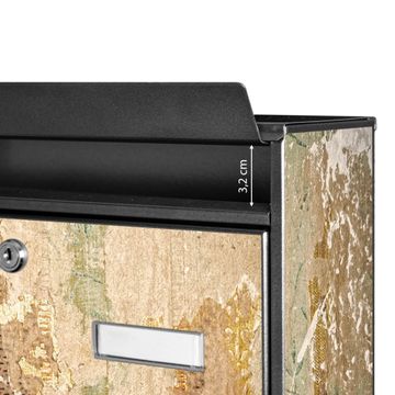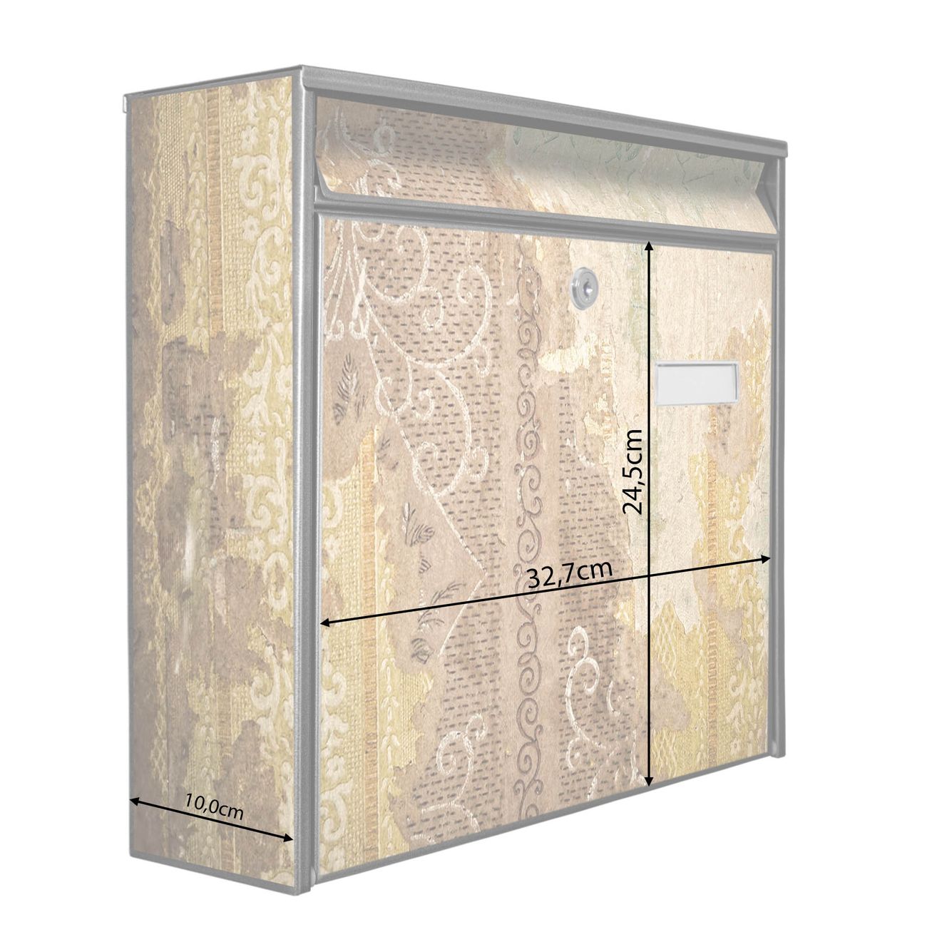 Der Burg Wächter Mail Briefkasten mit Motiv Alte Tapeten bietet Ihnen mit seinem Fassungsvermögen genügend Platz auch für große A4 Sendungen. Auf Wunsch können Sie bei uns den passenden Standfuß kaufen und so aus dem Wandbriefkasten einen Standbriefkasten machen. Wir bieten Ihnen ebenfalls Namensschilder, bereits beschriftet oder frei zu beschriften, und verschiedene selbst gestaltete Bitte-Keine-Werbung-Aufkleber.