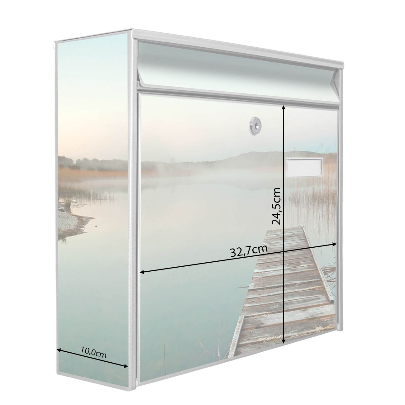 Die Größe des Briefkastens ist 36 x 32 x 10cm (BxHxT) groß. Das Motiv besteht aus einer wetter- und UV-festen Folie, die mit einem Schutzlaminat überzogen ist und Ihren Briefkasten zusätzlich vor Kratzern schützt. Sie erhalten 2 Schlüssel sowie das Montagematerial.