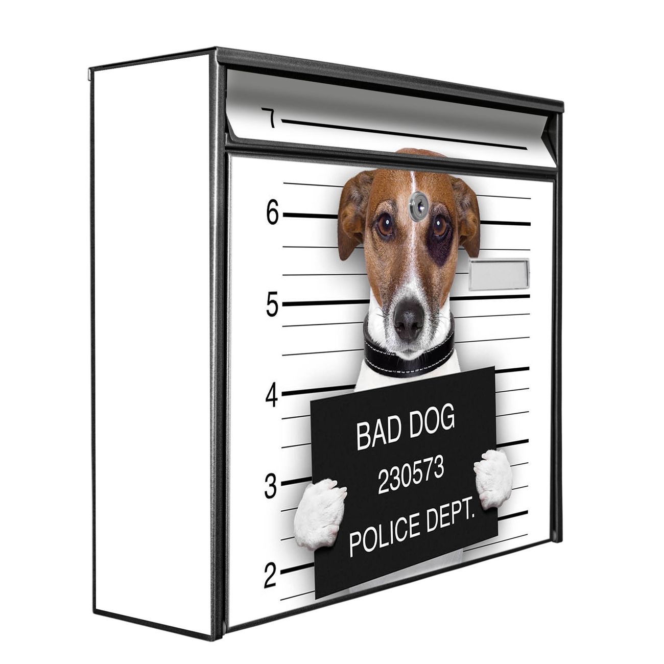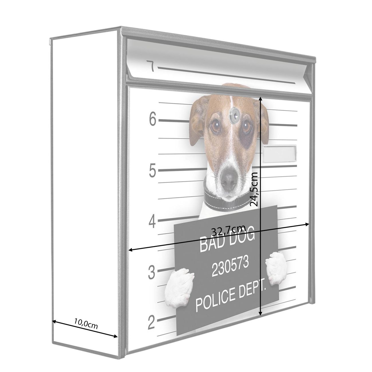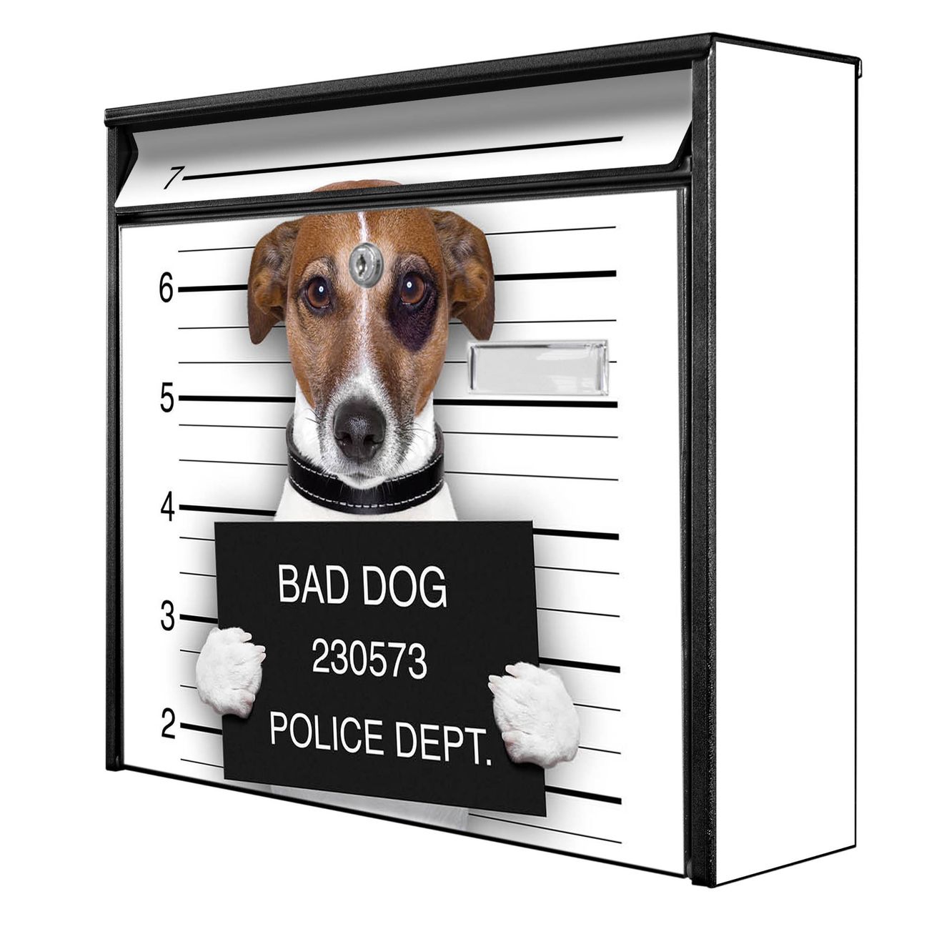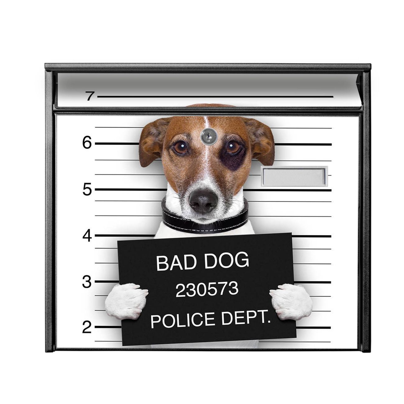 Der Burg Wächter Mail Briefkasten mit Motiv Bad Dog Jack Russel bietet Ihnen mit seinem Fassungsvermögen genügend Platz auch für große A4 Sendungen. Auf Wunsch können Sie bei uns den passenden Standfuß kaufen und so aus dem Wandbriefkasten einen Standbriefkasten machen. Wir bieten Ihnen ebenfalls Namensschilder, bereits beschriftet oder frei zu beschriften, und verschiedene selbst gestaltete Bitte-Keine-Werbung-Aufkleber.