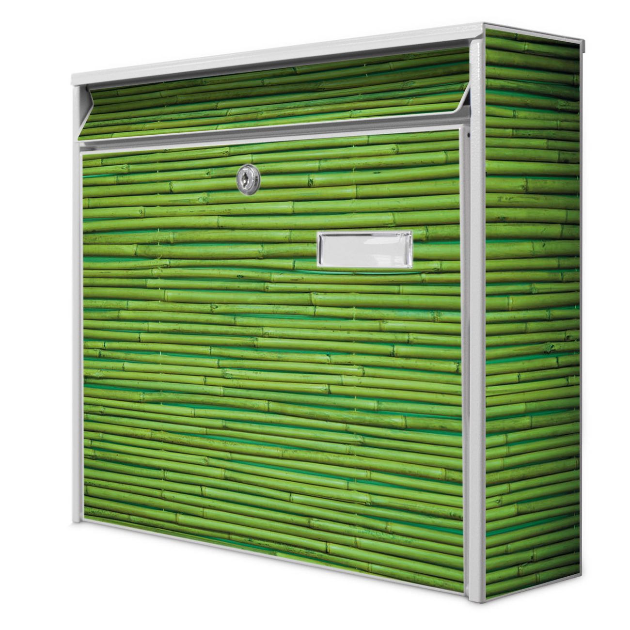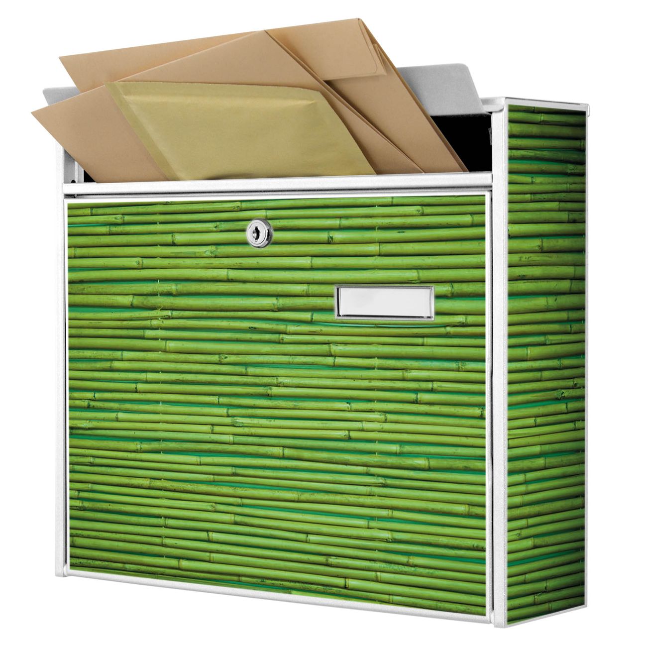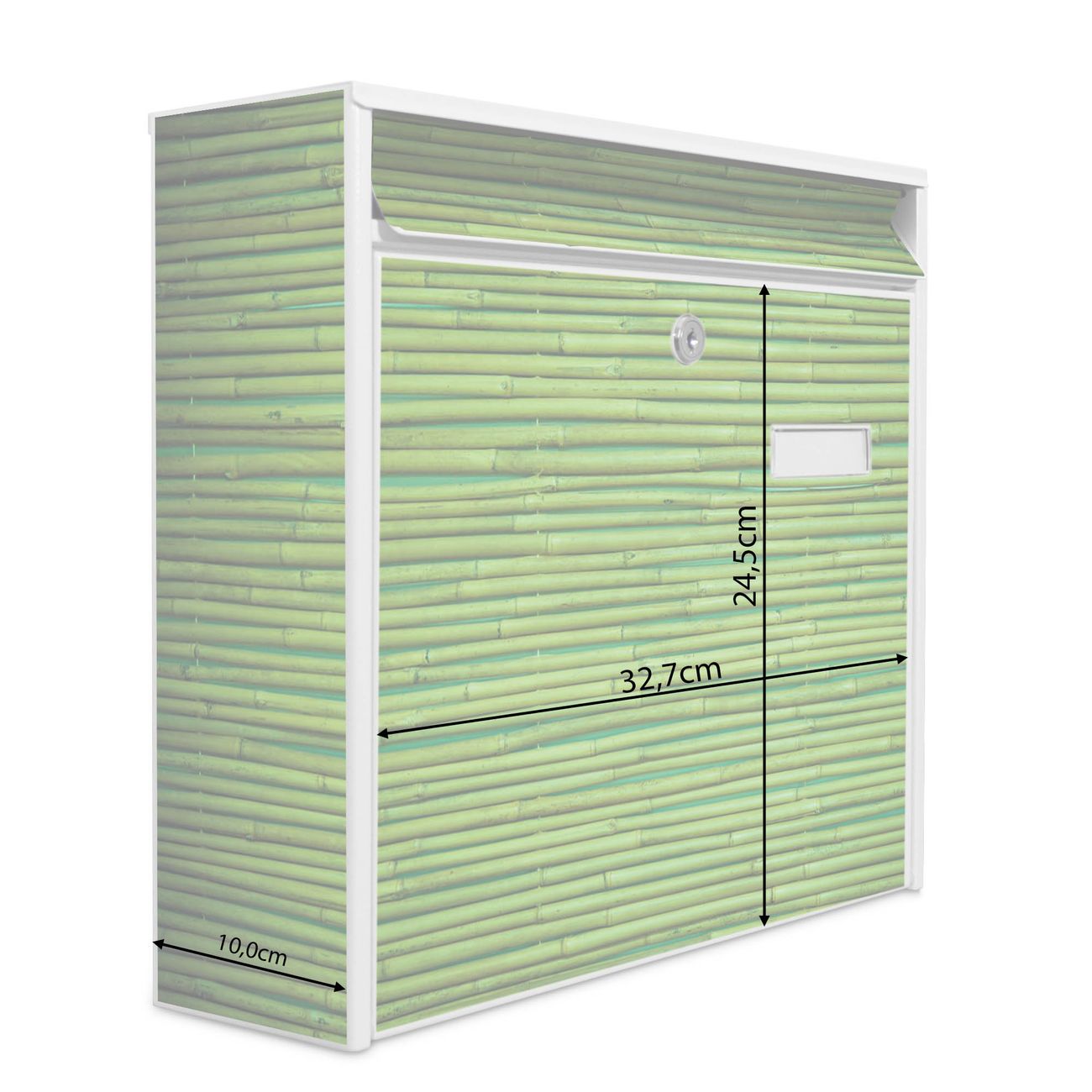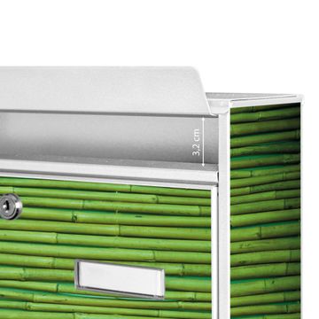 Der Burg Wächter Mail Briefkasten mit Motiv Bambus Grün bietet Ihnen mit seinem Fassungsvermögen genügend Platz auch für große A4 Sendungen. Auf Wunsch können Sie bei uns den passenden Standfuß kaufen und so aus dem Wandbriefkasten einen Standbriefkasten machen. Wir bieten Ihnen ebenfalls Namensschilder, bereits beschriftet oder frei zu beschriften, und verschiedene selbst gestaltete Bitte-Keine-Werbung-Aufkleber.
