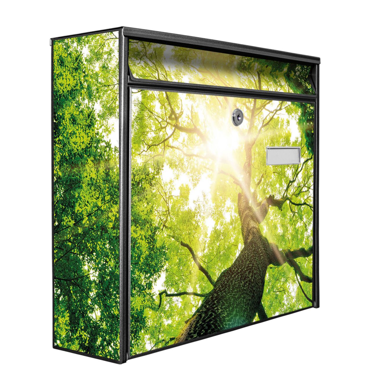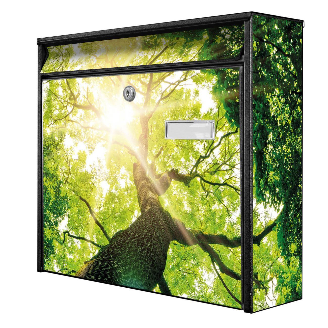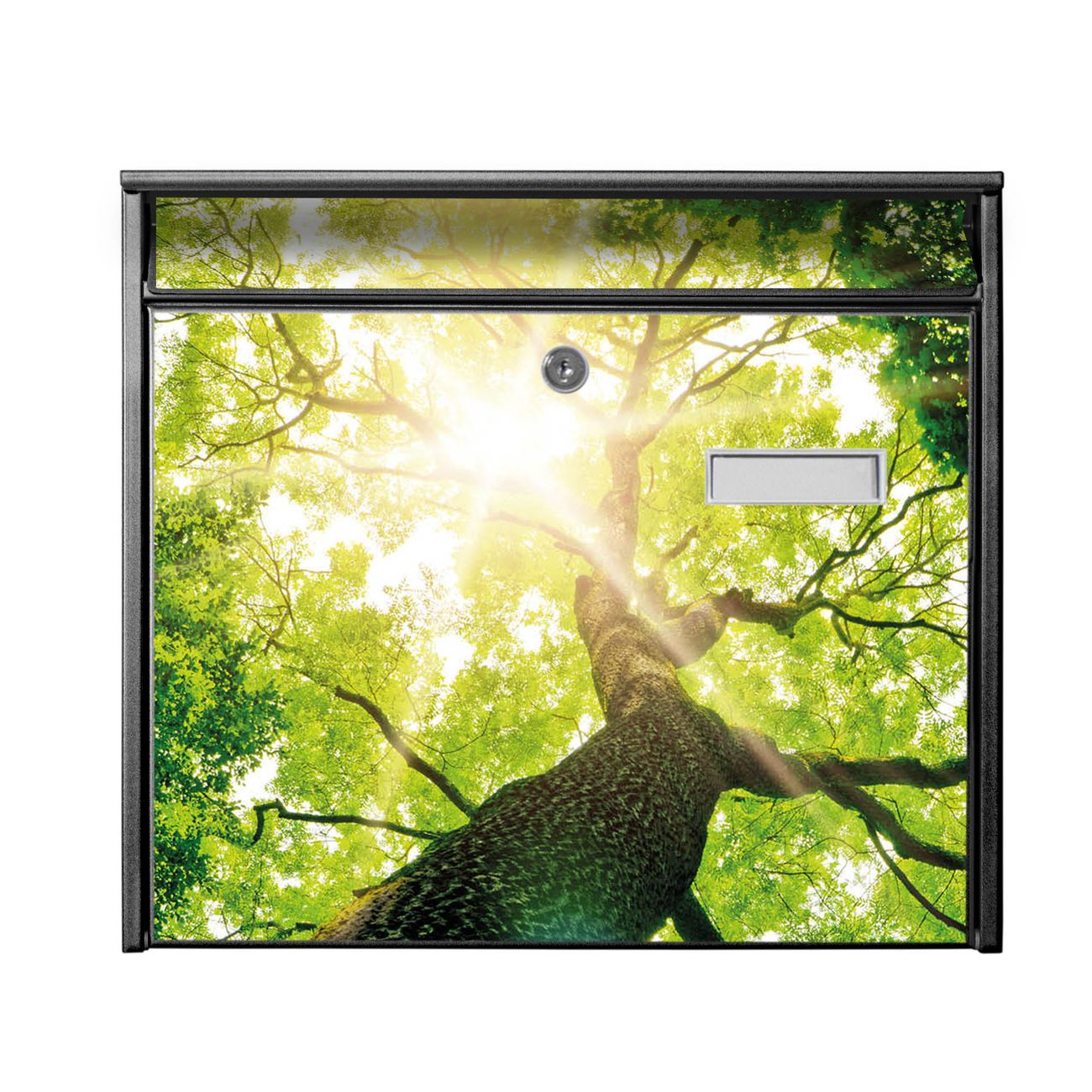 Der Postkasten mit Motiv Baumkrone hat ein sehr ansprechendes und zeitloses Design. Heben Sie Sich von der tristen grauen Masse ab, ohne auf Funktionalität zu verzichten. Die weite Öffnung ohne scharfe Kanten ermöglicht eine einfache Handhabung beim Entnehmen der Post. Die Größe bietet genügend Platz für Sendungen aller Art, der Einwurf fasst auch größere A4 Sendungen. Ihr Burg-Wächter Motivbriefkasten wird in Sachsen in einer kleinen Manufaktur von Hand veredelt. Die Motivfolie ist lösungsmittelfrei und schutzlaminiert, dies sorgt für einen langen Halt. Wir legen großen Wert auf die Verbindung von Funktionalität und Design.