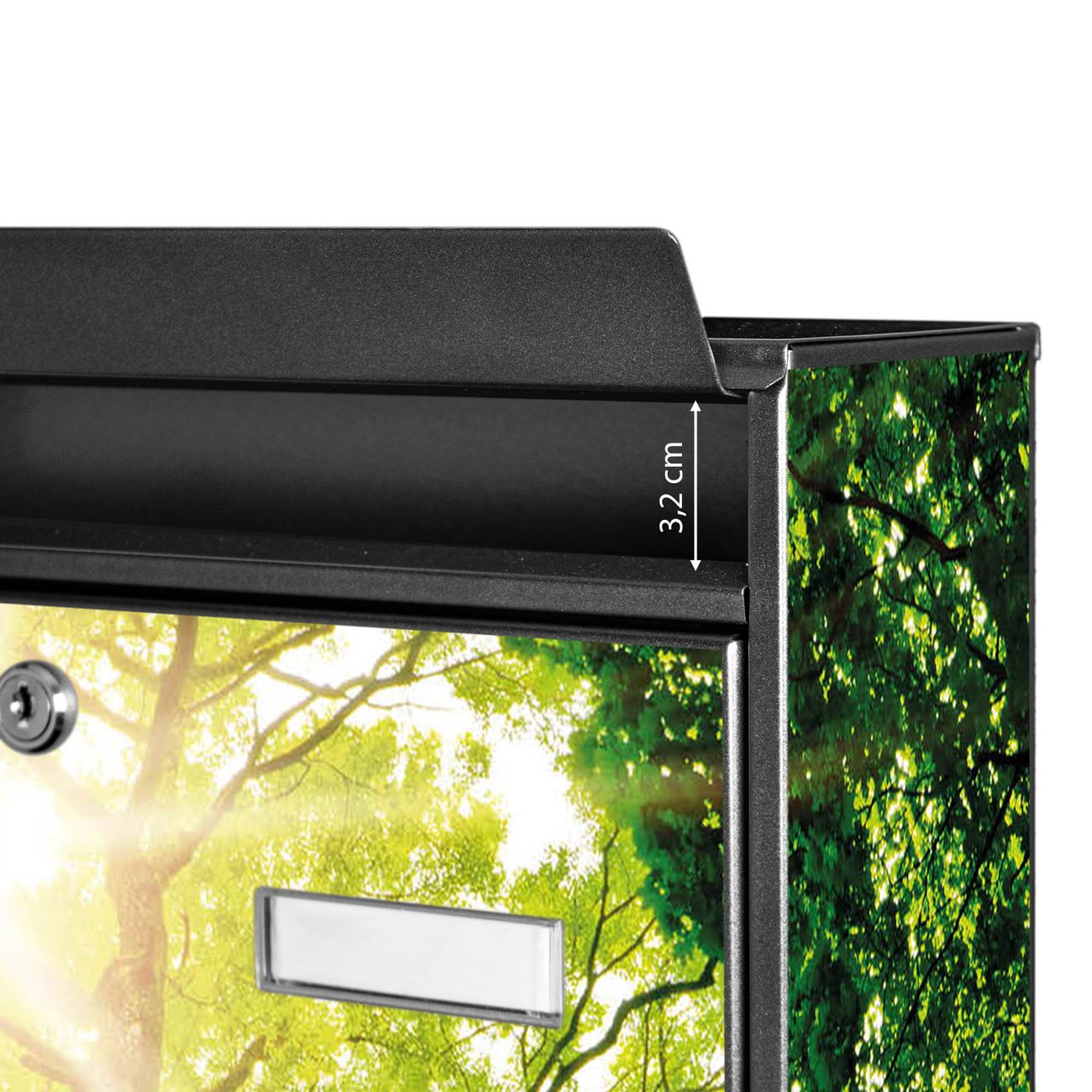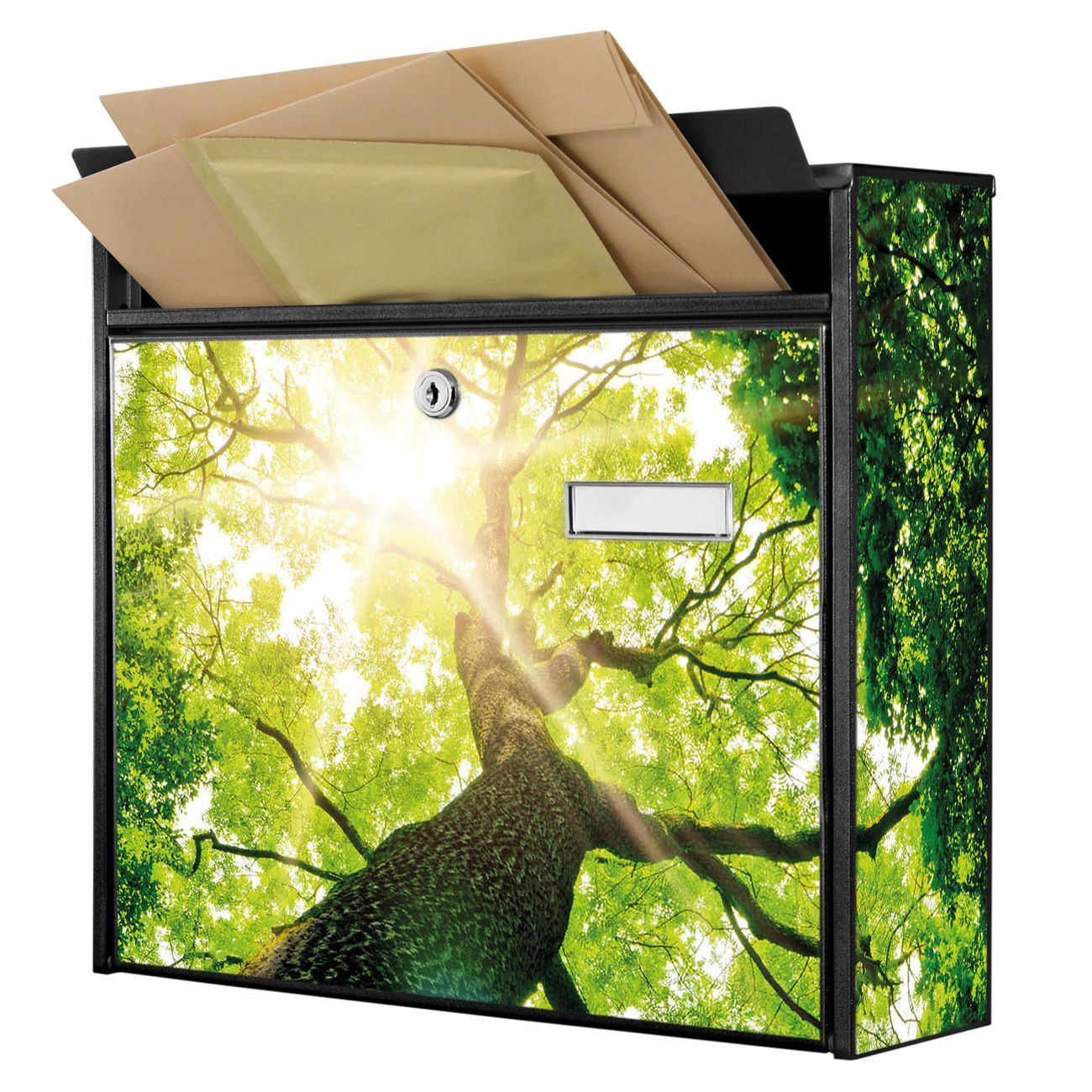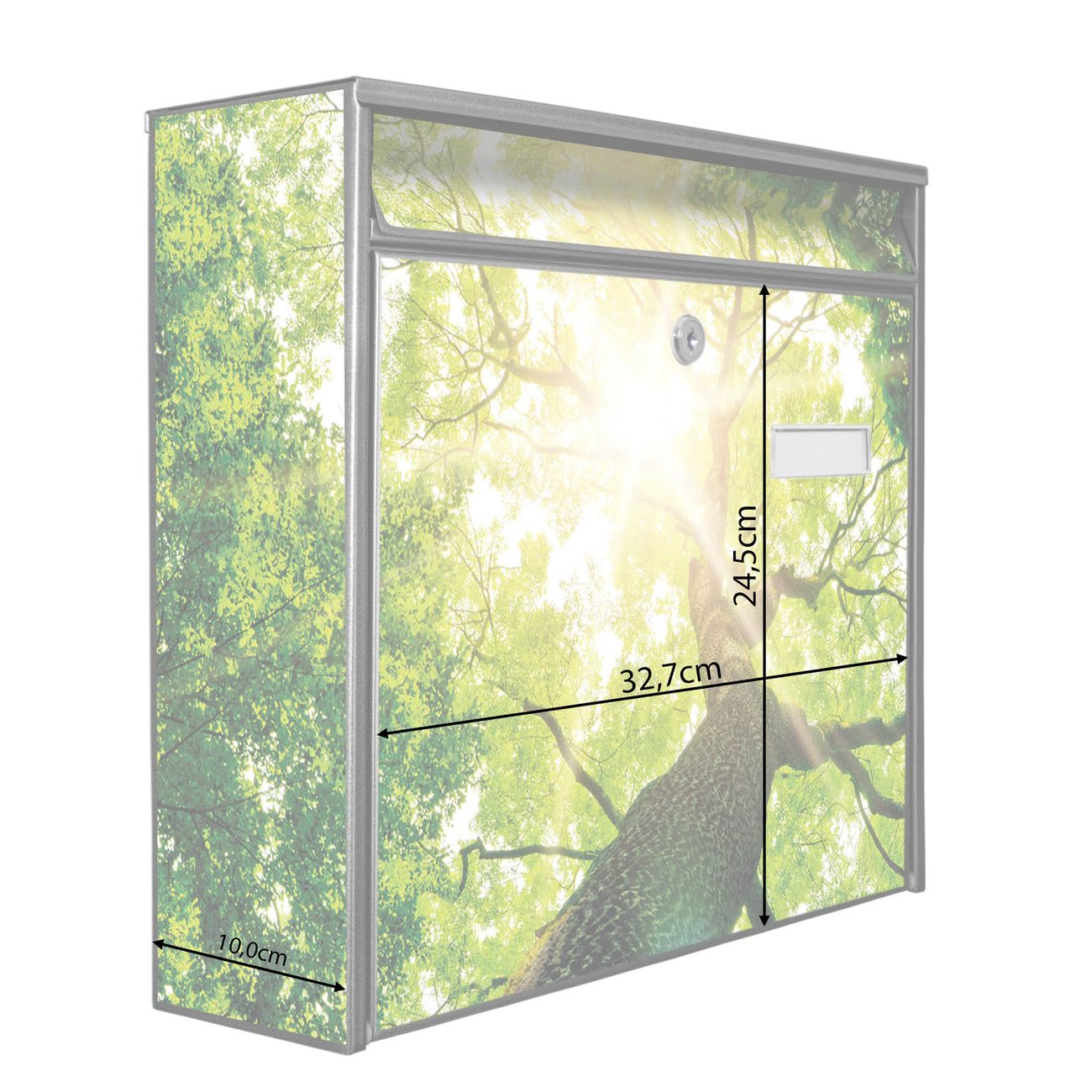 Der Postkasten mit Motiv Baumkrone hat ein sehr ansprechendes und zeitloses Design. Heben Sie Sich von der tristen grauen Masse ab, ohne auf Funktionalität zu verzichten. Die weite Öffnung ohne scharfe Kanten ermöglicht eine einfache Handhabung beim Entnehmen der Post. Die Größe bietet genügend Platz für Sendungen aller Art, der Einwurf fasst auch größere A4 Sendungen. Ihr Burg-Wächter Motivbriefkasten wird in Sachsen in einer kleinen Manufaktur von Hand veredelt. Die Motivfolie ist lösungsmittelfrei und schutzlaminiert, dies sorgt für einen langen Halt. Wir legen großen Wert auf die Verbindung von Funktionalität und Design.