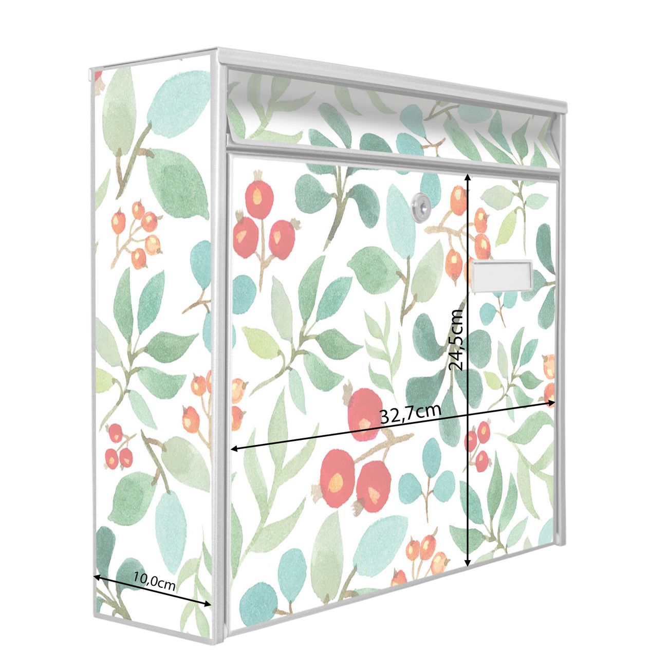 Der Burg Wächter Mail Briefkasten mit Motiv Beeren und Blätter bietet Ihnen mit seinem Fassungsvermögen genügend Platz auch für große A4 Sendungen. Auf Wunsch können Sie bei uns den passenden Standfuß kaufen und so aus dem Wandbriefkasten einen Standbriefkasten machen. Wir bieten Ihnen ebenfalls Namensschilder, bereits beschriftet oder frei zu beschriften, und verschiedene selbst gestaltete Bitte-Keine-Werbung-Aufkleber.