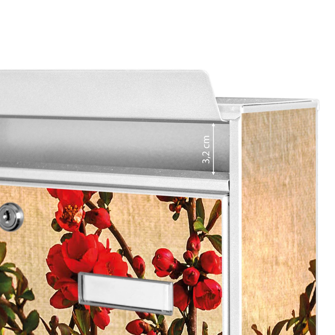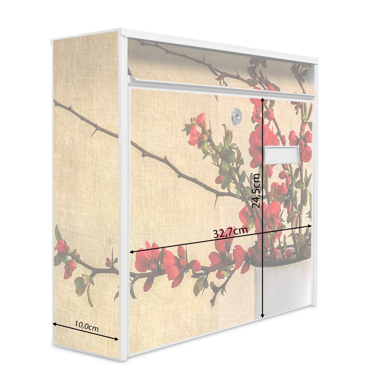 Die Größe des Briefkastens ist 36 x 32 x 10cm (BxHxT) groß. Das Motiv besteht aus einer wetter- und UV-festen Folie, die mit einem Schutzlaminat überzogen ist und Ihren Briefkasten zusätzlich vor Kratzern schützt. Sie erhalten 2 Schlüssel sowie das Montagematerial.