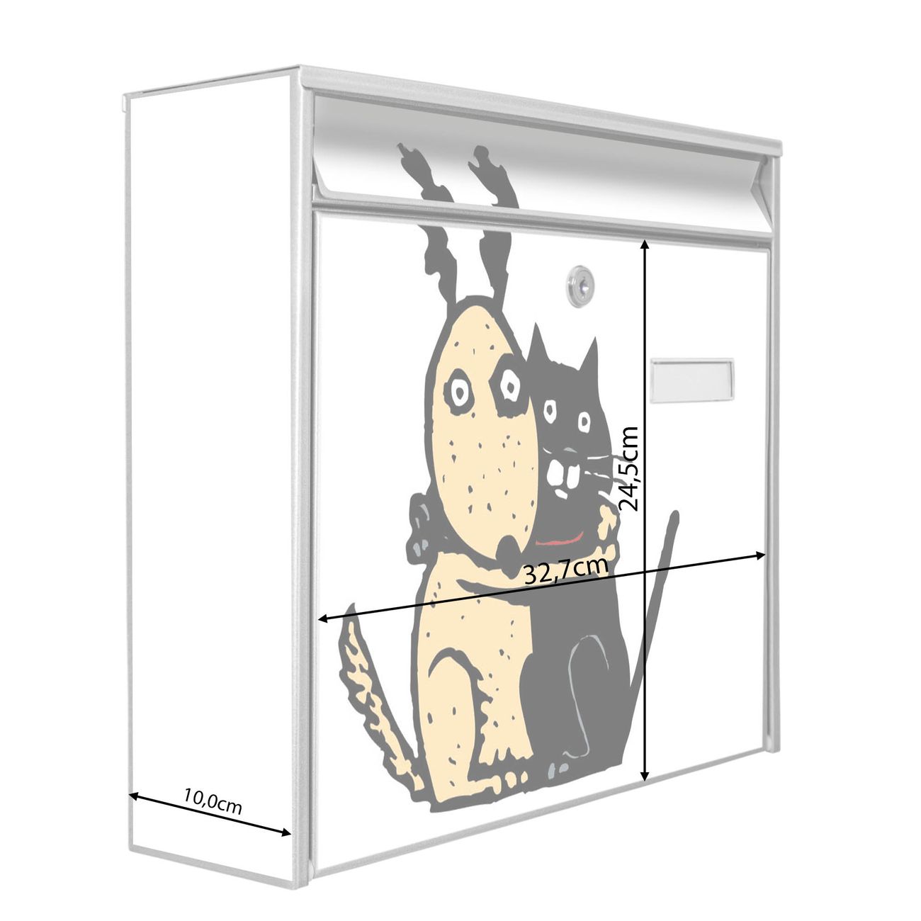 Die Größe des Briefkastens ist 36 x 32 x 10cm (BxHxT) groß. Das Motiv besteht aus einer wetter- und UV-festen Folie, die mit einem Schutzlaminat überzogen ist und Ihren Briefkasten zusätzlich vor Kratzern schützt. Sie erhalten 2 Schlüssel sowie das Montagematerial.
