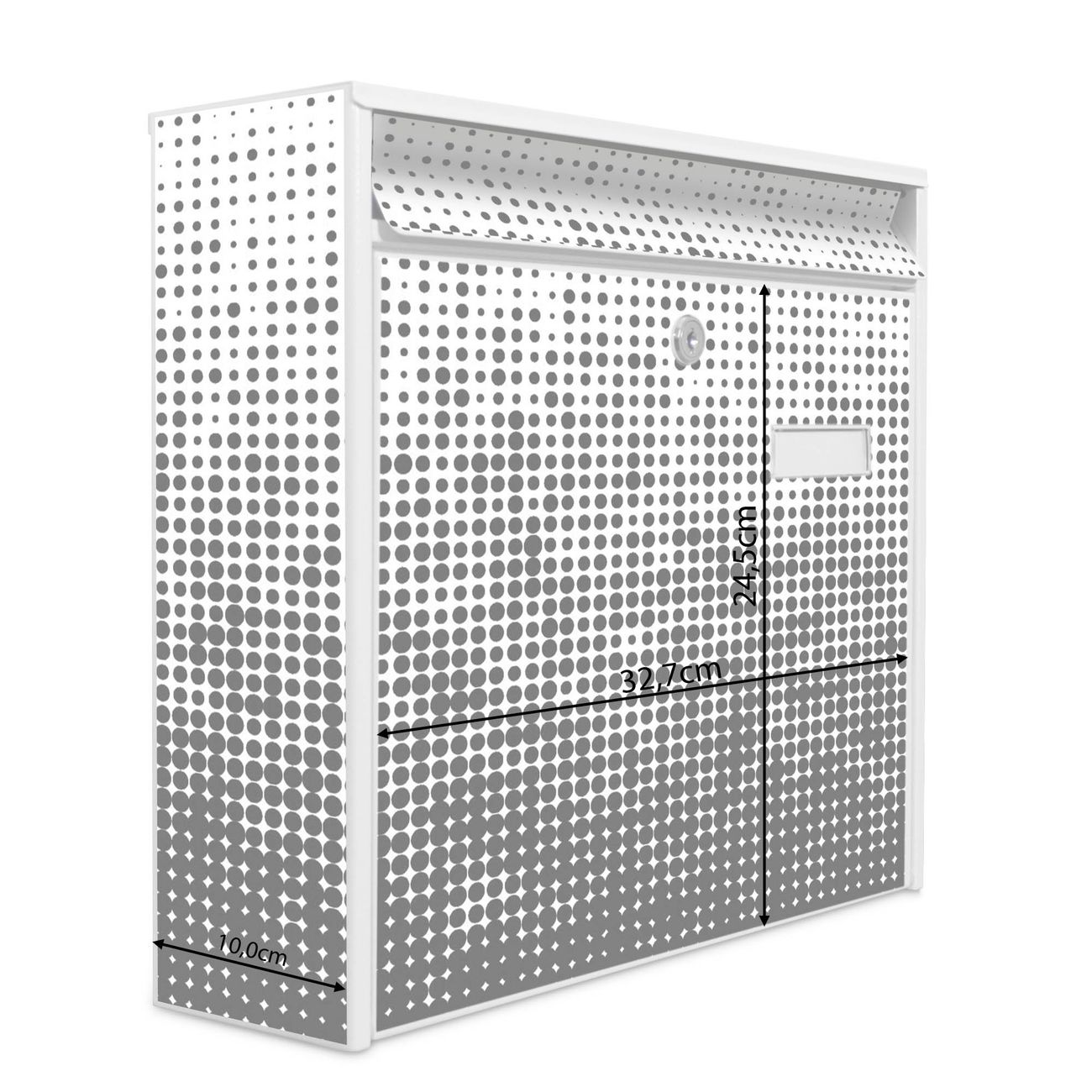 Die Größe des Briefkastens ist 36 x 32 x 10cm (BxHxT) groß. Das Motiv besteht aus einer wetter- und UV-festen Folie, die mit einem Schutzlaminat überzogen ist und Ihren Briefkasten zusätzlich vor Kratzern schützt. Sie erhalten 2 Schlüssel sowie das Montagematerial.
