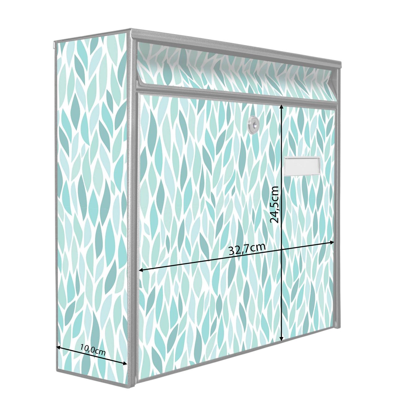 Der Burg Wächter Mail Briefkasten mit Motiv Blätter Mint bietet Ihnen mit seinem Fassungsvermögen genügend Platz auch für große A4 Sendungen. Auf Wunsch können Sie bei uns den passenden Standfuß kaufen und so aus dem Wandbriefkasten einen Standbriefkasten machen. Wir bieten Ihnen ebenfalls Namensschilder, bereits beschriftet oder frei zu beschriften, und verschiedene selbst gestaltete Bitte-Keine-Werbung-Aufkleber.