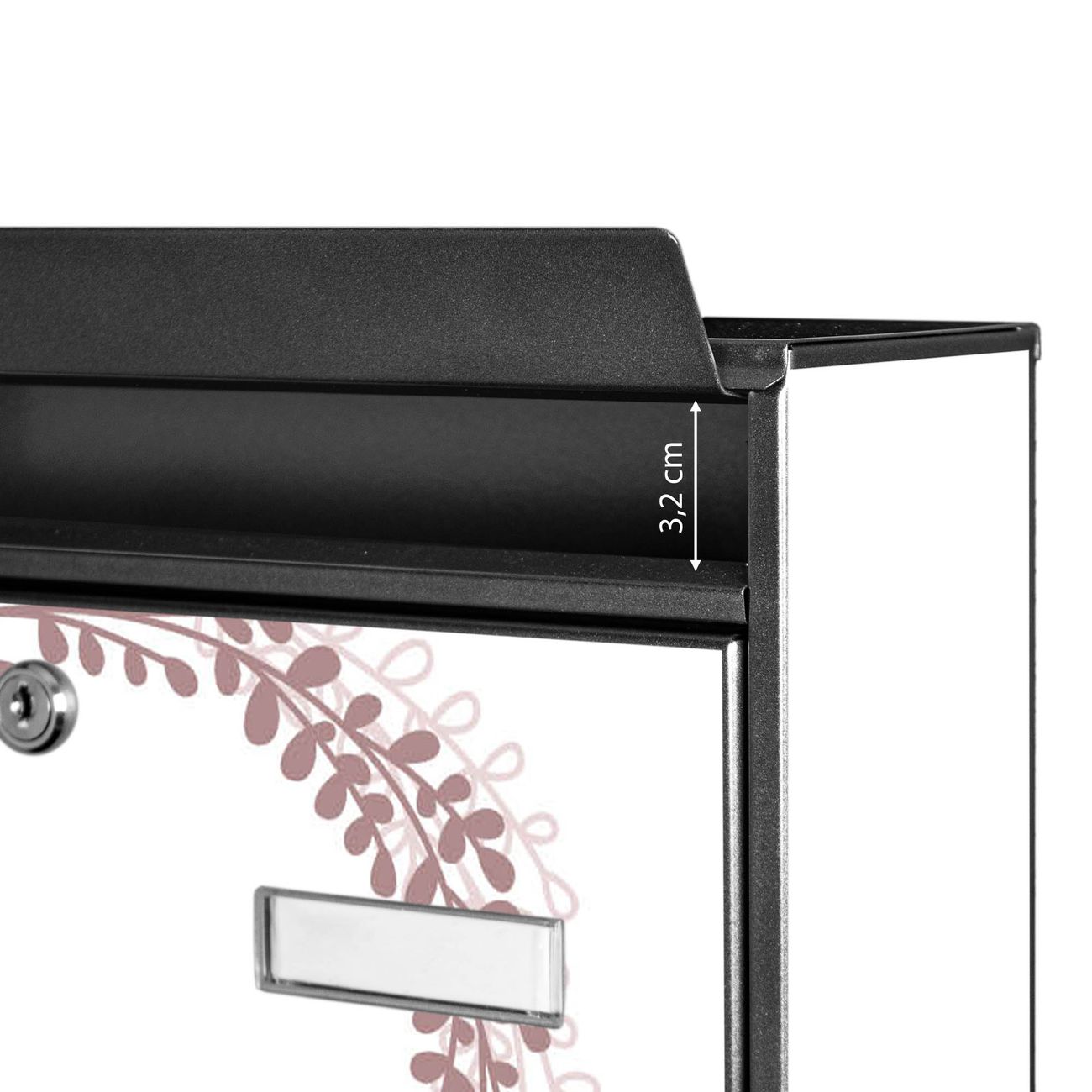 Der Burg Wächter Mail Briefkasten mit Motiv Blätterkranz bietet Ihnen mit seinem Fassungsvermögen genügend Platz auch für große A4 Sendungen. Auf Wunsch können Sie bei uns den passenden Standfuß kaufen und so aus dem Wandbriefkasten einen Standbriefkasten machen. Wir bieten Ihnen ebenfalls Namensschilder, bereits beschriftet oder frei zu beschriften, und verschiedene selbst gestaltete Bitte-Keine-Werbung-Aufkleber.