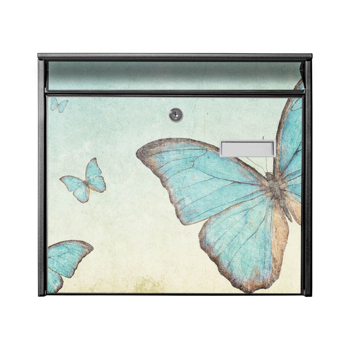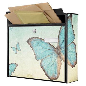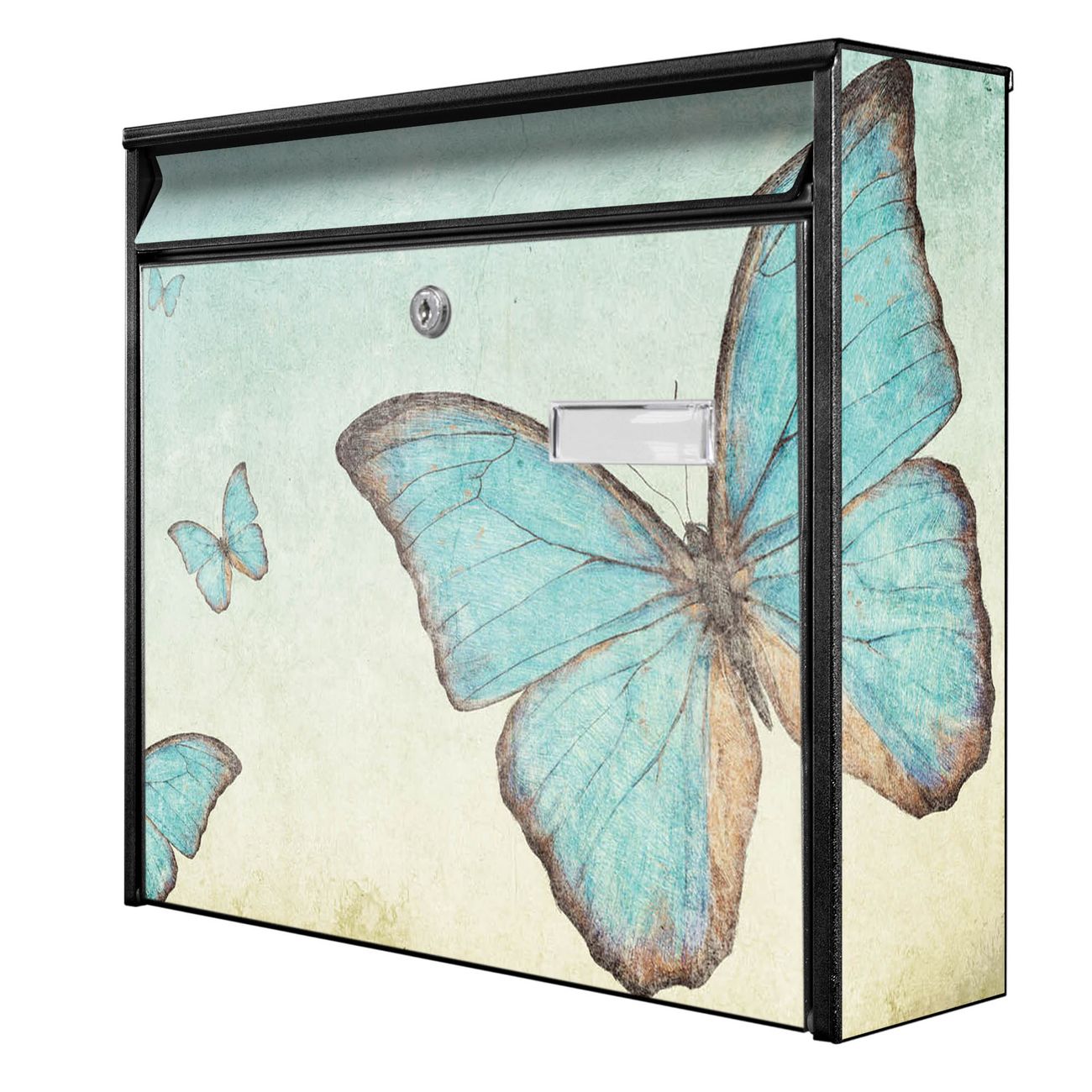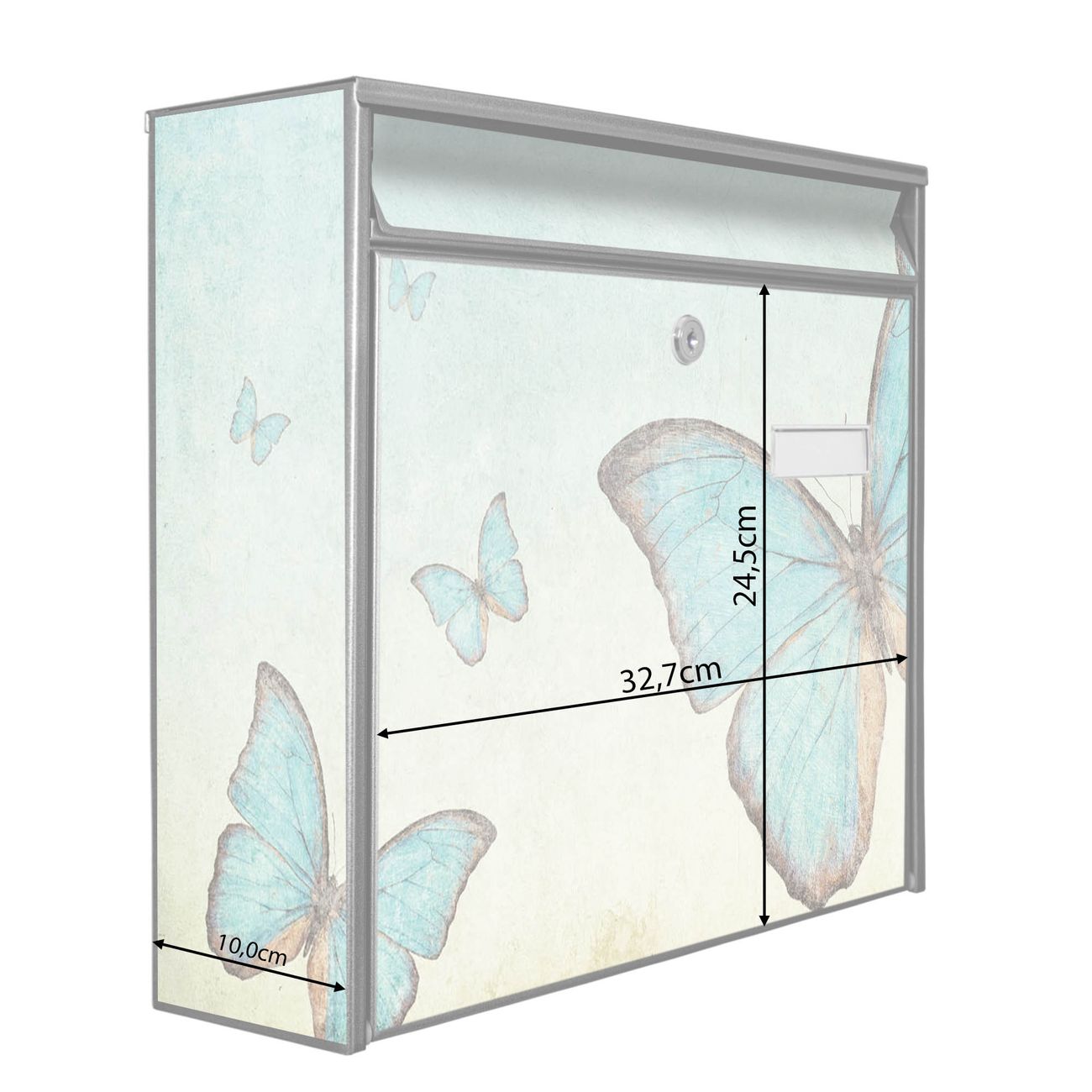 Der Burg Wächter Mail Briefkasten mit Motiv Blaue Schmetterlinge bietet Ihnen mit seinem Fassungsvermögen genügend Platz auch für große A4 Sendungen. Auf Wunsch können Sie bei uns den passenden Standfuß kaufen und so aus dem Wandbriefkasten einen Standbriefkasten machen. Wir bieten Ihnen ebenfalls Namensschilder, bereits beschriftet oder frei zu beschriften, und verschiedene selbst gestaltete Bitte-Keine-Werbung-Aufkleber.
