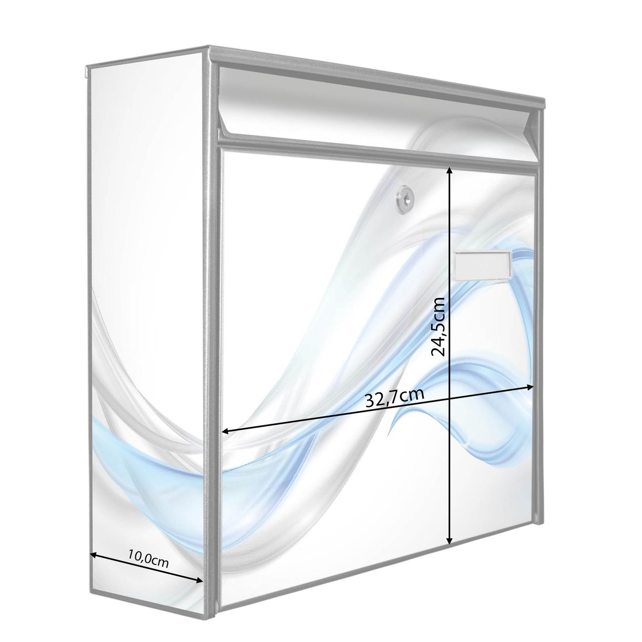 Der Burg Wächter Mail Briefkasten mit Motiv Blauer Schleier bietet Ihnen mit seinem Fassungsvermögen genügend Platz auch für große A4 Sendungen. Auf Wunsch können Sie bei uns den passenden Standfuß kaufen und so aus dem Wandbriefkasten einen Standbriefkasten machen. Wir bieten Ihnen ebenfalls Namensschilder, bereits beschriftet oder frei zu beschriften, und verschiedene selbst gestaltete Bitte-Keine-Werbung-Aufkleber.