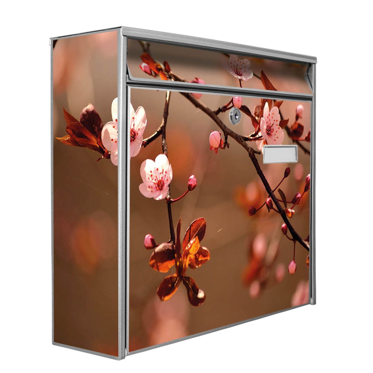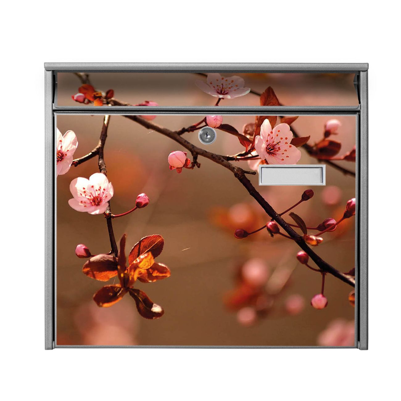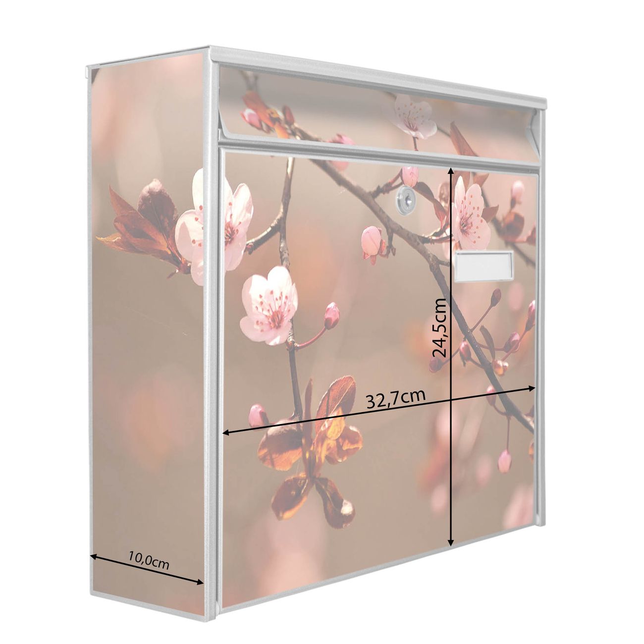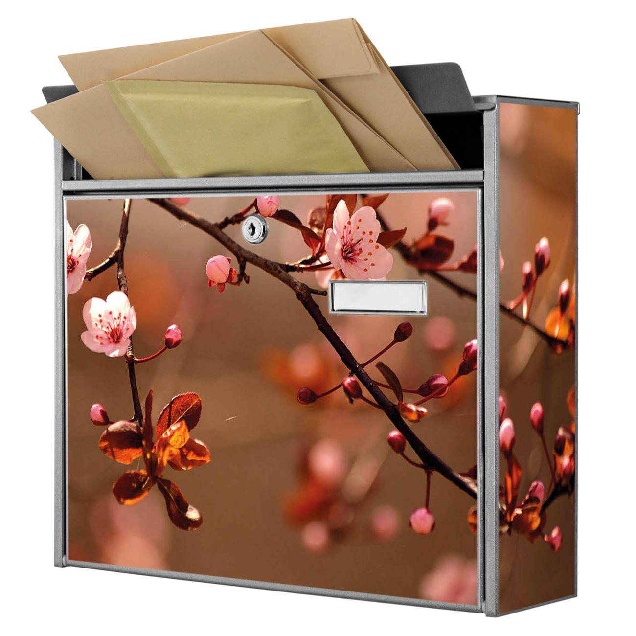 Der Burg Wächter Mail Briefkasten mit Motiv Blühender Kirschzweig bietet Ihnen mit seinem Fassungsvermögen genügend Platz auch für große A4 Sendungen. Auf Wunsch können Sie bei uns den passenden Standfuß kaufen und so aus dem Wandbriefkasten einen Standbriefkasten machen. Wir bieten Ihnen ebenfalls Namensschilder, bereits beschriftet oder frei zu beschriften, und verschiedene selbst gestaltete Bitte-Keine-Werbung-Aufkleber.