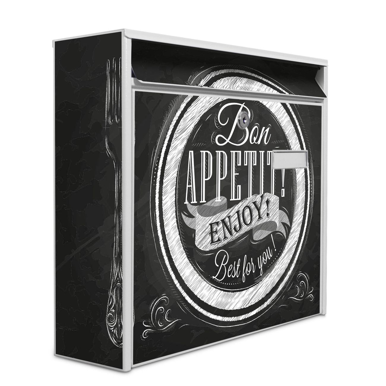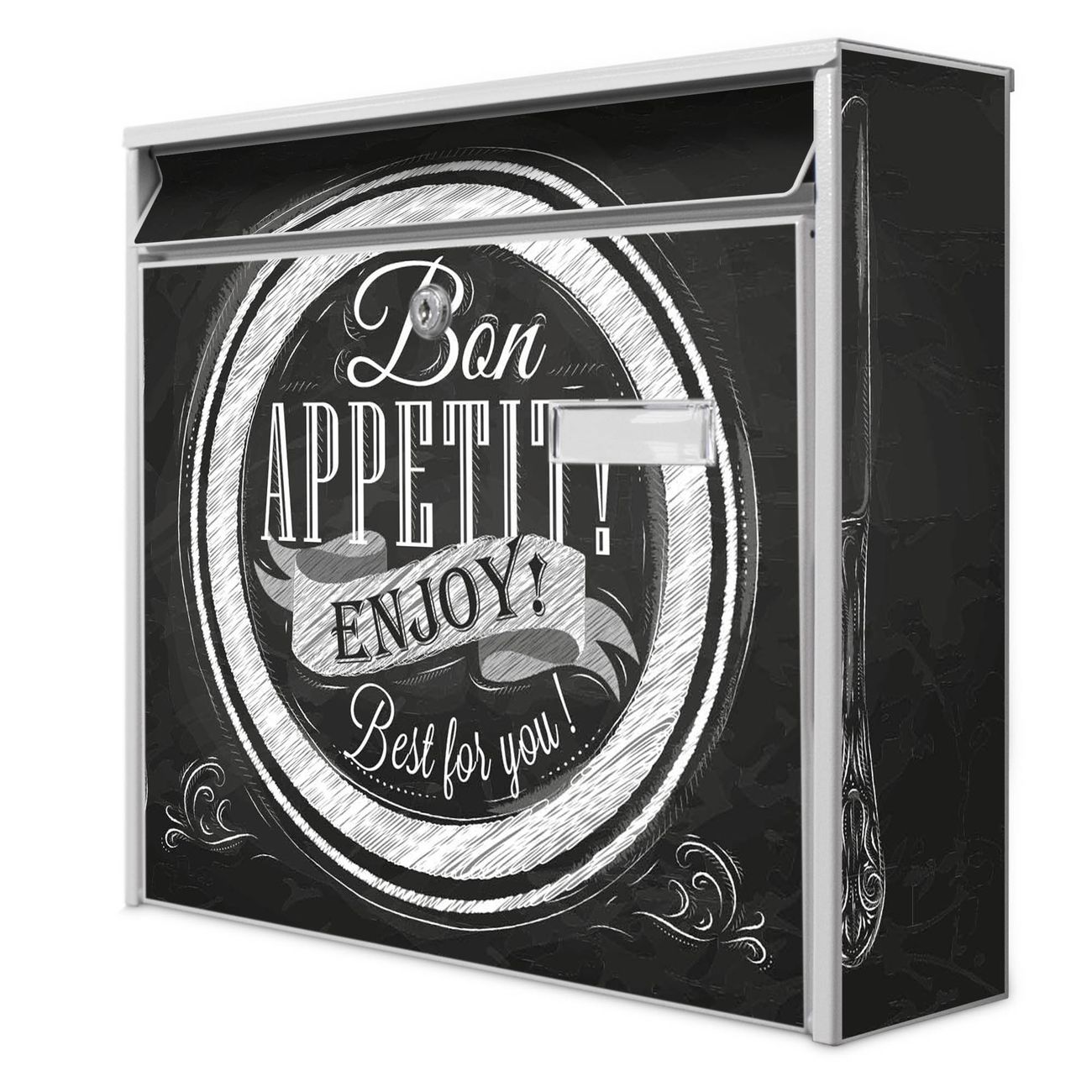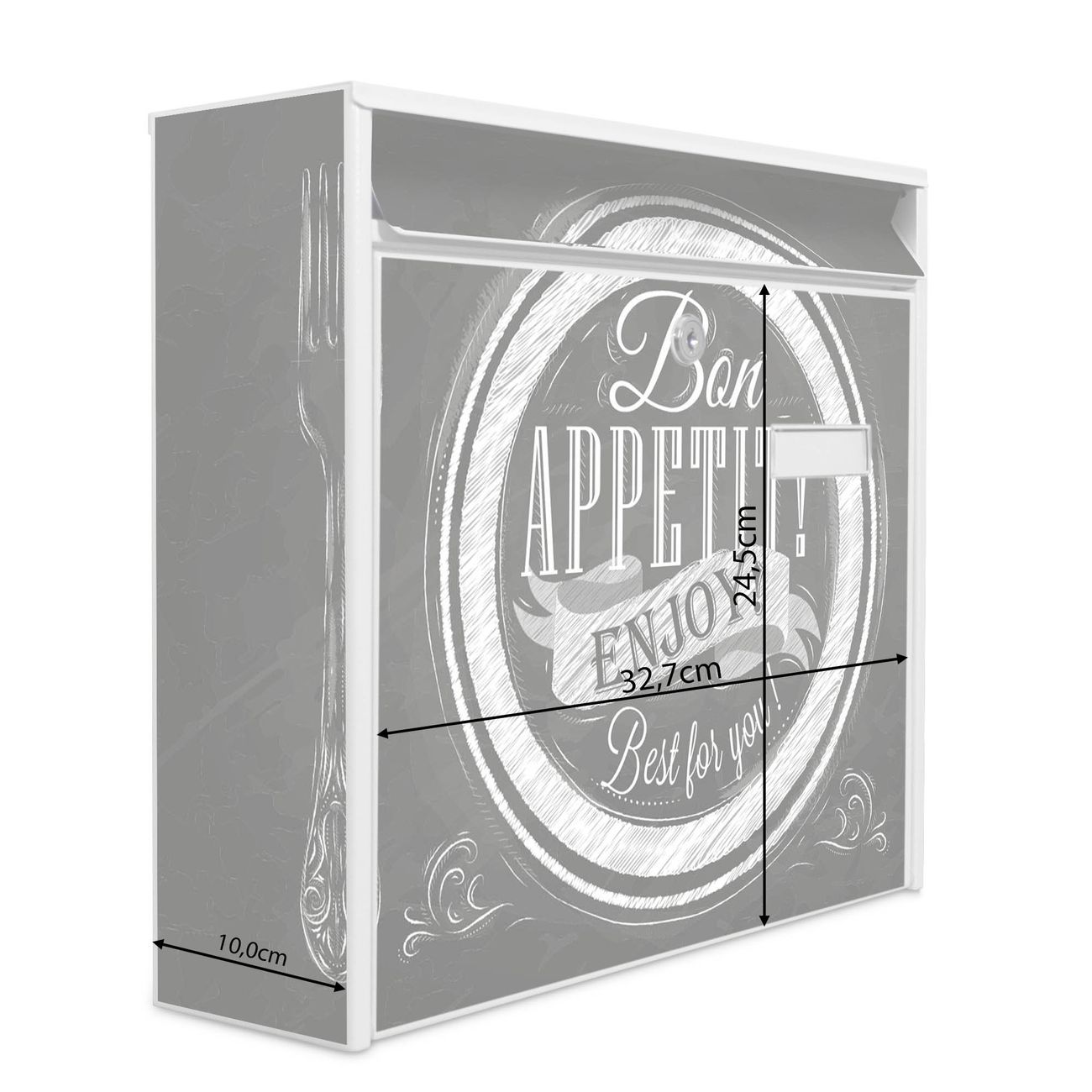 Der Postkasten mit Motiv Bon Appetit hat ein sehr ansprechendes und zeitloses Design. Heben Sie Sich von der tristen grauen Masse ab, ohne auf Funktionalität zu verzichten. Die weite Öffnung ohne scharfe Kanten ermöglicht eine einfache Handhabung beim Entnehmen der Post. Die Größe bietet genügend Platz für Sendungen aller Art, der Einwurf fasst auch größere A4 Sendungen. Ihr Burg-Wächter Motivbriefkasten wird in Sachsen in einer kleinen Manufaktur von Hand veredelt. Die Motivfolie ist lösungsmittelfrei und schutzlaminiert, dies sorgt für einen langen Halt. Wir legen großen Wert auf die Verbindung von Funktionalität und Design.
