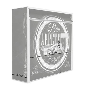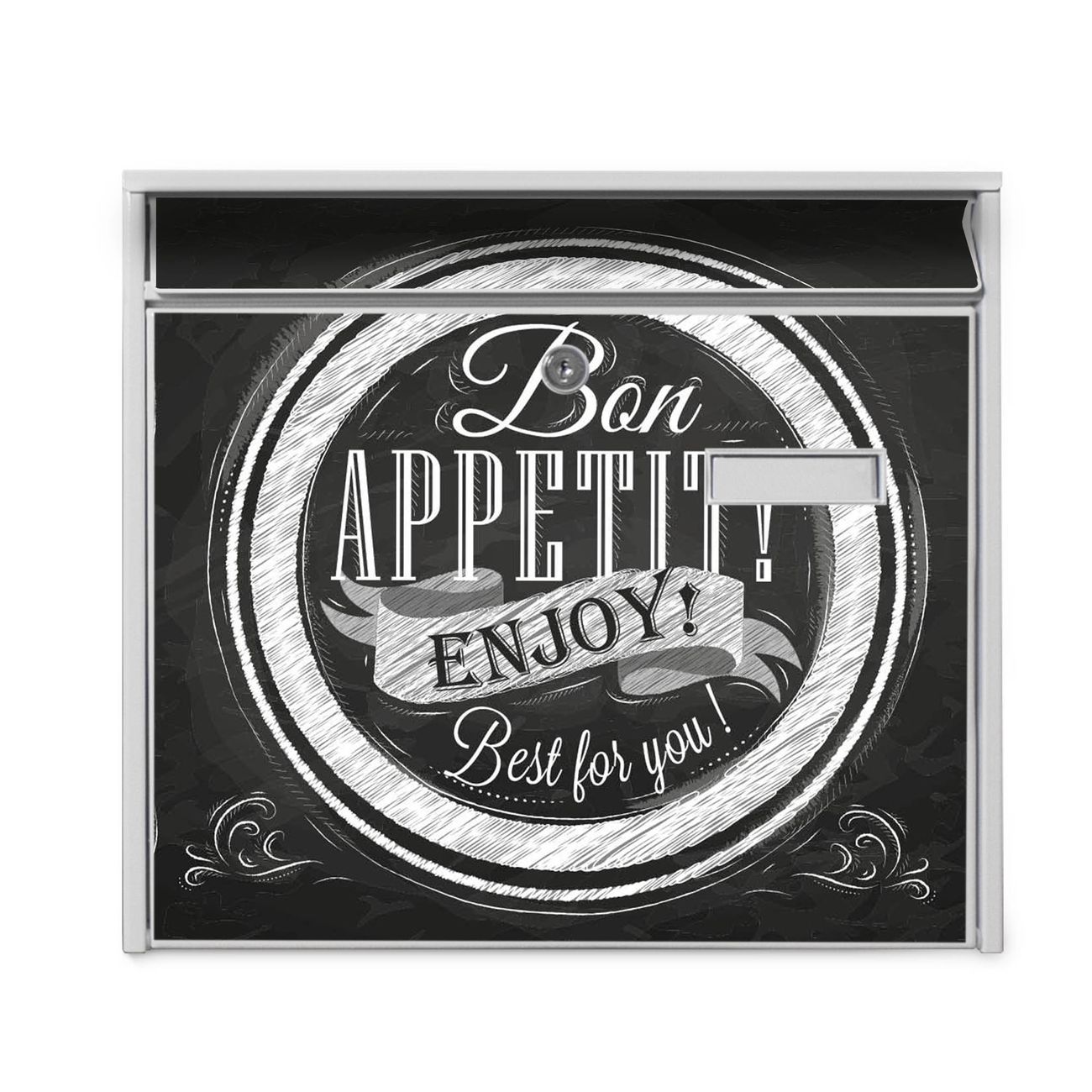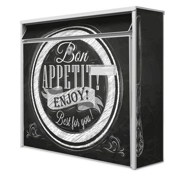 Der Burg Wächter Mail Briefkasten mit Motiv Bon Appetit bietet Ihnen mit seinem Fassungsvermögen genügend Platz auch für große A4 Sendungen. Auf Wunsch können Sie bei uns den passenden Standfuß kaufen und so aus dem Wandbriefkasten einen Standbriefkasten machen. Wir bieten Ihnen ebenfalls Namensschilder, bereits beschriftet oder frei zu beschriften, und verschiedene selbst gestaltete Bitte-Keine-Werbung-Aufkleber.