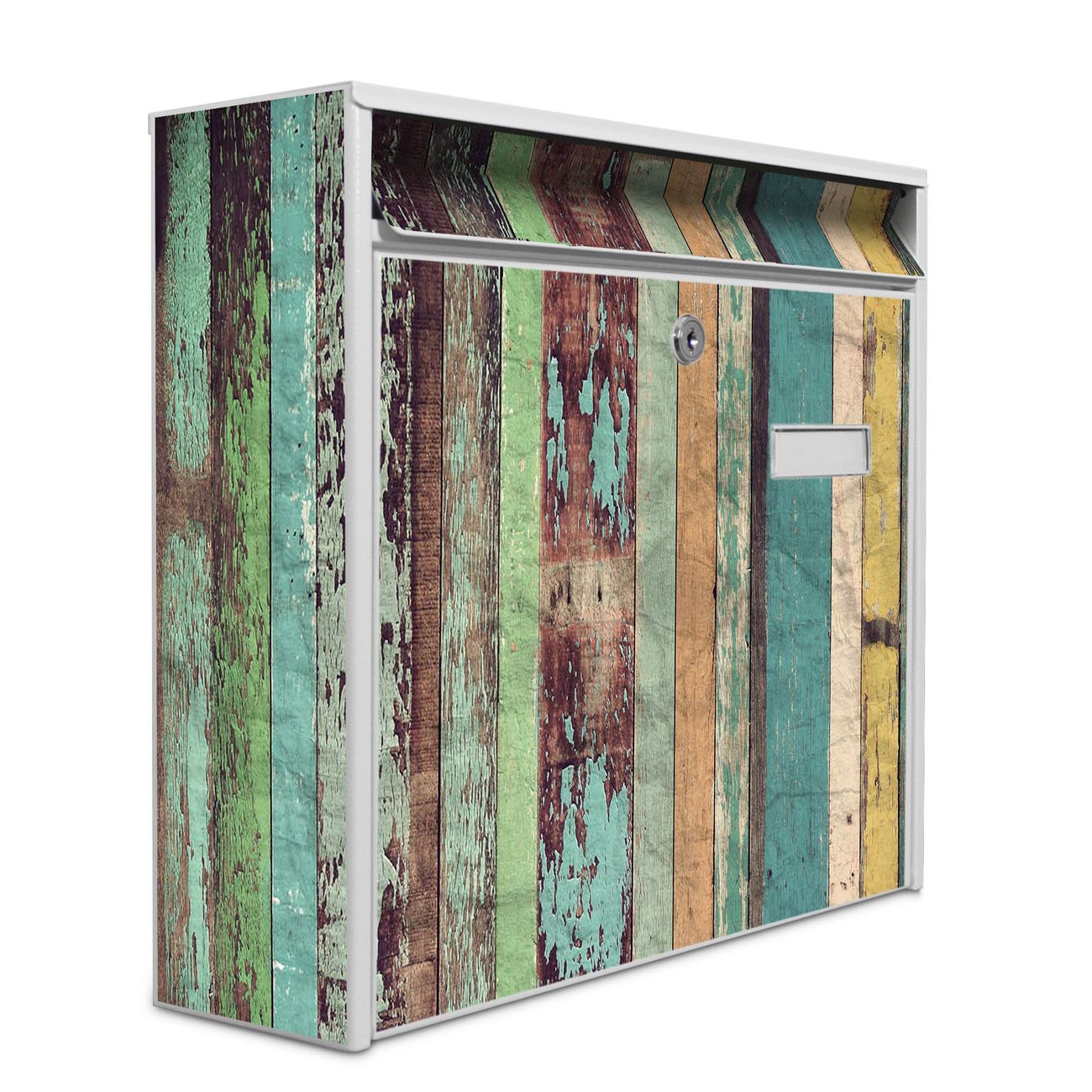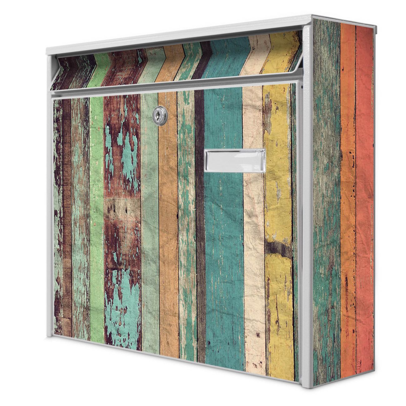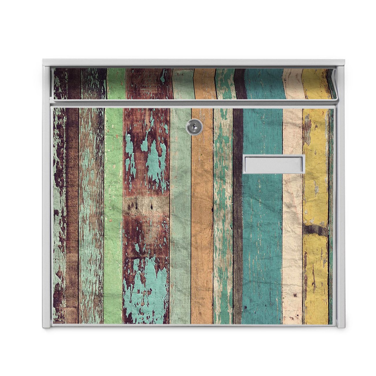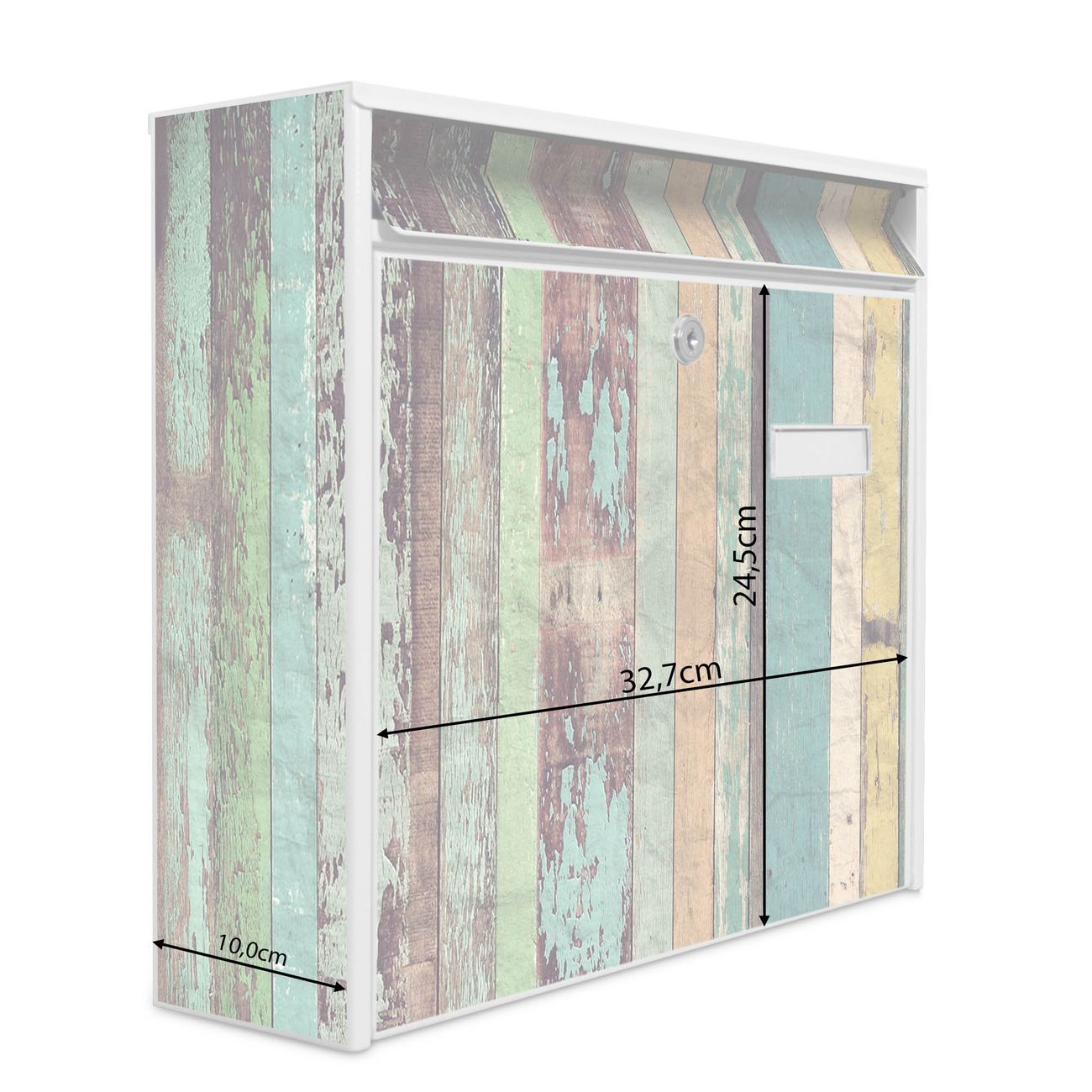 Der Burg Wächter Mail Briefkasten mit Motiv Bunte Bretterwand bietet Ihnen mit seinem Fassungsvermögen genügend Platz auch für große A4 Sendungen. Auf Wunsch können Sie bei uns den passenden Standfuß kaufen und so aus dem Wandbriefkasten einen Standbriefkasten machen. Wir bieten Ihnen ebenfalls Namensschilder, bereits beschriftet oder frei zu beschriften, und verschiedene selbst gestaltete Bitte-Keine-Werbung-Aufkleber.