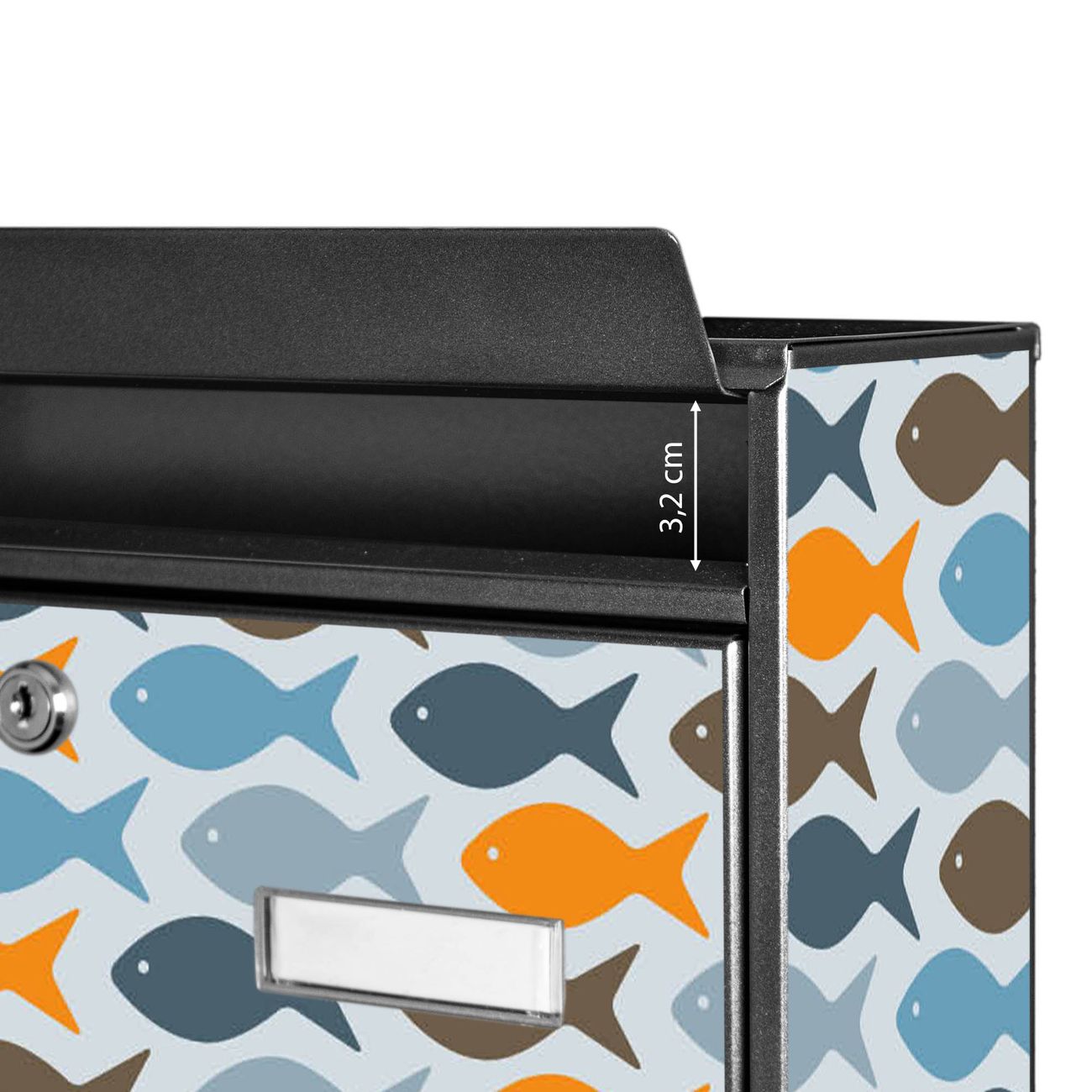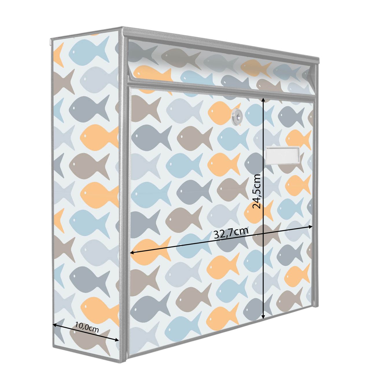Der Burg Wächter Mail Briefkasten mit Motiv Bunte Fische bietet Ihnen mit seinem Fassungsvermögen genügend Platz auch für große A4 Sendungen. Auf Wunsch können Sie bei uns den passenden Standfuß kaufen und so aus dem Wandbriefkasten einen Standbriefkasten machen. Wir bieten Ihnen ebenfalls Namensschilder, bereits beschriftet oder frei zu beschriften, und verschiedene selbst gestaltete Bitte-Keine-Werbung-Aufkleber.