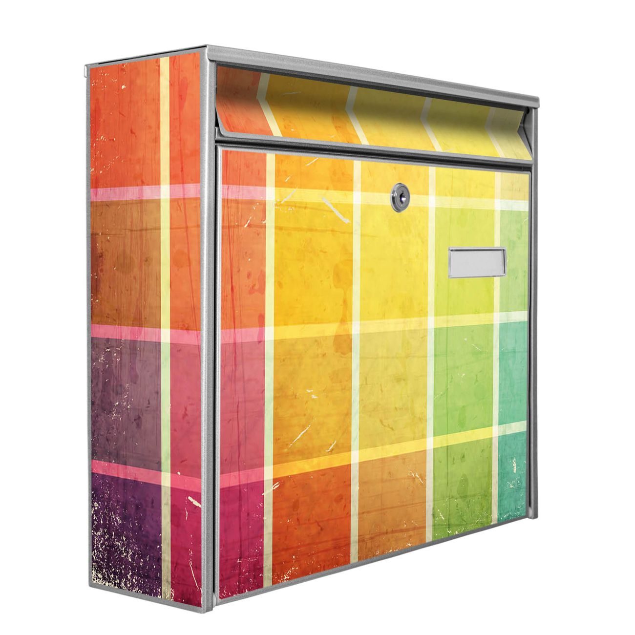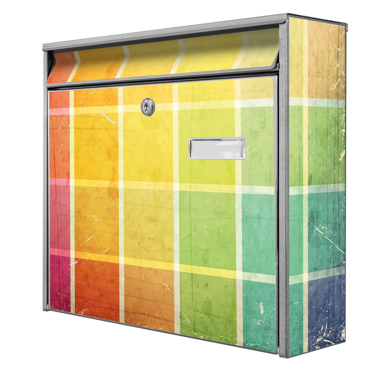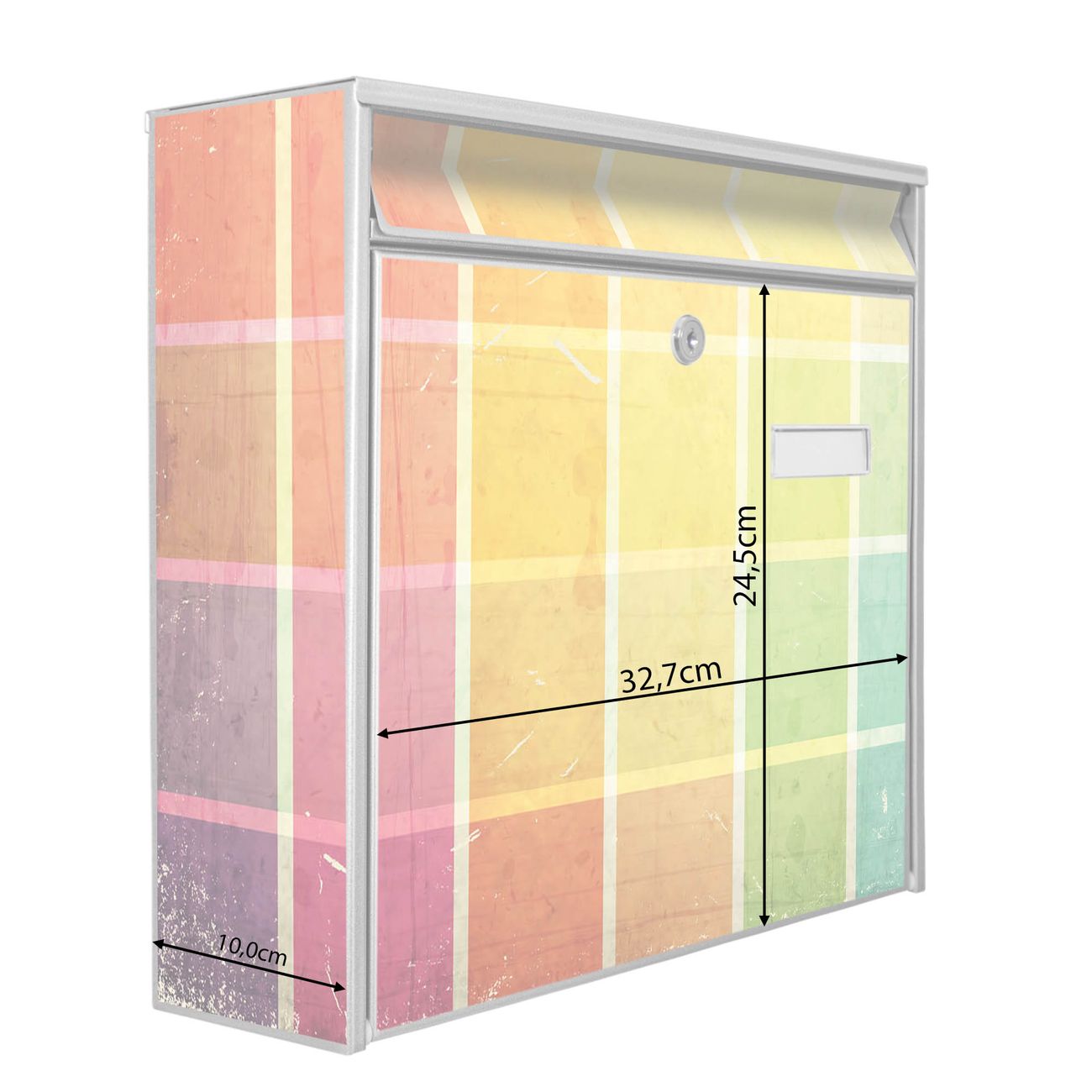 Die Größe des Briefkastens ist 36 x 32 x 10cm (BxHxT) groß. Das Motiv besteht aus einer wetter- und UV-festen Folie, die mit einem Schutzlaminat überzogen ist und Ihren Briefkasten zusätzlich vor Kratzern schützt. Sie erhalten 2 Schlüssel sowie das Montagematerial.