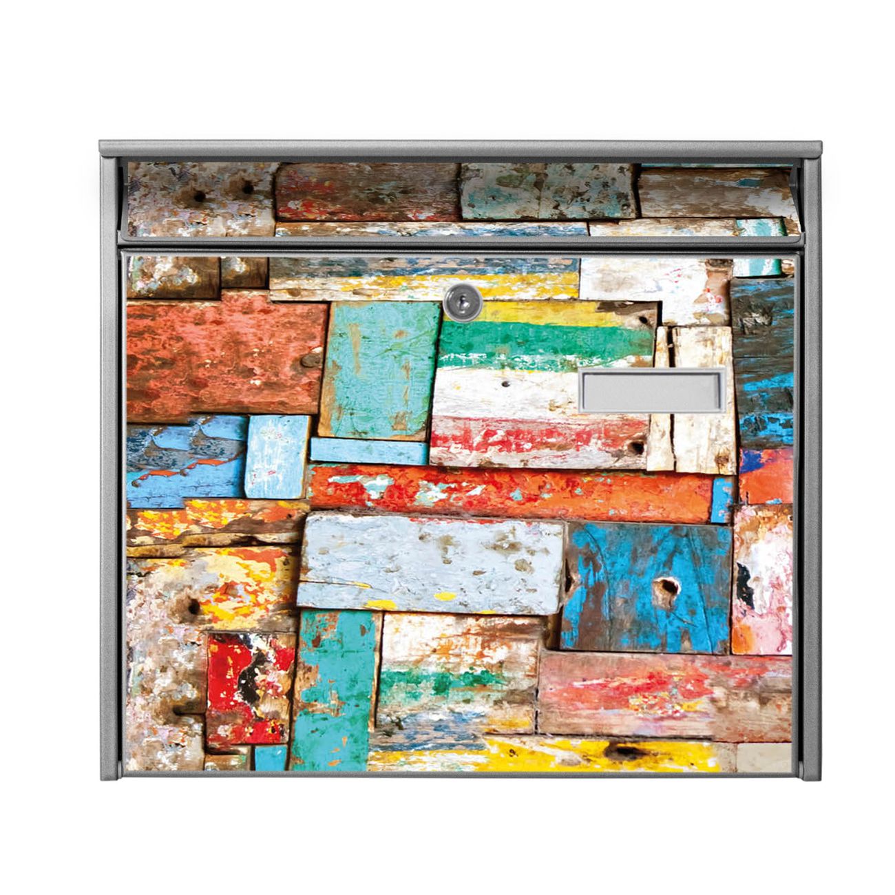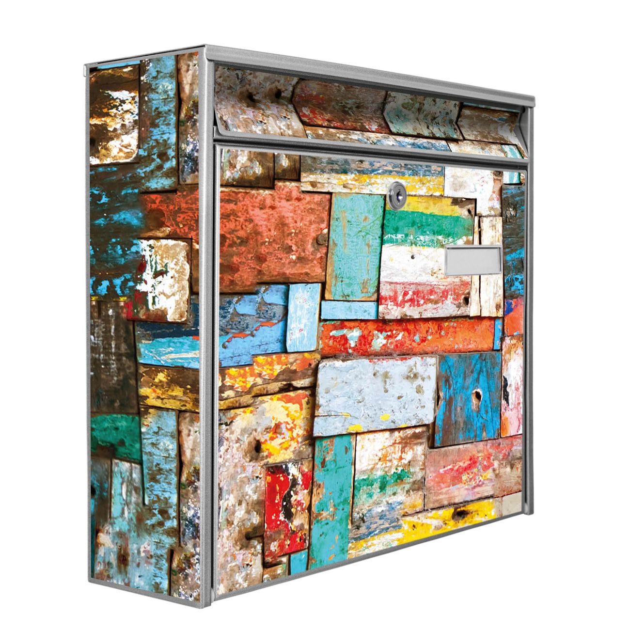 Der Burg Wächter Mail Briefkasten mit Motiv Bunte Holzschindeln bietet Ihnen mit seinem Fassungsvermögen genügend Platz auch für große A4 Sendungen. Auf Wunsch können Sie bei uns den passenden Standfuß kaufen und so aus dem Wandbriefkasten einen Standbriefkasten machen. Wir bieten Ihnen ebenfalls Namensschilder, bereits beschriftet oder frei zu beschriften, und verschiedene selbst gestaltete Bitte-Keine-Werbung-Aufkleber.