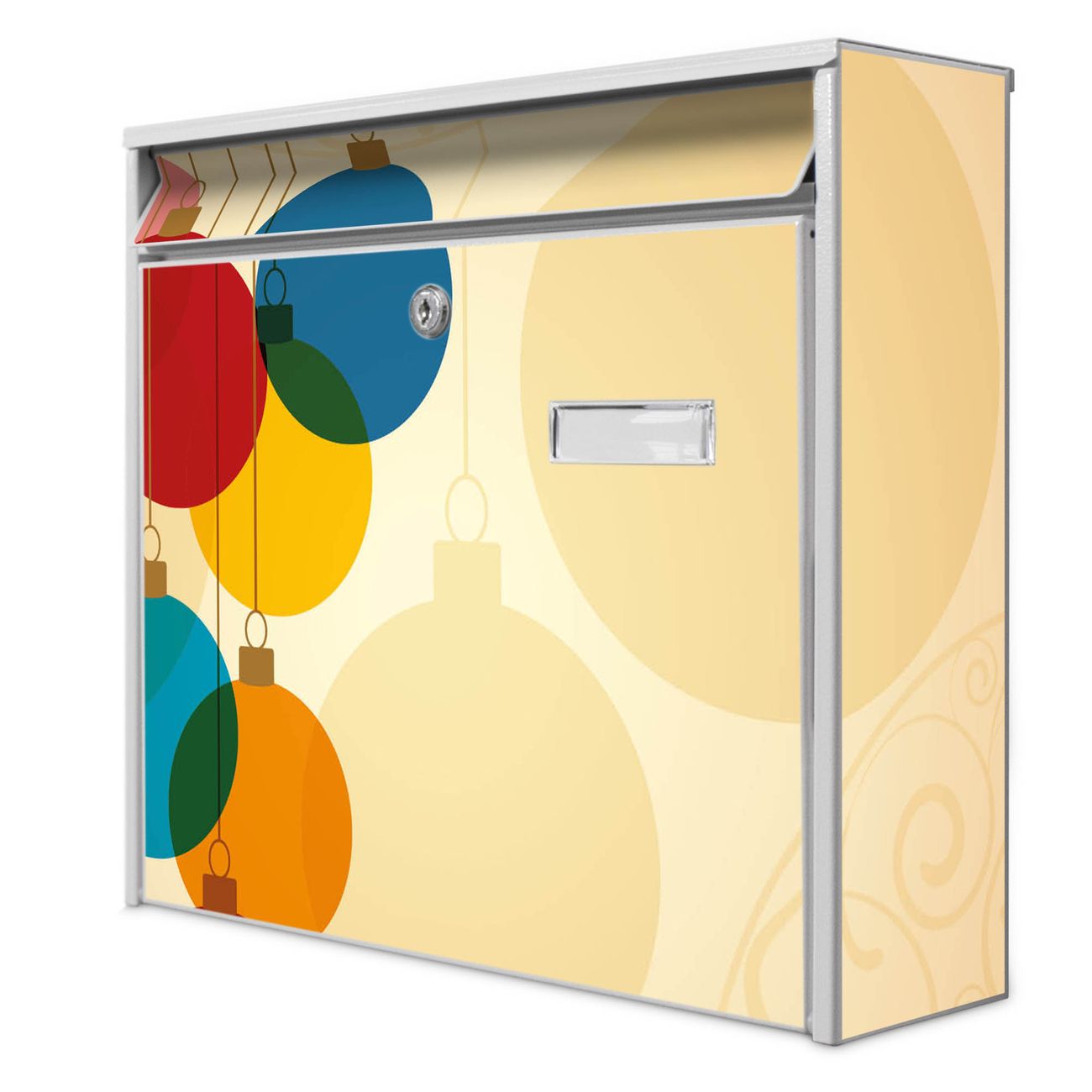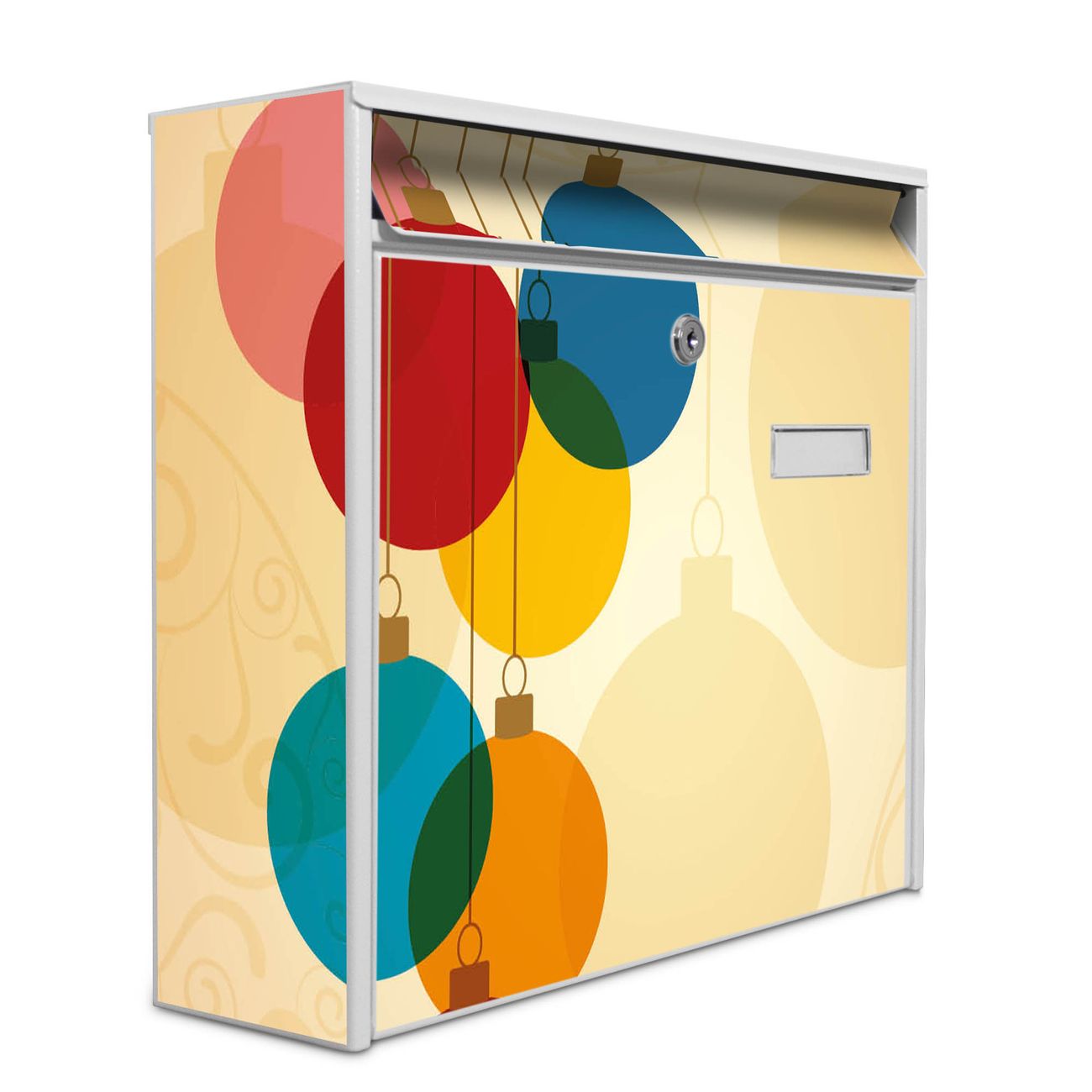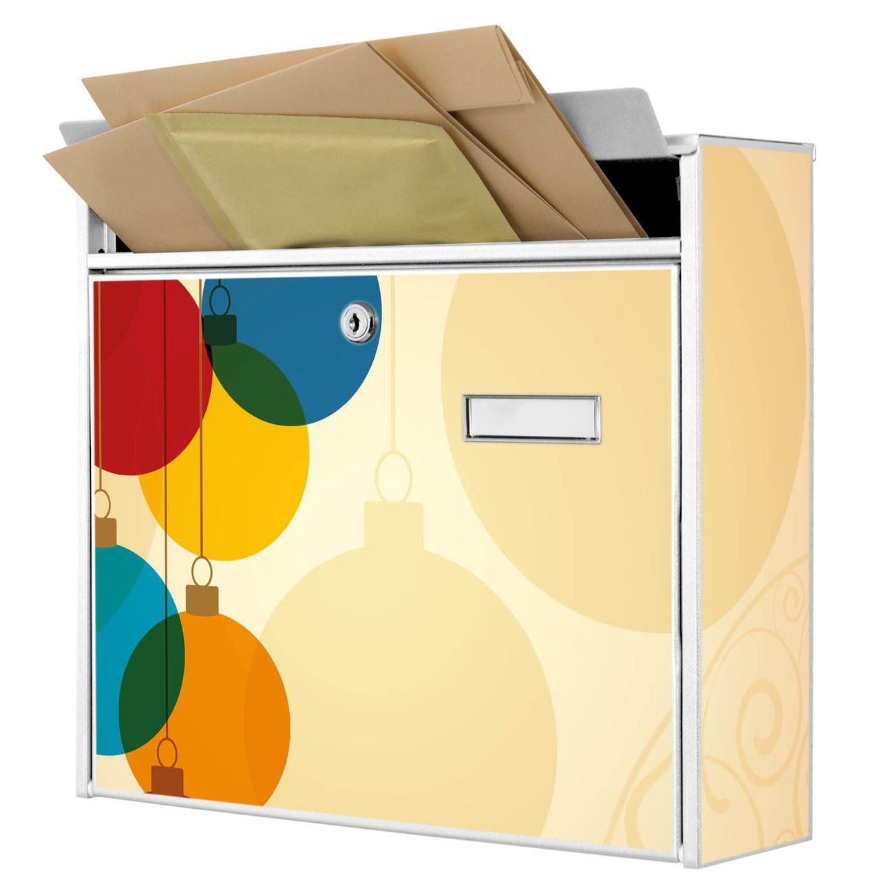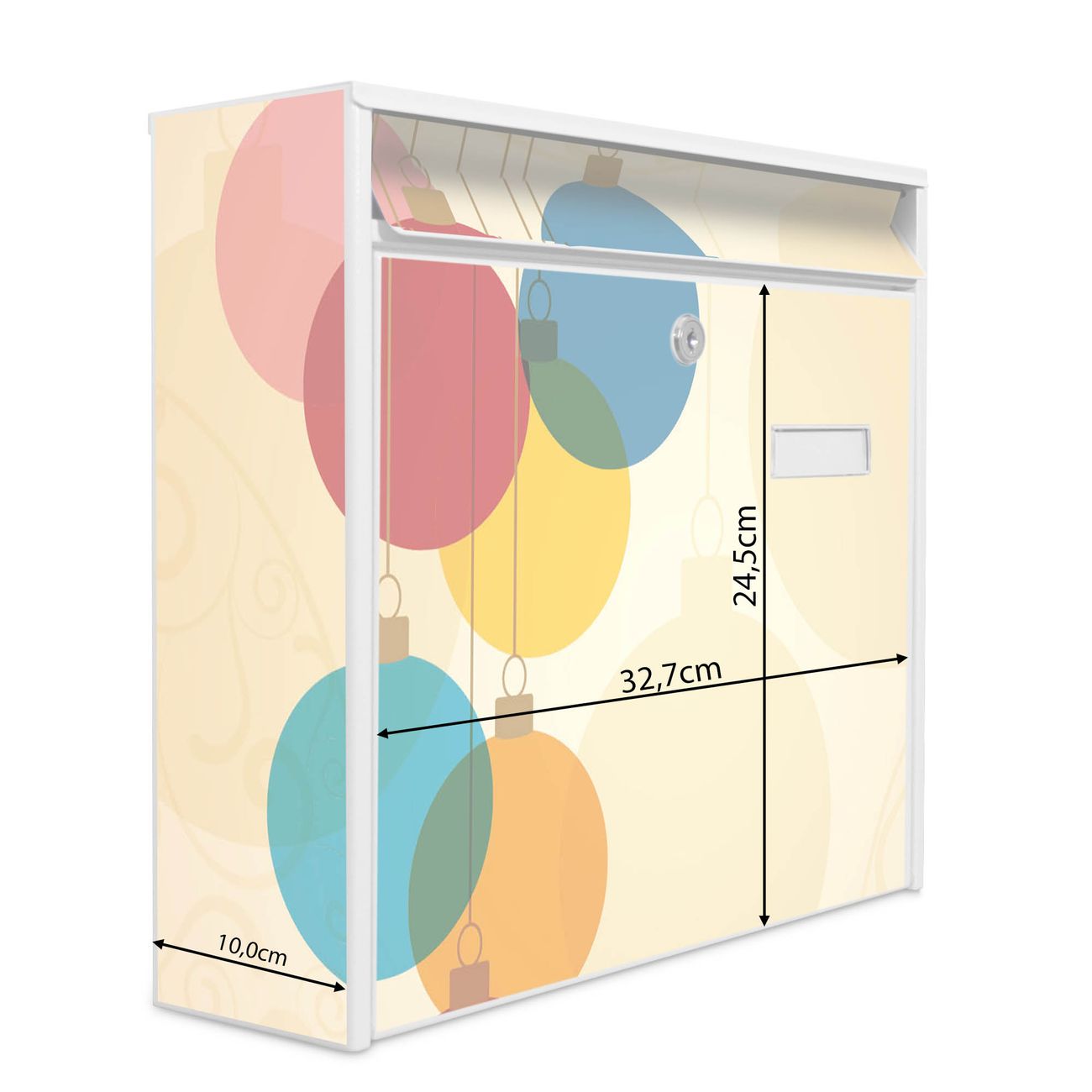 Der Burg Wächter Mail Briefkasten mit Motiv Bunte Kugeln bietet Ihnen mit seinem Fassungsvermögen genügend Platz auch für große A4 Sendungen. Auf Wunsch können Sie bei uns den passenden Standfuß kaufen und so aus dem Wandbriefkasten einen Standbriefkasten machen. Wir bieten Ihnen ebenfalls Namensschilder, bereits beschriftet oder frei zu beschriften, und verschiedene selbst gestaltete Bitte-Keine-Werbung-Aufkleber.