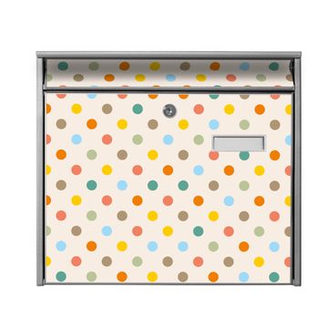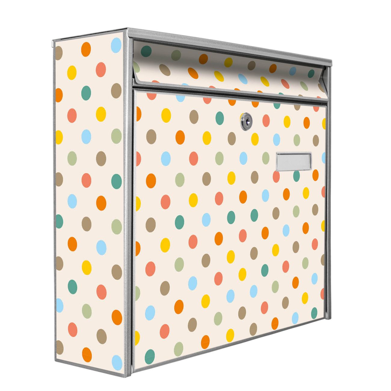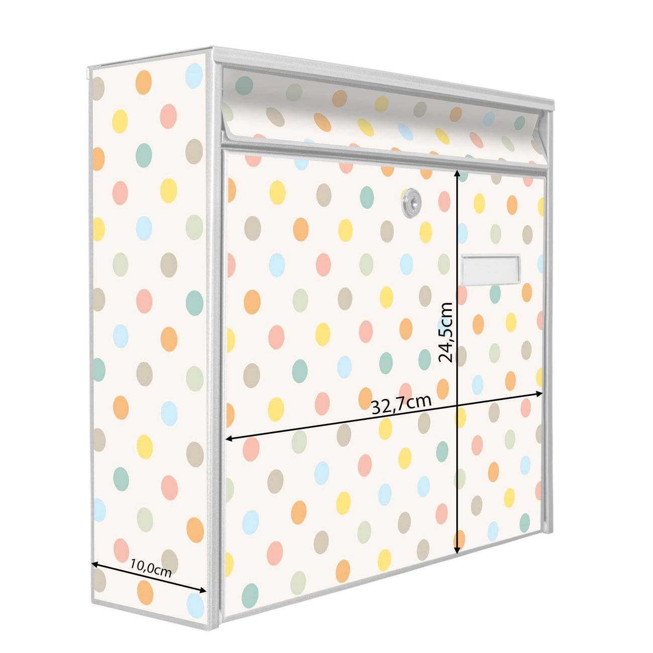 Der Burg Wächter Mail Briefkasten mit Motiv Bunte Punkte bietet Ihnen mit seinem Fassungsvermögen genügend Platz auch für große A4 Sendungen. Auf Wunsch können Sie bei uns den passenden Standfuß kaufen und so aus dem Wandbriefkasten einen Standbriefkasten machen. Wir bieten Ihnen ebenfalls Namensschilder, bereits beschriftet oder frei zu beschriften, und verschiedene selbst gestaltete Bitte-Keine-Werbung-Aufkleber.
