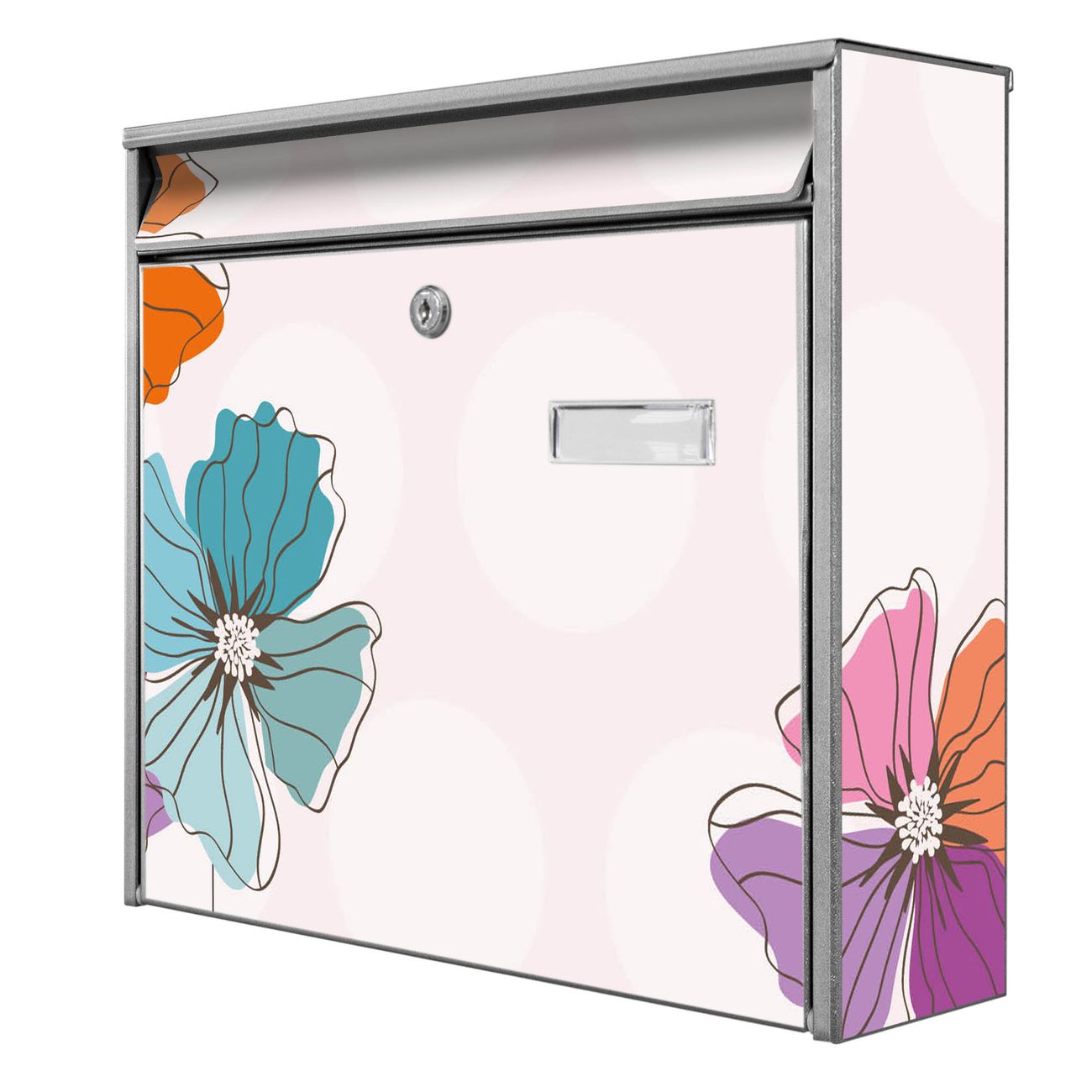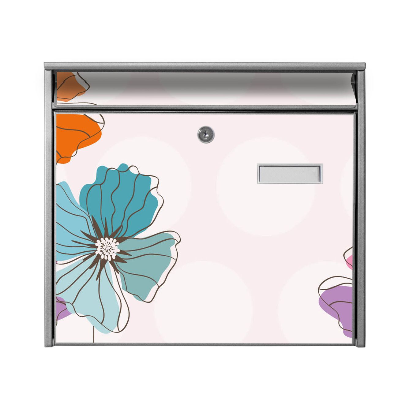 Der Burg Wächter Mail Briefkasten mit Motiv Bunter Mohn bietet Ihnen mit seinem Fassungsvermögen genügend Platz auch für große A4 Sendungen. Auf Wunsch können Sie bei uns den passenden Standfuß kaufen und so aus dem Wandbriefkasten einen Standbriefkasten machen. Wir bieten Ihnen ebenfalls Namensschilder, bereits beschriftet oder frei zu beschriften, und verschiedene selbst gestaltete Bitte-Keine-Werbung-Aufkleber.