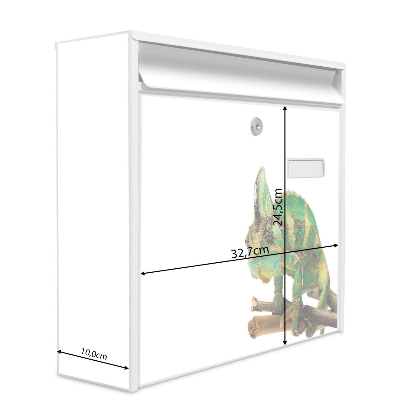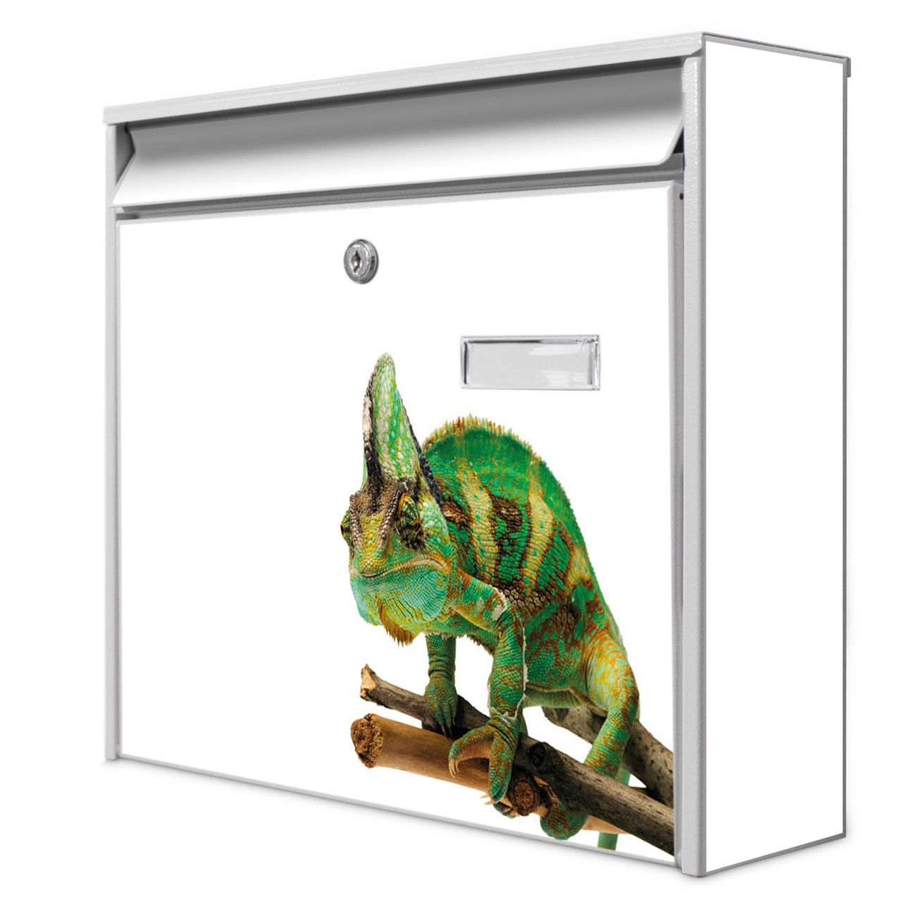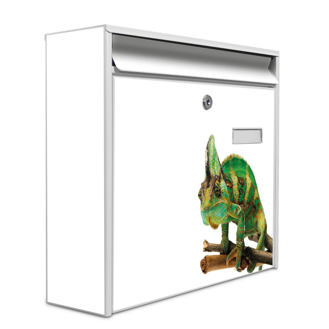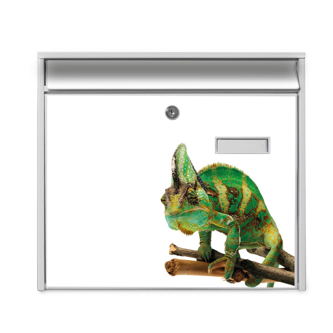 Der Burg Wächter Mail Briefkasten mit Motiv Chamäleon bietet Ihnen mit seinem Fassungsvermögen genügend Platz auch für große A4 Sendungen. Auf Wunsch können Sie bei uns den passenden Standfuß kaufen und so aus dem Wandbriefkasten einen Standbriefkasten machen. Wir bieten Ihnen ebenfalls Namensschilder, bereits beschriftet oder frei zu beschriften, und verschiedene selbst gestaltete Bitte-Keine-Werbung-Aufkleber.