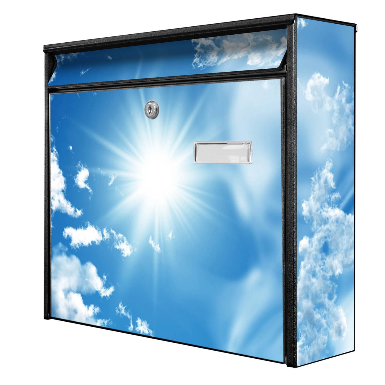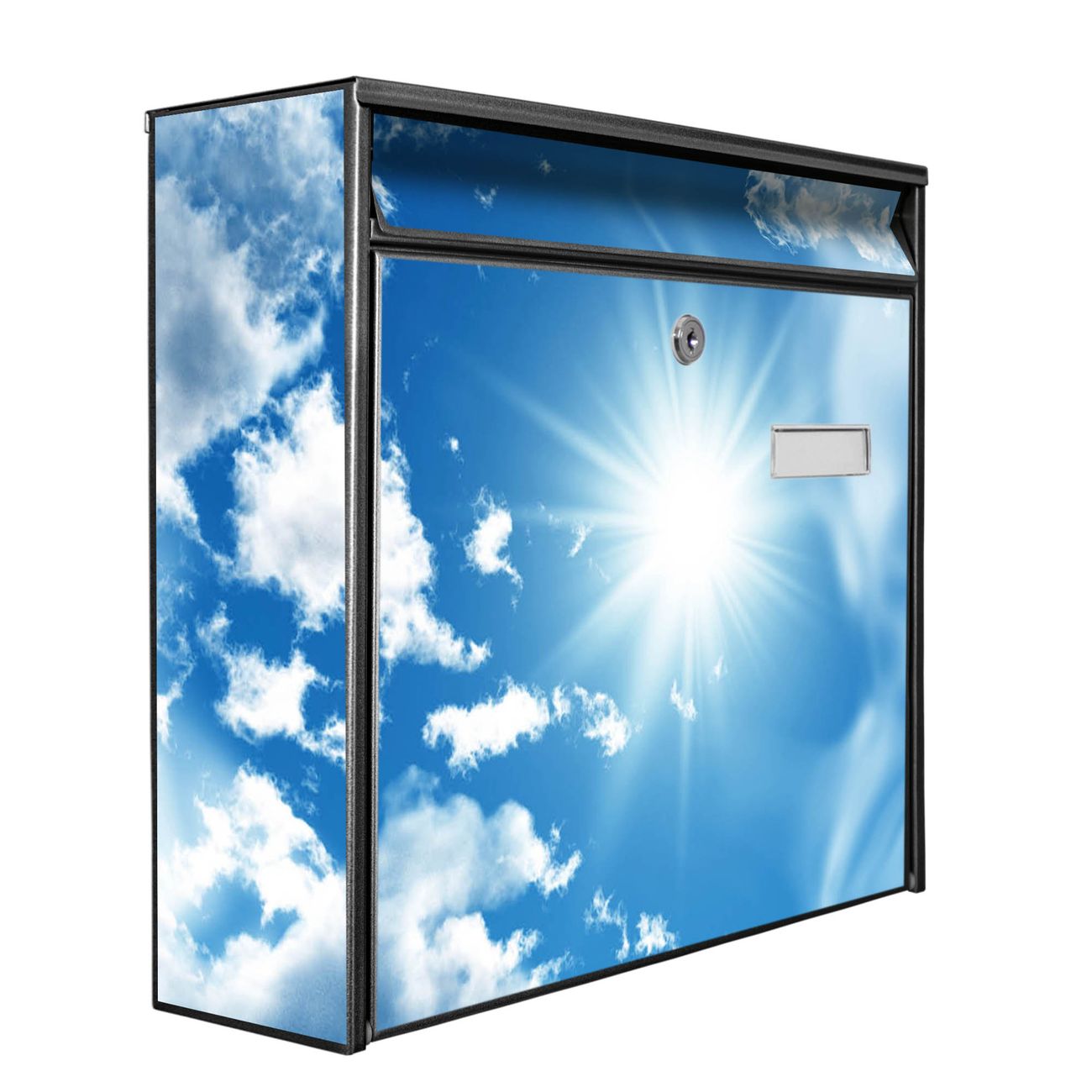 Der Postkasten mit Motiv Clouds hat ein sehr ansprechendes und zeitloses Design. Heben Sie Sich von der tristen grauen Masse ab, ohne auf Funktionalität zu verzichten. Die weite Öffnung ohne scharfe Kanten ermöglicht eine einfache Handhabung beim Entnehmen der Post. Die Größe bietet genügend Platz für Sendungen aller Art, der Einwurf fasst auch größere A4 Sendungen. Ihr Burg-Wächter Motivbriefkasten wird in Sachsen in einer kleinen Manufaktur von Hand veredelt. Die Motivfolie ist lösungsmittelfrei und schutzlaminiert, dies sorgt für einen langen Halt. Wir legen großen Wert auf die Verbindung von Funktionalität und Design.
