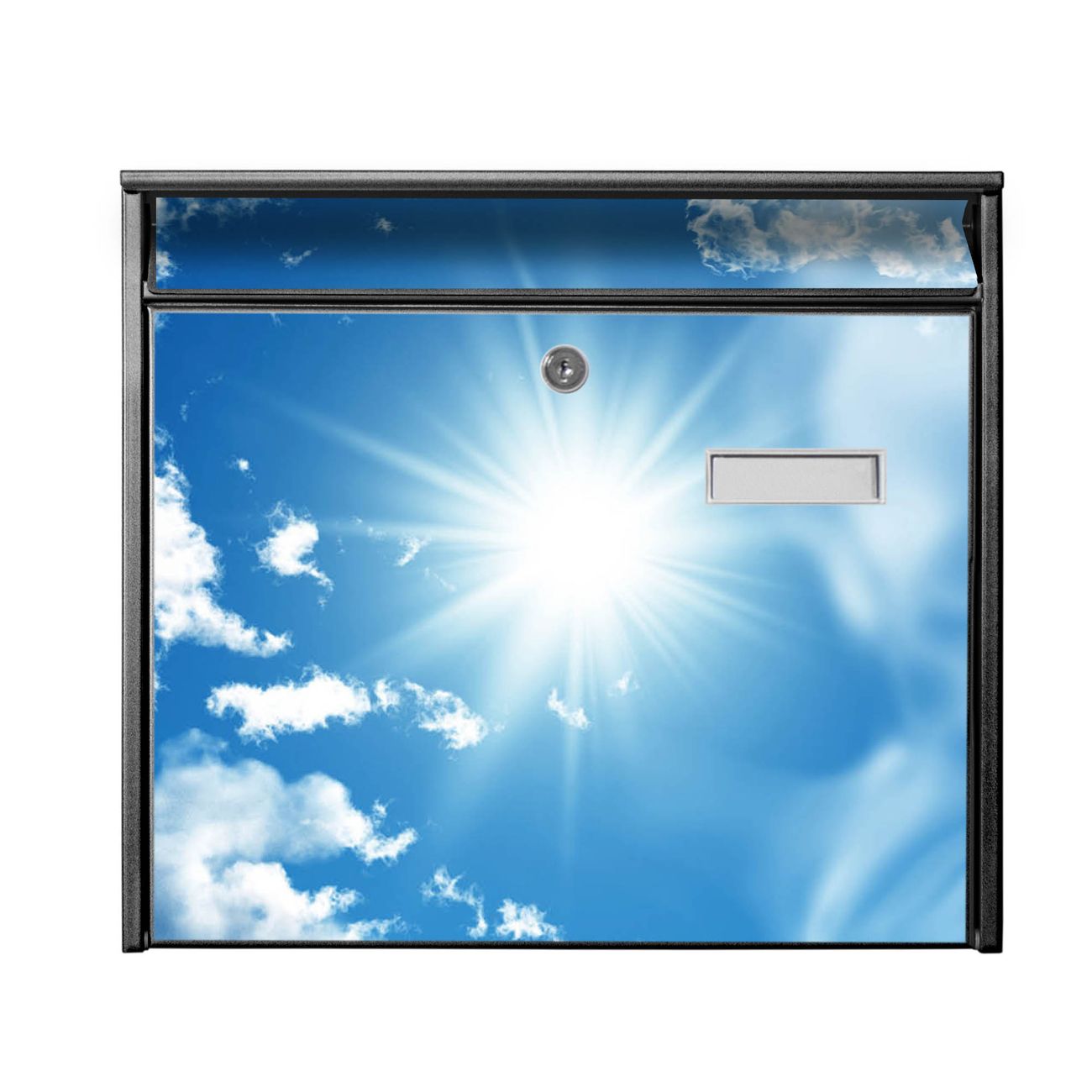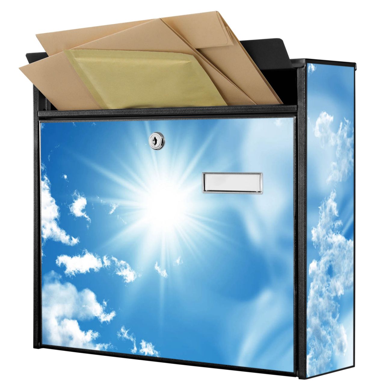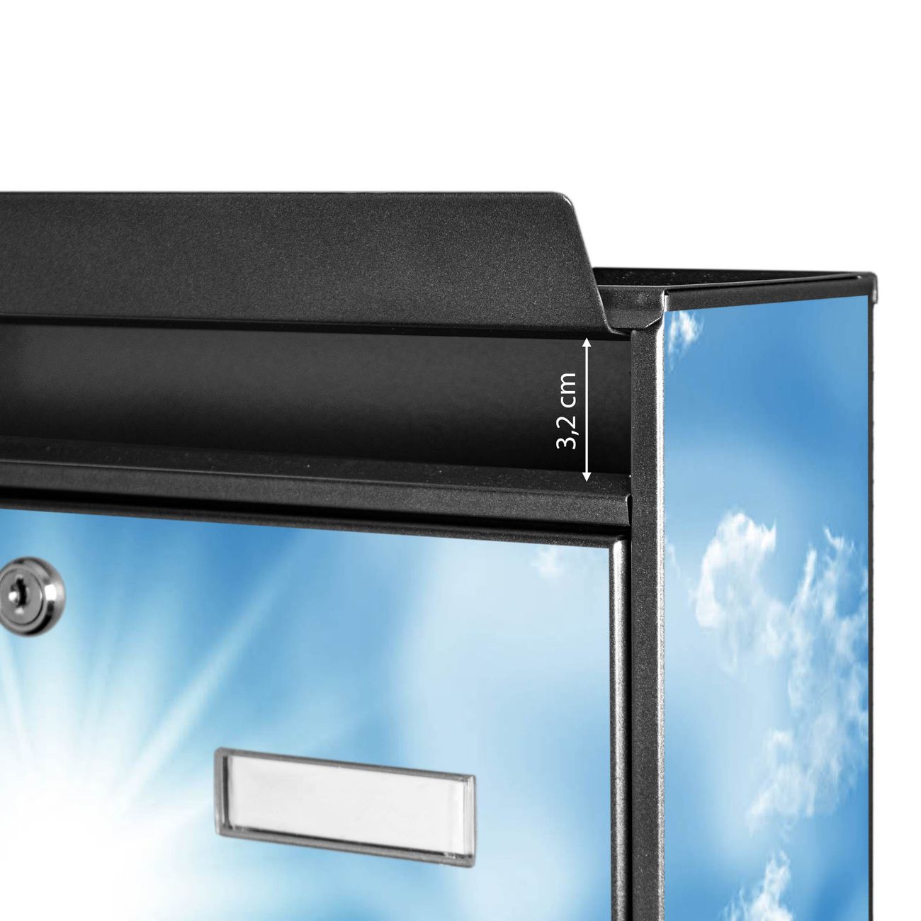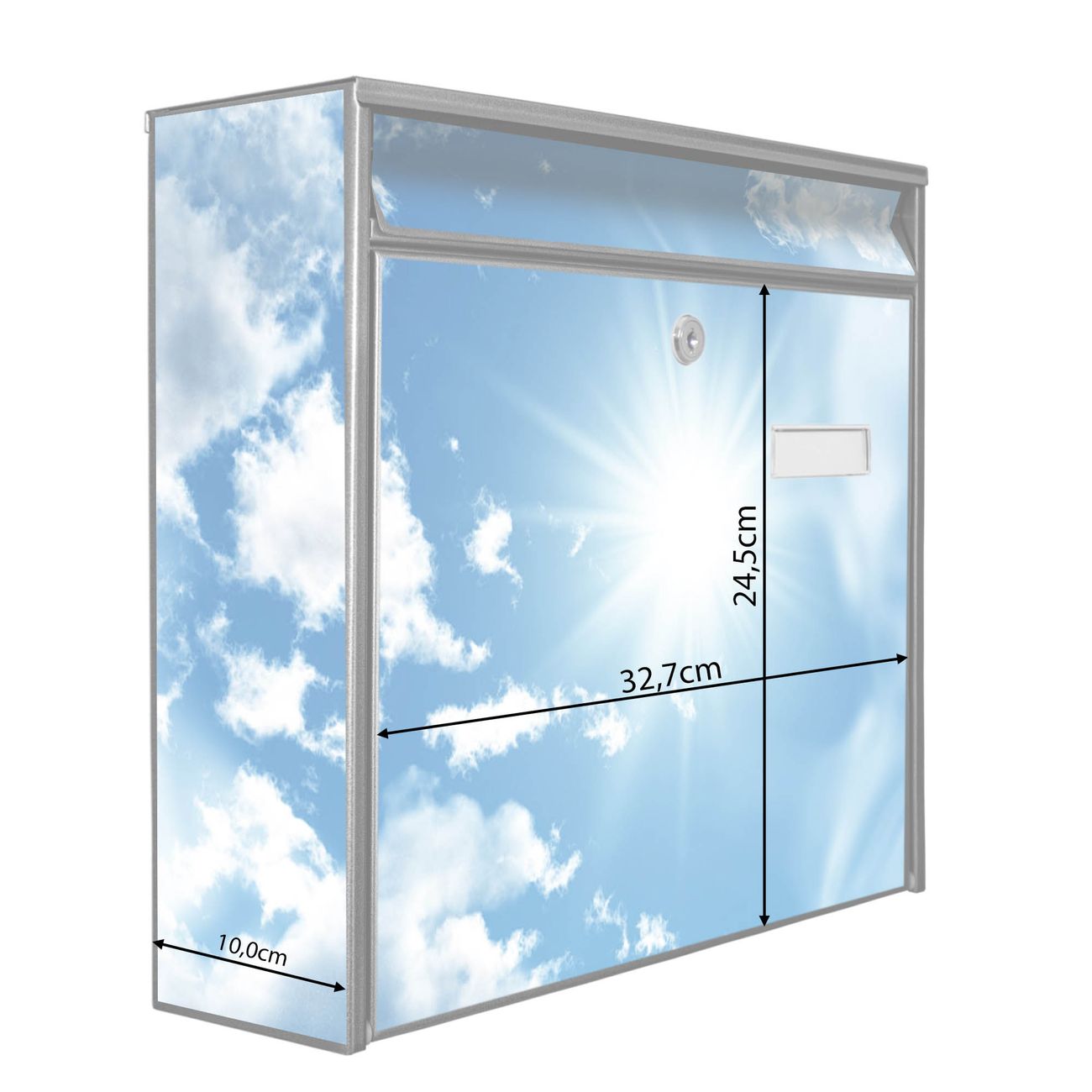 Der Burg Wächter Mail Briefkasten mit Motiv Clouds bietet Ihnen mit seinem Fassungsvermögen genügend Platz auch für große A4 Sendungen. Auf Wunsch können Sie bei uns den passenden Standfuß kaufen und so aus dem Wandbriefkasten einen Standbriefkasten machen. Wir bieten Ihnen ebenfalls Namensschilder, bereits beschriftet oder frei zu beschriften, und verschiedene selbst gestaltete Bitte-Keine-Werbung-Aufkleber.