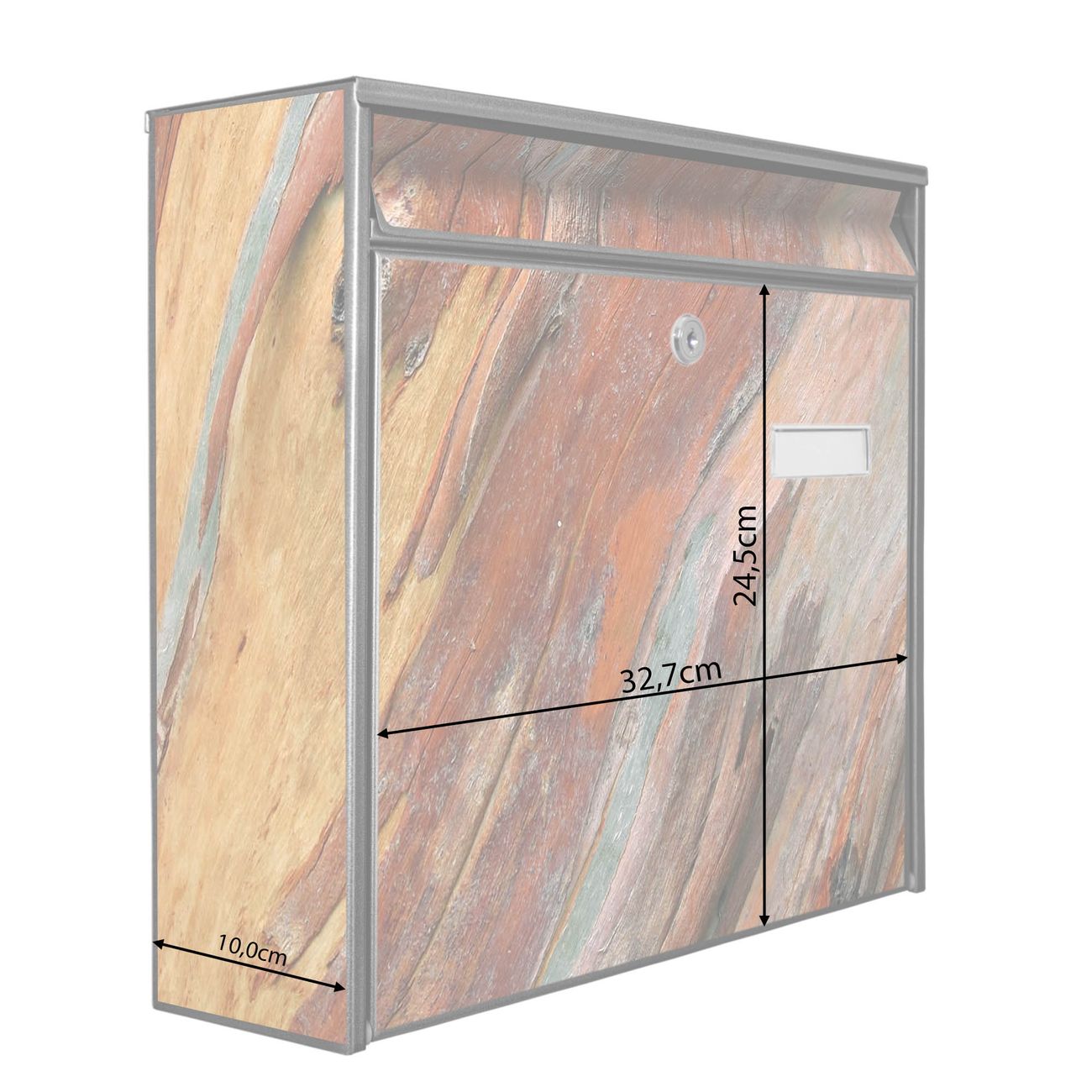 Die Größe des Briefkastens ist 36 x 32 x 10cm (BxHxT) groß. Das Motiv besteht aus einer wetter- und UV-festen Folie, die mit einem Schutzlaminat überzogen ist und Ihren Briefkasten zusätzlich vor Kratzern schützt. Sie erhalten 2 Schlüssel sowie das Montagematerial.