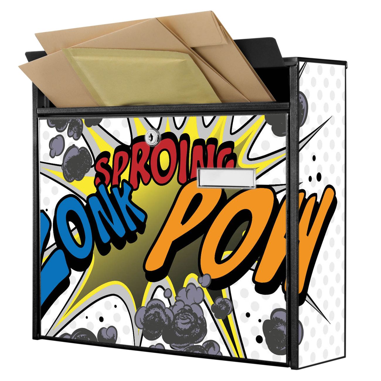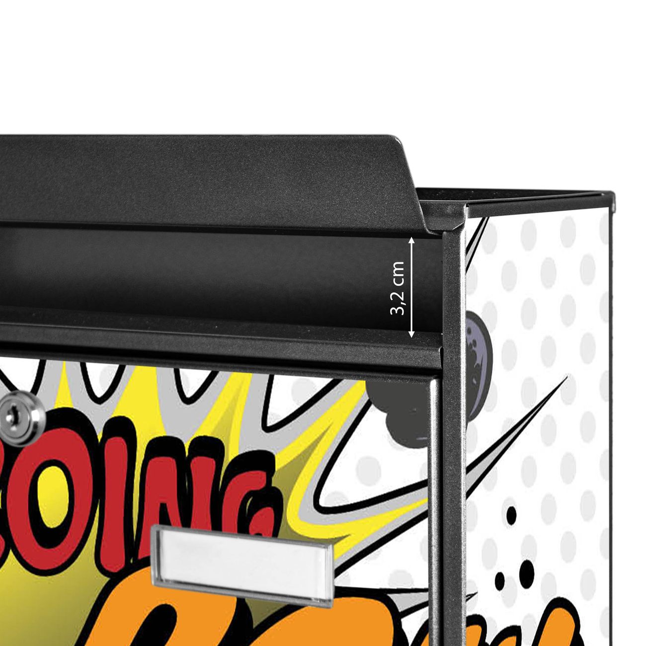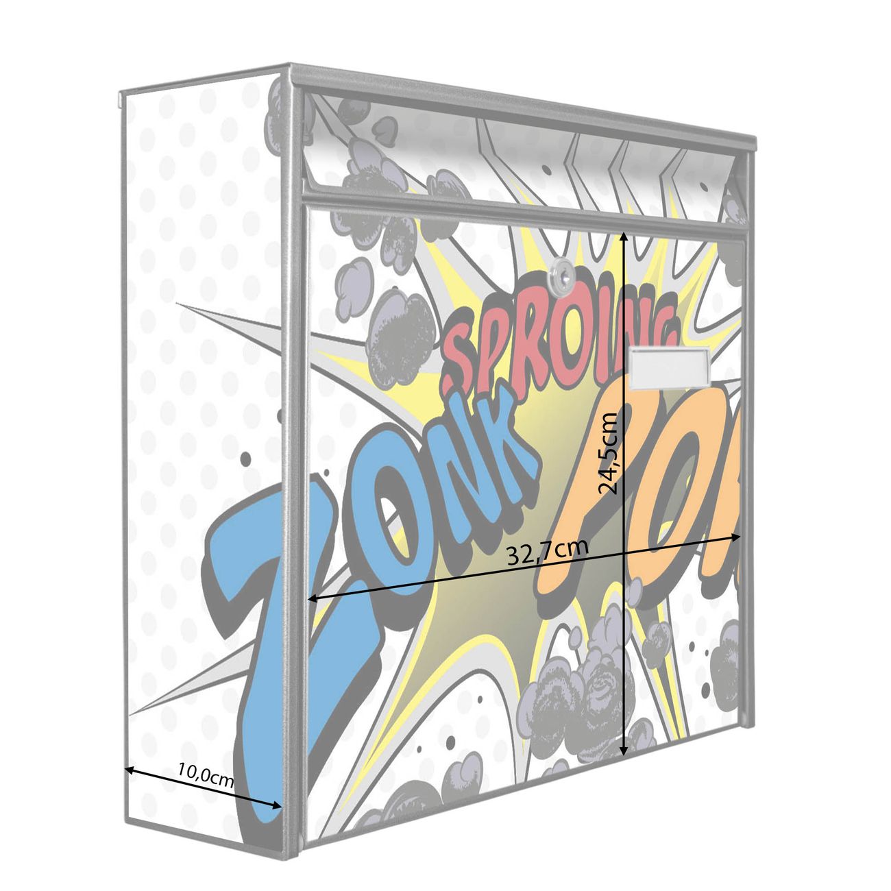 Der Burg Wächter Mail Briefkasten mit Motiv Comic bietet Ihnen mit seinem Fassungsvermögen genügend Platz auch für große A4 Sendungen. Auf Wunsch können Sie bei uns den passenden Standfuß kaufen und so aus dem Wandbriefkasten einen Standbriefkasten machen. Wir bieten Ihnen ebenfalls Namensschilder, bereits beschriftet oder frei zu beschriften, und verschiedene selbst gestaltete Bitte-Keine-Werbung-Aufkleber.