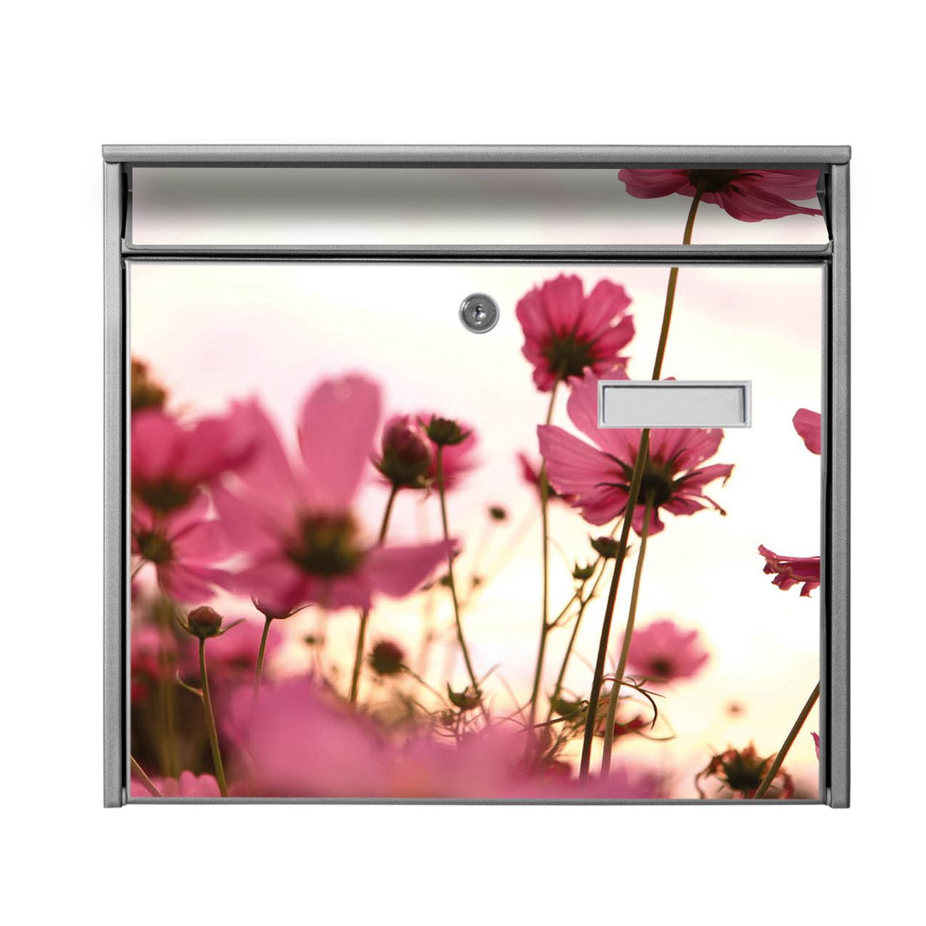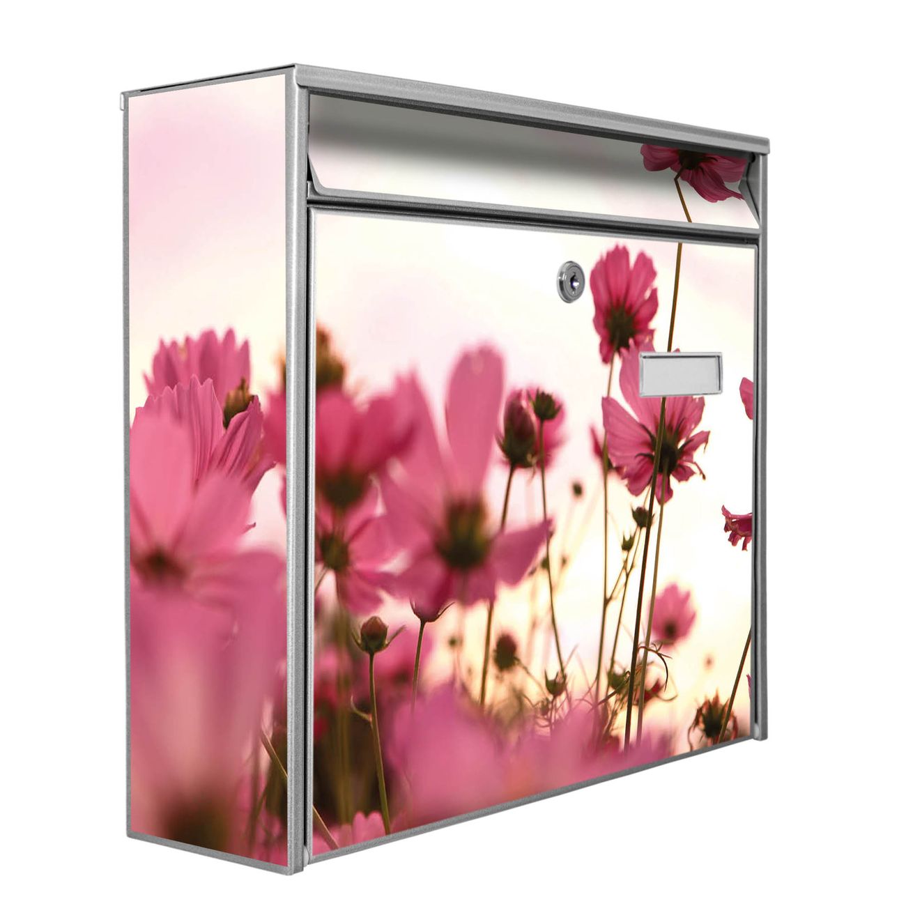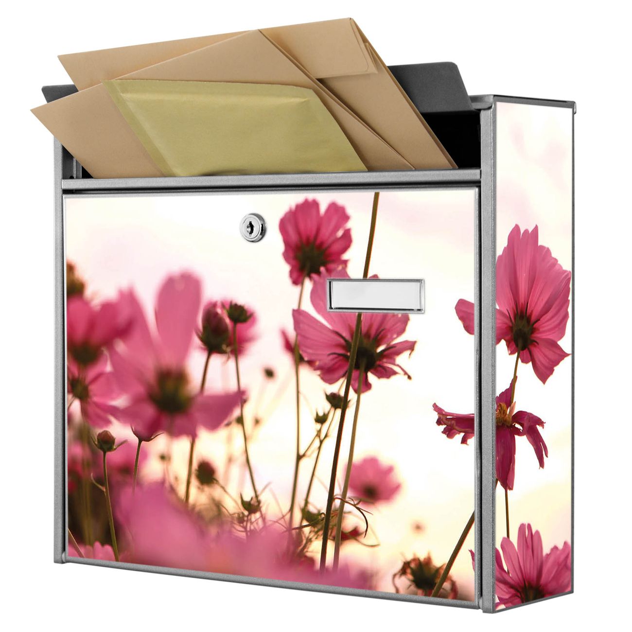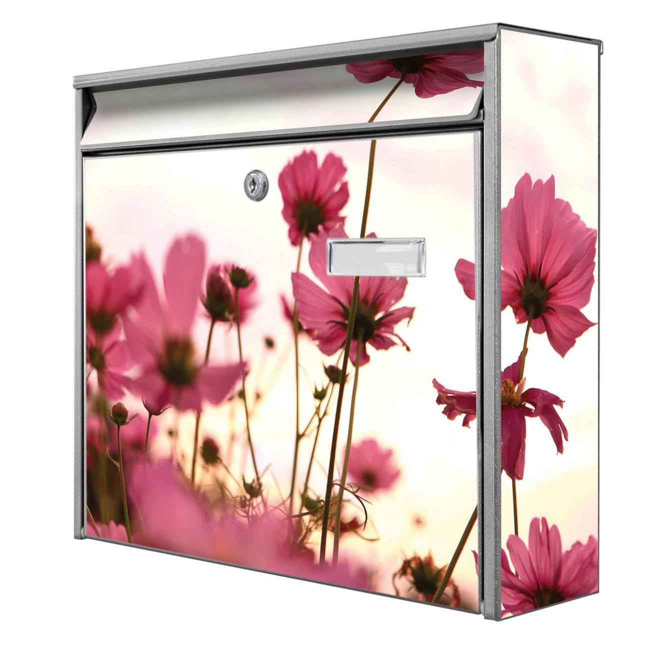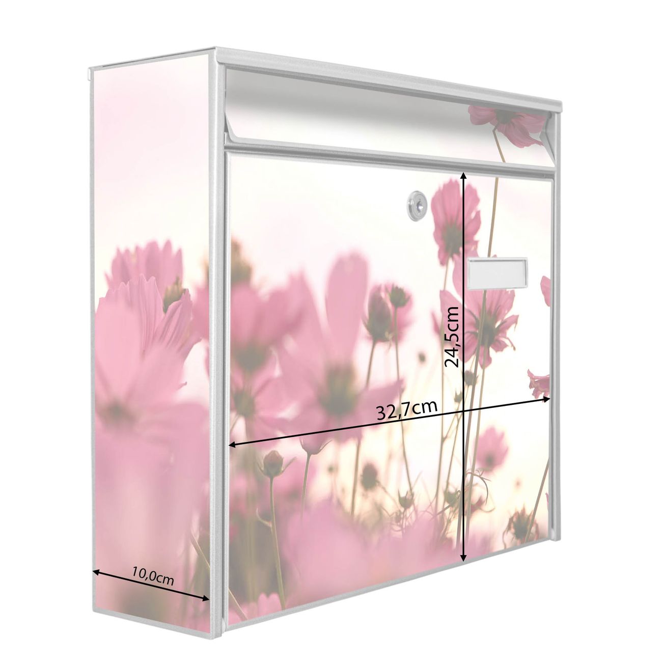 Der Burg Wächter Mail Briefkasten mit Motiv Cosmea bietet Ihnen mit seinem Fassungsvermögen genügend Platz auch für große A4 Sendungen. Auf Wunsch können Sie bei uns den passenden Standfuß kaufen und so aus dem Wandbriefkasten einen Standbriefkasten machen. Wir bieten Ihnen ebenfalls Namensschilder, bereits beschriftet oder frei zu beschriften, und verschiedene selbst gestaltete Bitte-Keine-Werbung-Aufkleber.