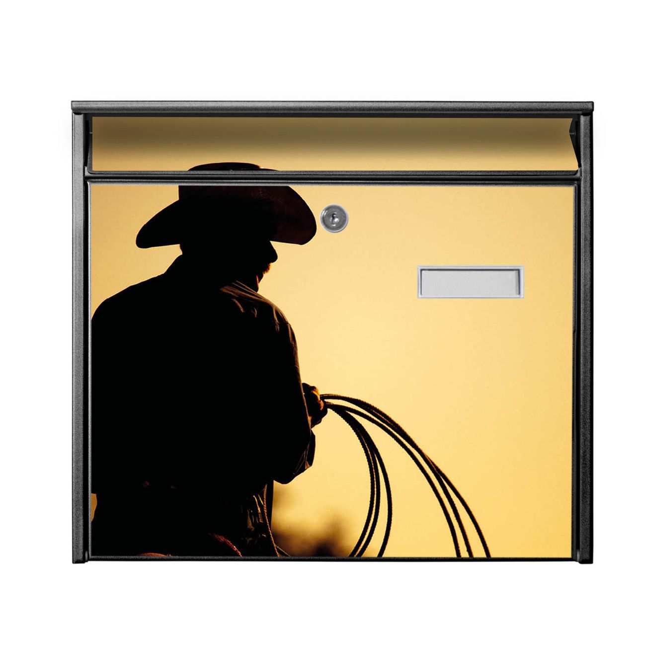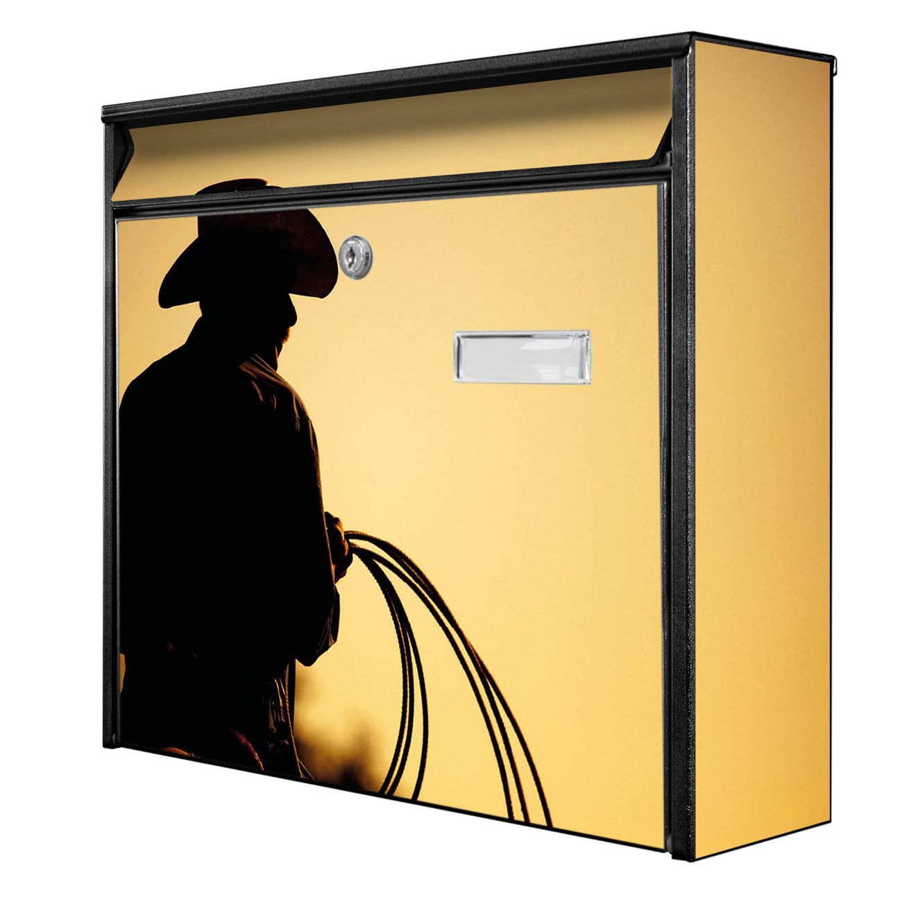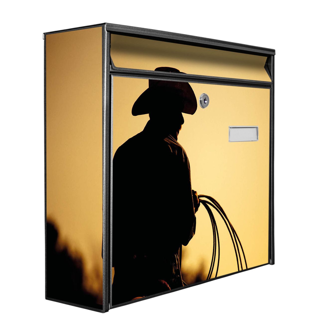 Der Burg Wächter Mail Briefkasten mit Motiv Cowboy bietet Ihnen mit seinem Fassungsvermögen genügend Platz auch für große A4 Sendungen. Auf Wunsch können Sie bei uns den passenden Standfuß kaufen und so aus dem Wandbriefkasten einen Standbriefkasten machen. Wir bieten Ihnen ebenfalls Namensschilder, bereits beschriftet oder frei zu beschriften, und verschiedene selbst gestaltete Bitte-Keine-Werbung-Aufkleber.