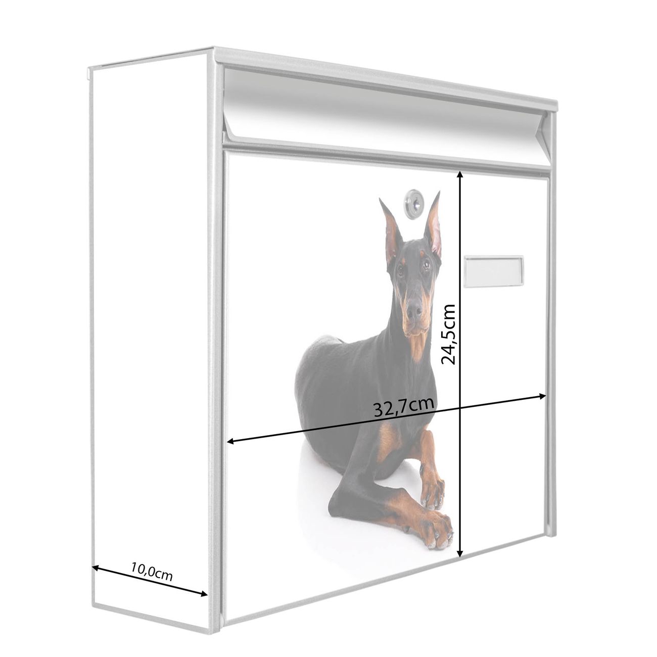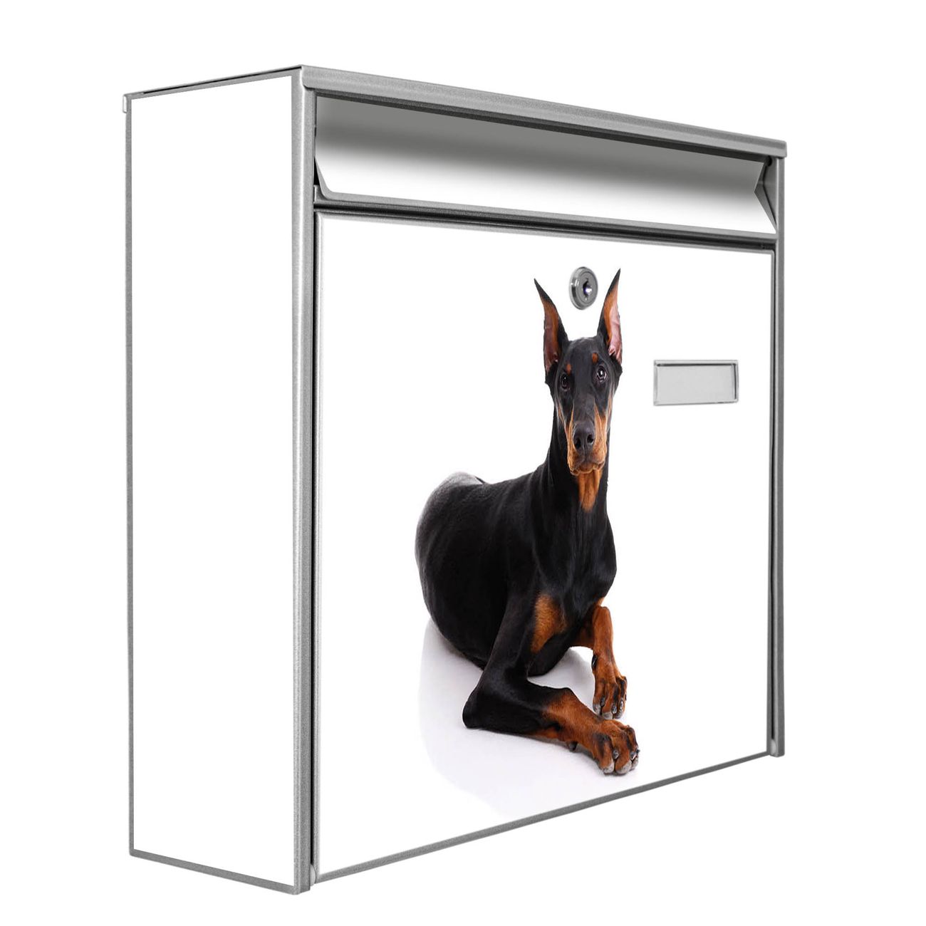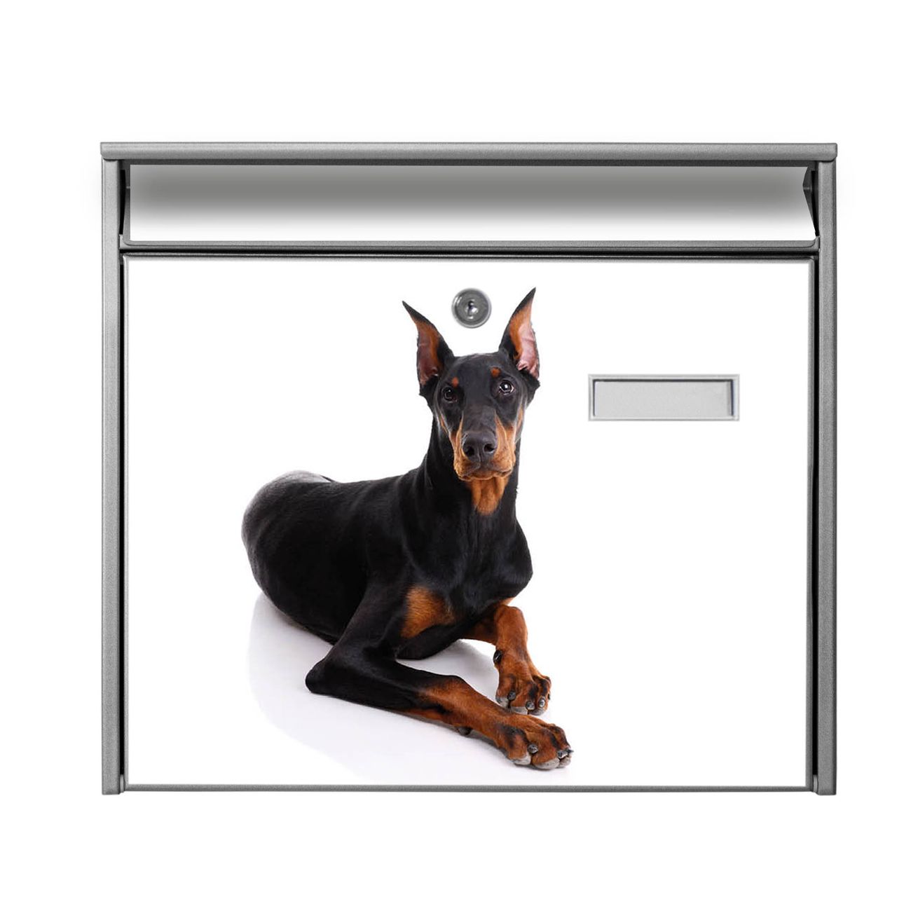 Der Burg Wächter Mail Briefkasten mit Motiv Dobermann bietet Ihnen mit seinem Fassungsvermögen genügend Platz auch für große A4 Sendungen. Auf Wunsch können Sie bei uns den passenden Standfuß kaufen und so aus dem Wandbriefkasten einen Standbriefkasten machen. Wir bieten Ihnen ebenfalls Namensschilder, bereits beschriftet oder frei zu beschriften, und verschiedene selbst gestaltete Bitte-Keine-Werbung-Aufkleber.