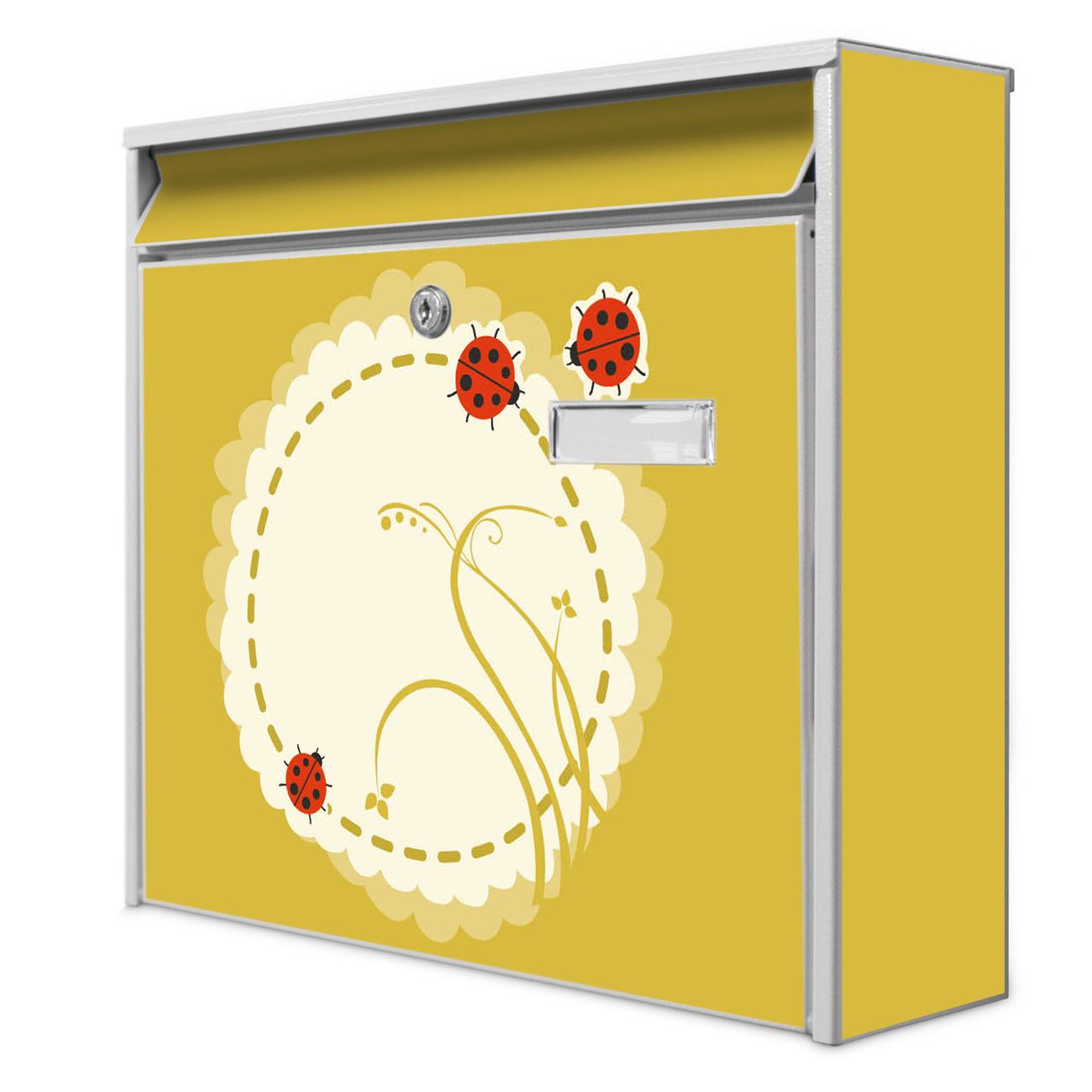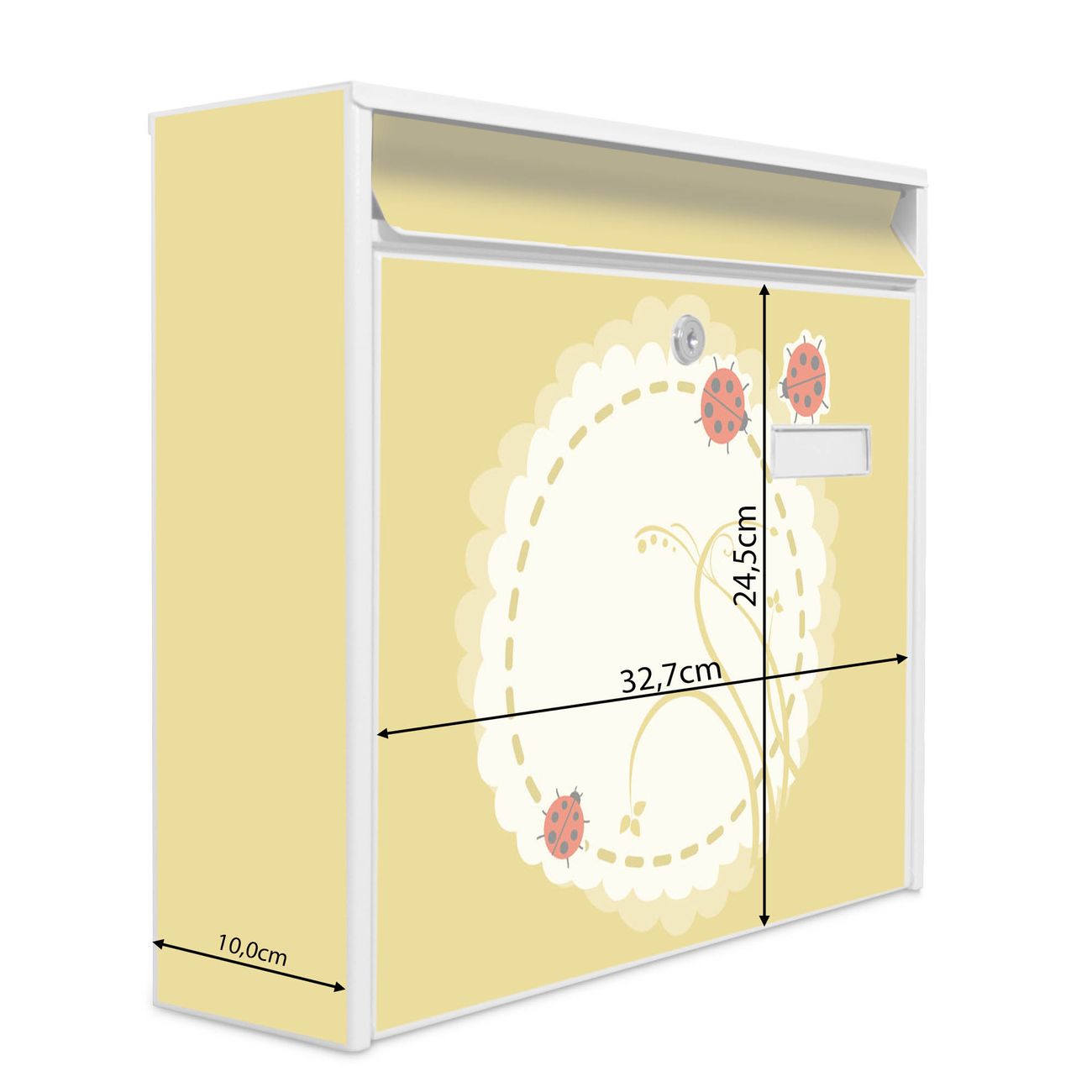 Der Burg Wächter Mail Briefkasten mit Motiv Drei Marienkäfer bietet Ihnen mit seinem Fassungsvermögen genügend Platz auch für große A4 Sendungen. Auf Wunsch können Sie bei uns den passenden Standfuß kaufen und so aus dem Wandbriefkasten einen Standbriefkasten machen. Wir bieten Ihnen ebenfalls Namensschilder, bereits beschriftet oder frei zu beschriften, und verschiedene selbst gestaltete Bitte-Keine-Werbung-Aufkleber.
