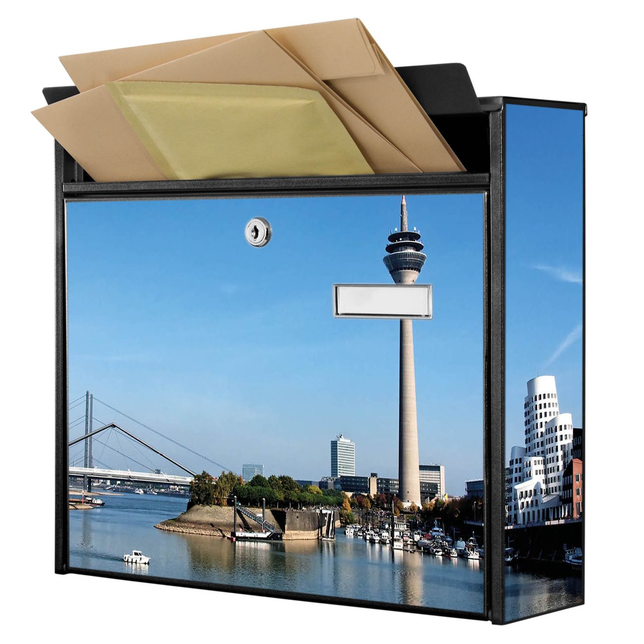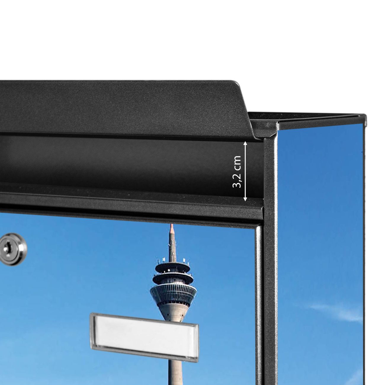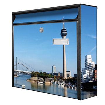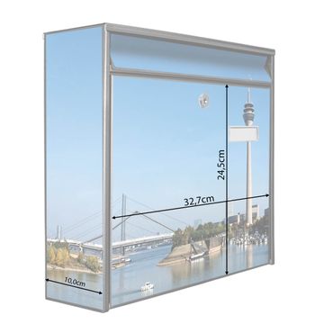 Der Burg Wächter Mail Briefkasten mit Motiv Düsseldorf bietet Ihnen mit seinem Fassungsvermögen genügend Platz auch für große A4 Sendungen. Auf Wunsch können Sie bei uns den passenden Standfuß kaufen und so aus dem Wandbriefkasten einen Standbriefkasten machen. Wir bieten Ihnen ebenfalls Namensschilder, bereits beschriftet oder frei zu beschriften, und verschiedene selbst gestaltete Bitte-Keine-Werbung-Aufkleber.