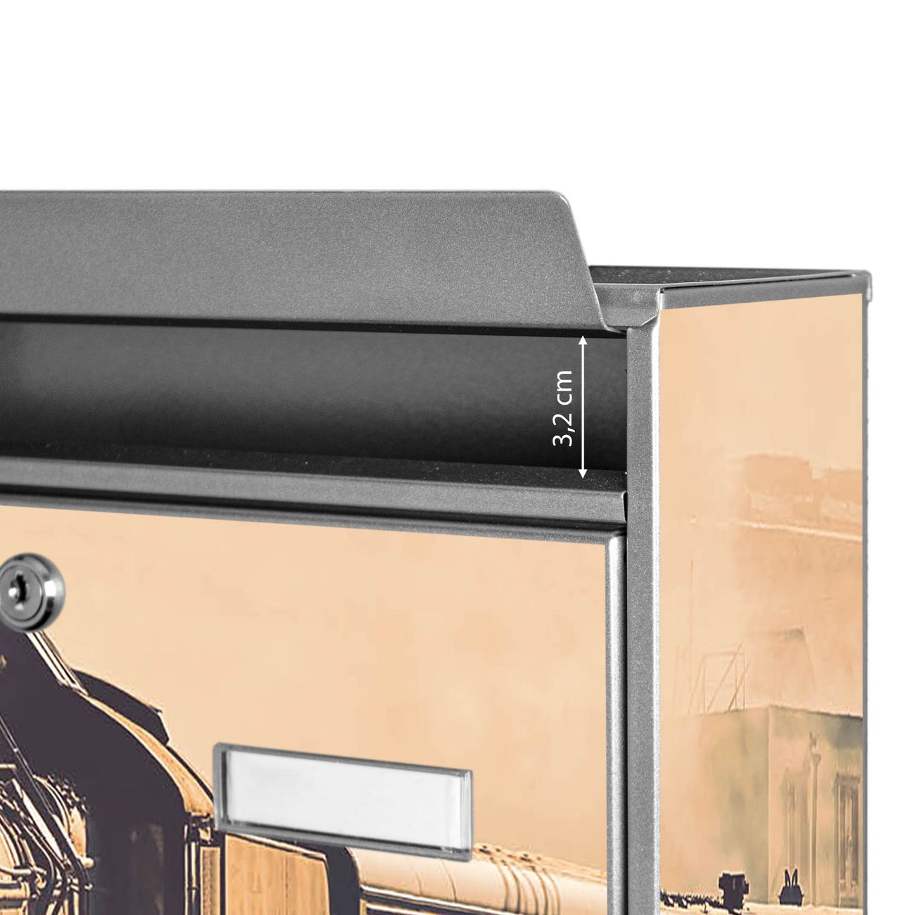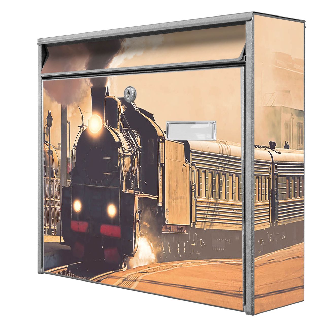 Der Burg Wächter Mail Briefkasten mit Motiv Einfahrender Zug bietet Ihnen mit seinem Fassungsvermögen genügend Platz auch für große A4 Sendungen. Auf Wunsch können Sie bei uns den passenden Standfuß kaufen und so aus dem Wandbriefkasten einen Standbriefkasten machen. Wir bieten Ihnen ebenfalls Namensschilder, bereits beschriftet oder frei zu beschriften, und verschiedene selbst gestaltete Bitte-Keine-Werbung-Aufkleber.