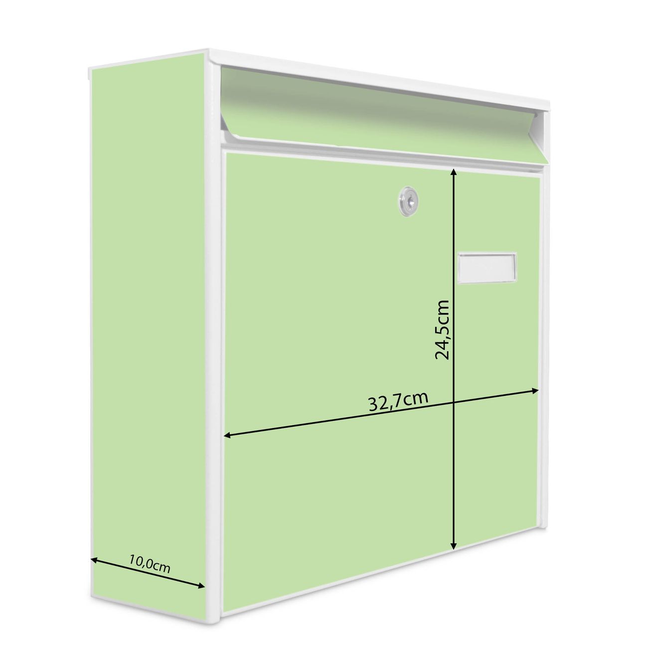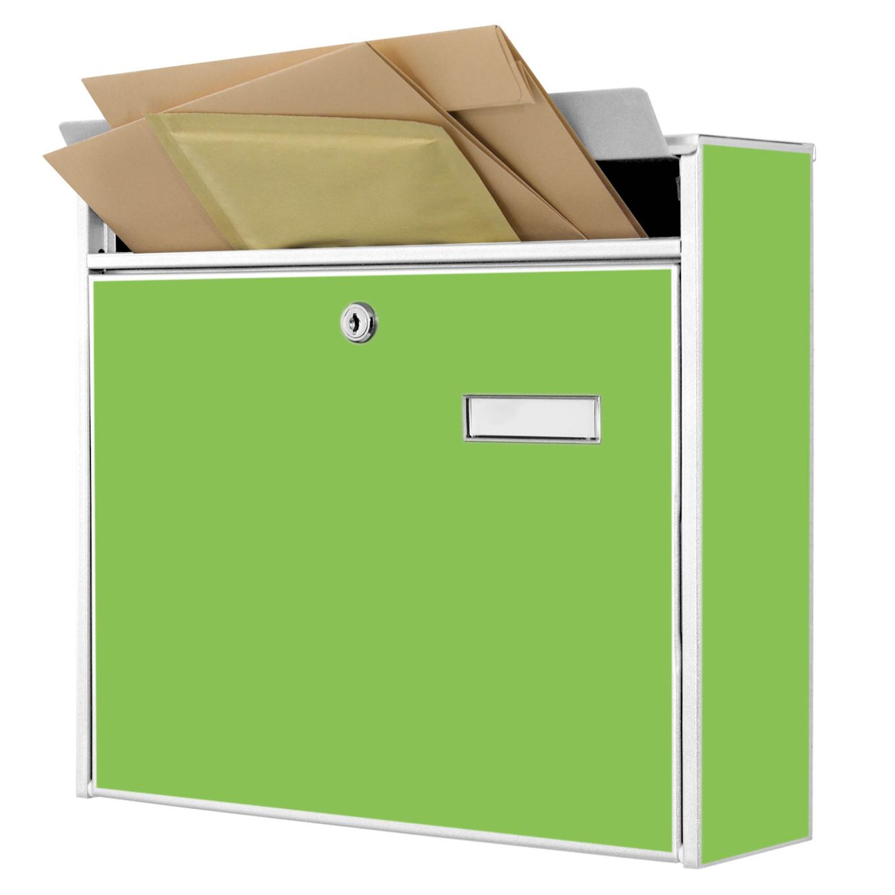 Der Burg Wächter Mail Briefkasten mit Farbe Limettengrün bietet Ihnen mit seinem Fassungsvermögen genügend Platz auch für große A4 Sendungen. Auf Wunsch können Sie bei uns den passenden Standfuß kaufen und so aus dem Wandbriefkasten einen Standbriefkasten machen. Wir bieten Ihnen ebenfalls Namensschilder, bereits beschriftet oder frei zu beschriften, und verschiedene selbst gestaltete Bitte-Keine-Werbung-Aufkleber.