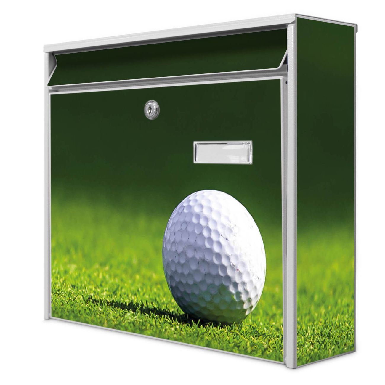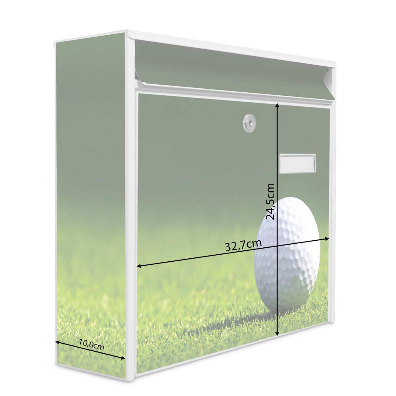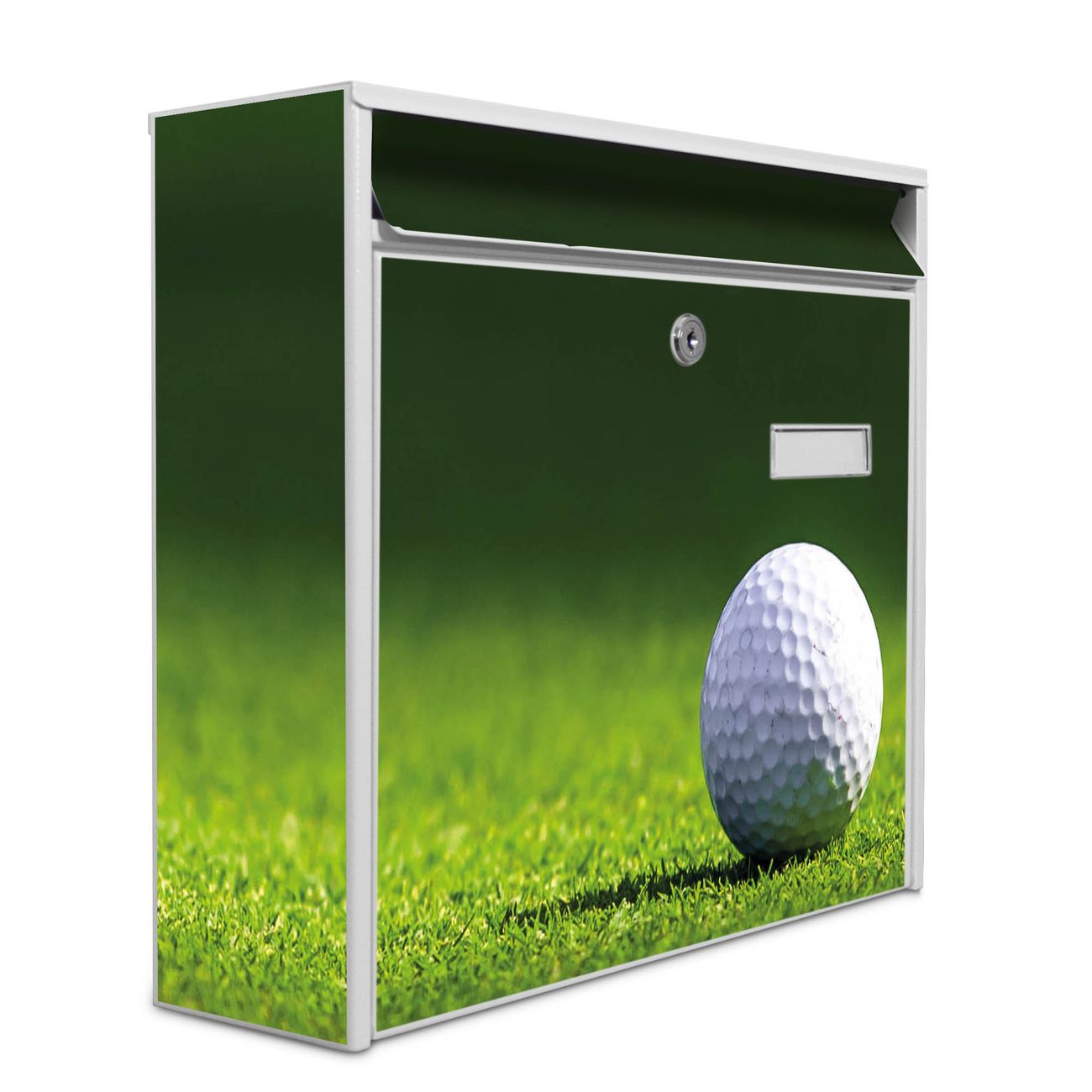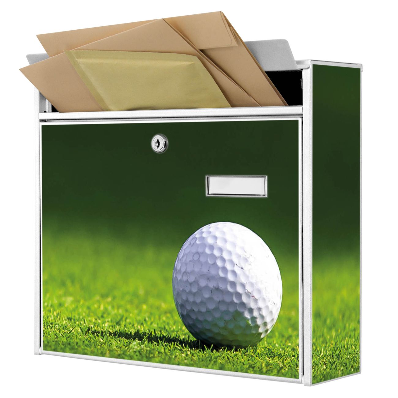 Der Burg Wächter Mail Briefkasten mit Motiv Einsamer Golfball bietet Ihnen mit seinem Fassungsvermögen genügend Platz auch für große A4 Sendungen. Auf Wunsch können Sie bei uns den passenden Standfuß kaufen und so aus dem Wandbriefkasten einen Standbriefkasten machen. Wir bieten Ihnen ebenfalls Namensschilder, bereits beschriftet oder frei zu beschriften, und verschiedene selbst gestaltete Bitte-Keine-Werbung-Aufkleber.