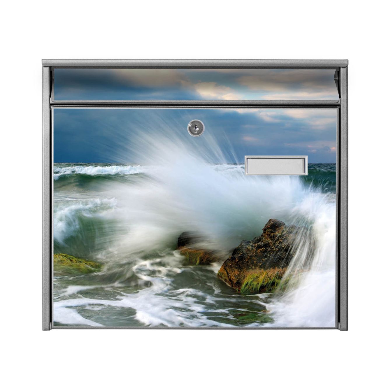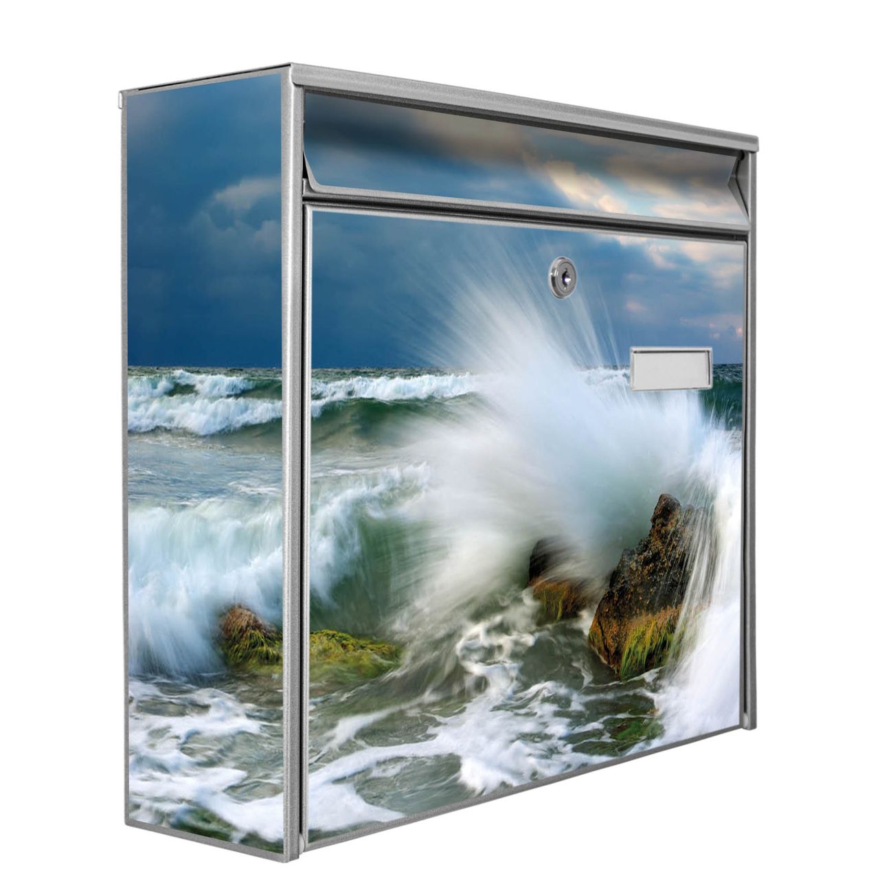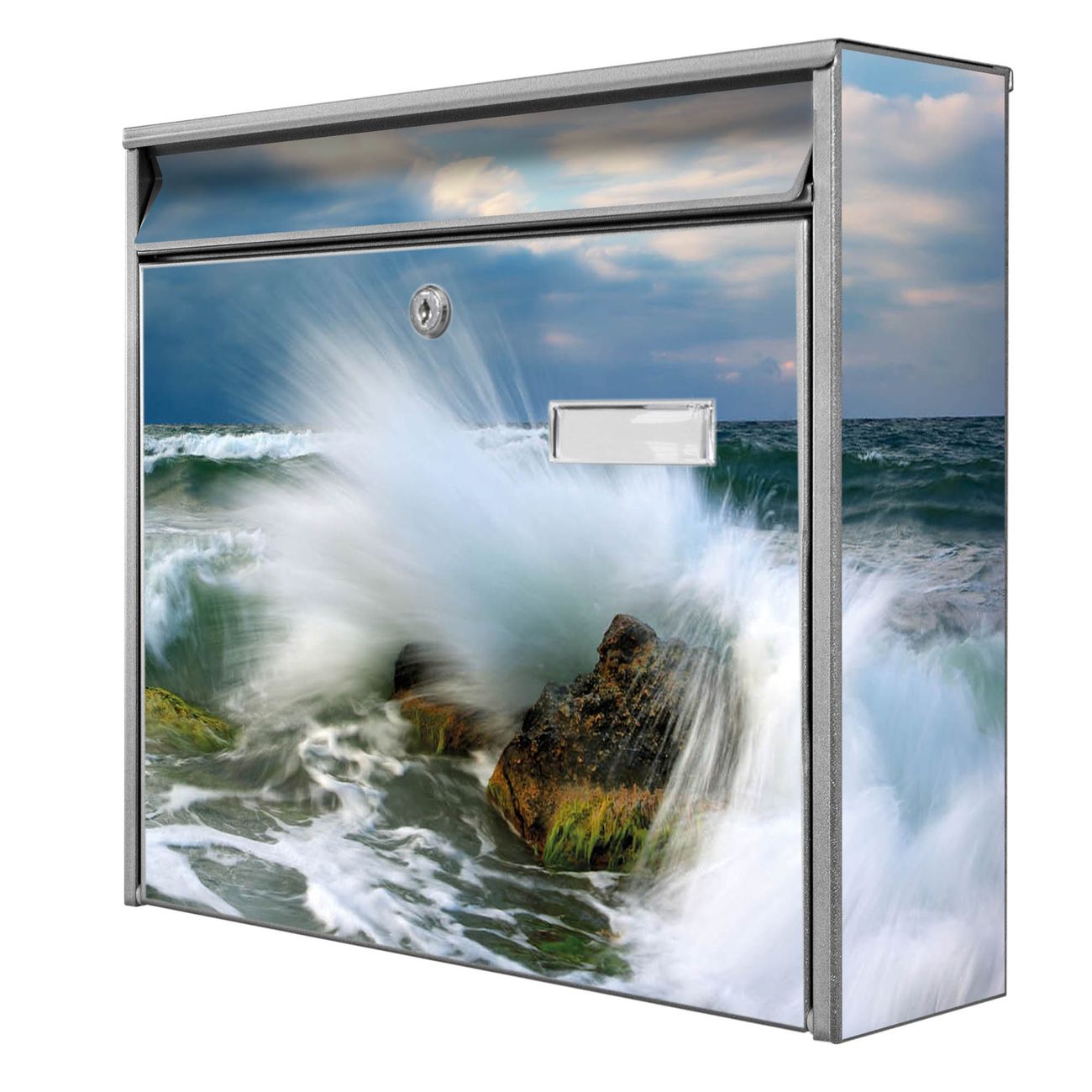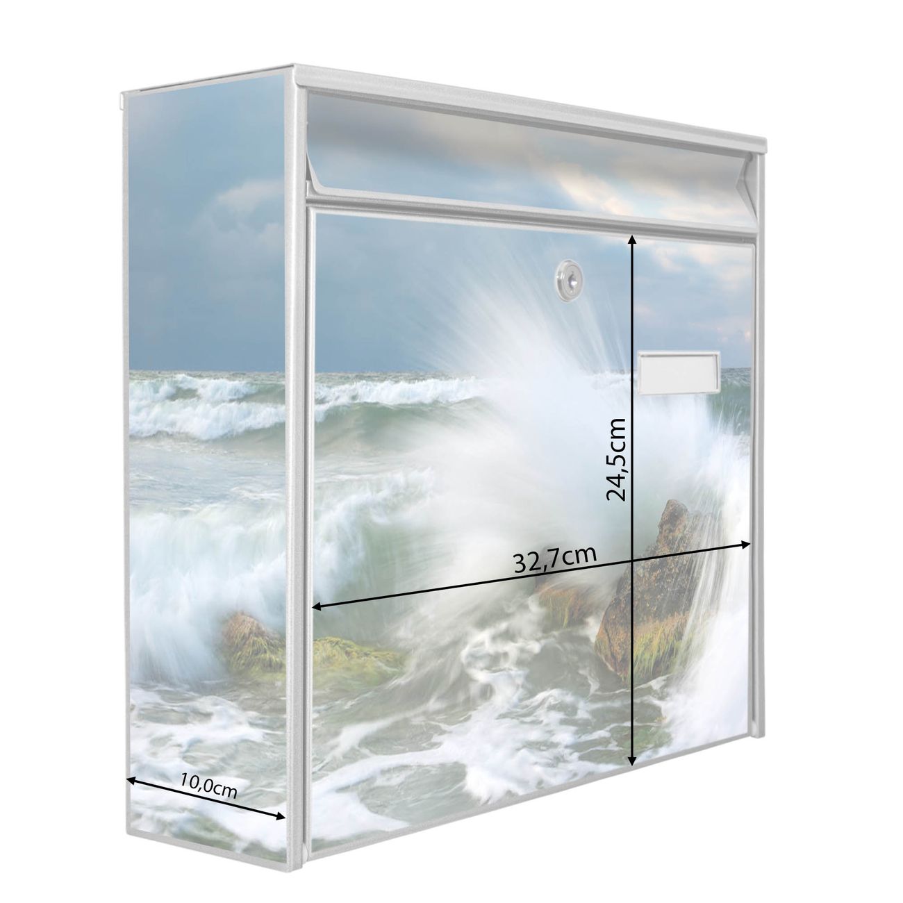 Die Größe des Briefkastens ist 36 x 32 x 10cm (BxHxT) groß. Das Motiv besteht aus einer wetter- und UV-festen Folie, die mit einem Schutzlaminat überzogen ist und Ihren Briefkasten zusätzlich vor Kratzern schützt. Sie erhalten 2 Schlüssel sowie das Montagematerial.