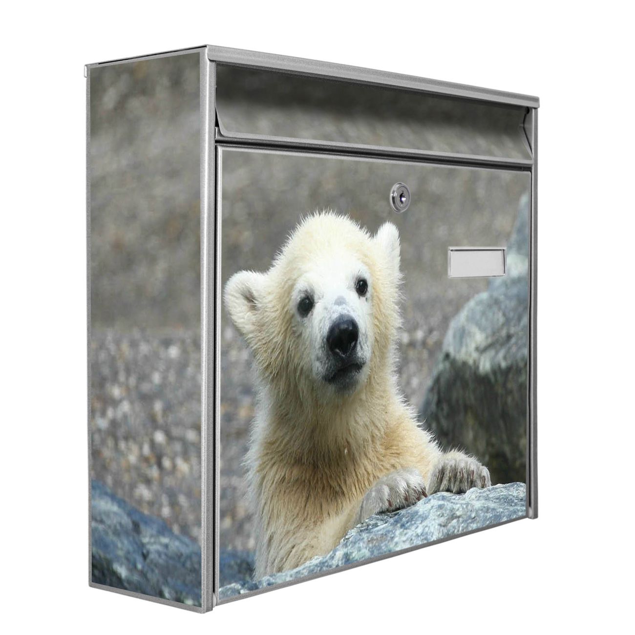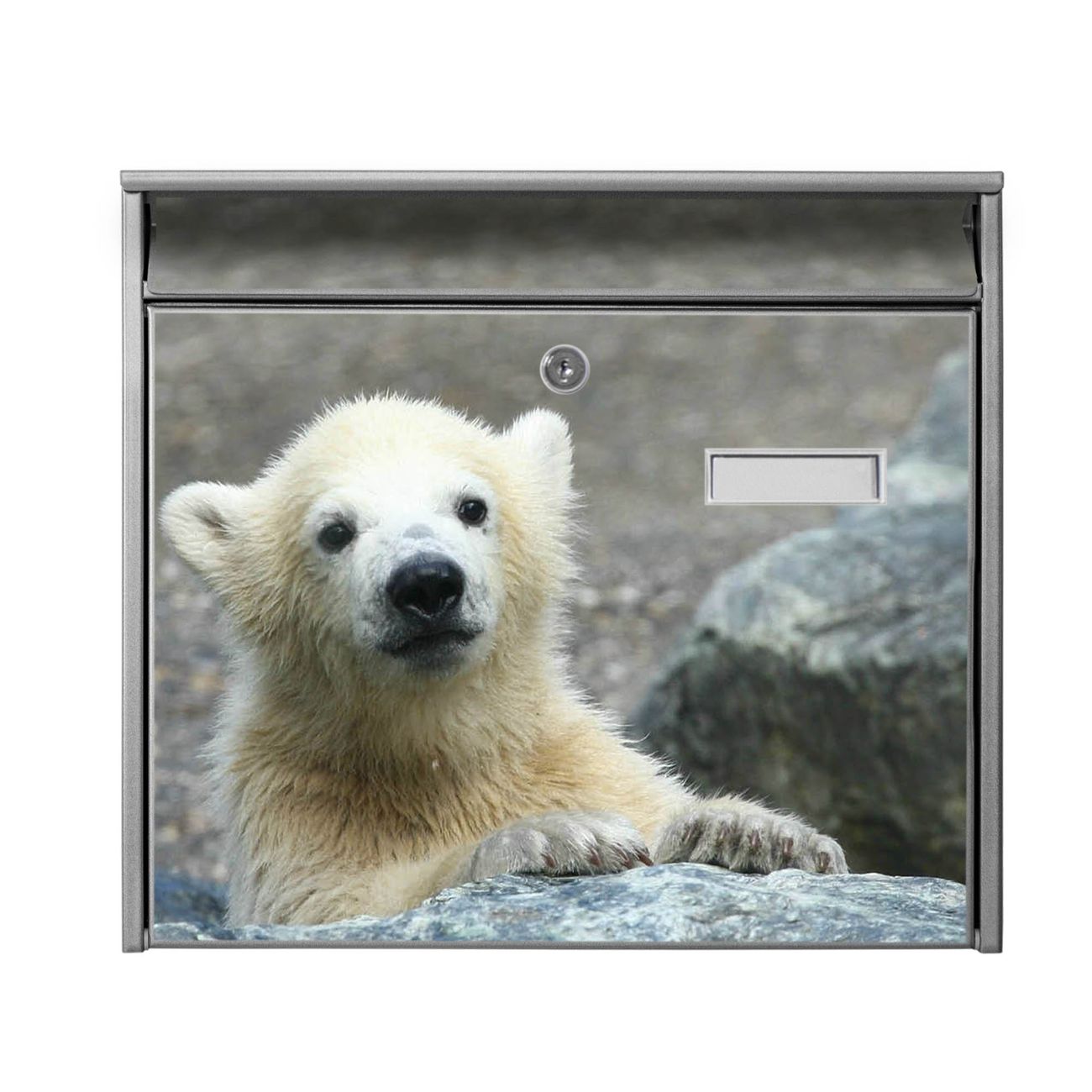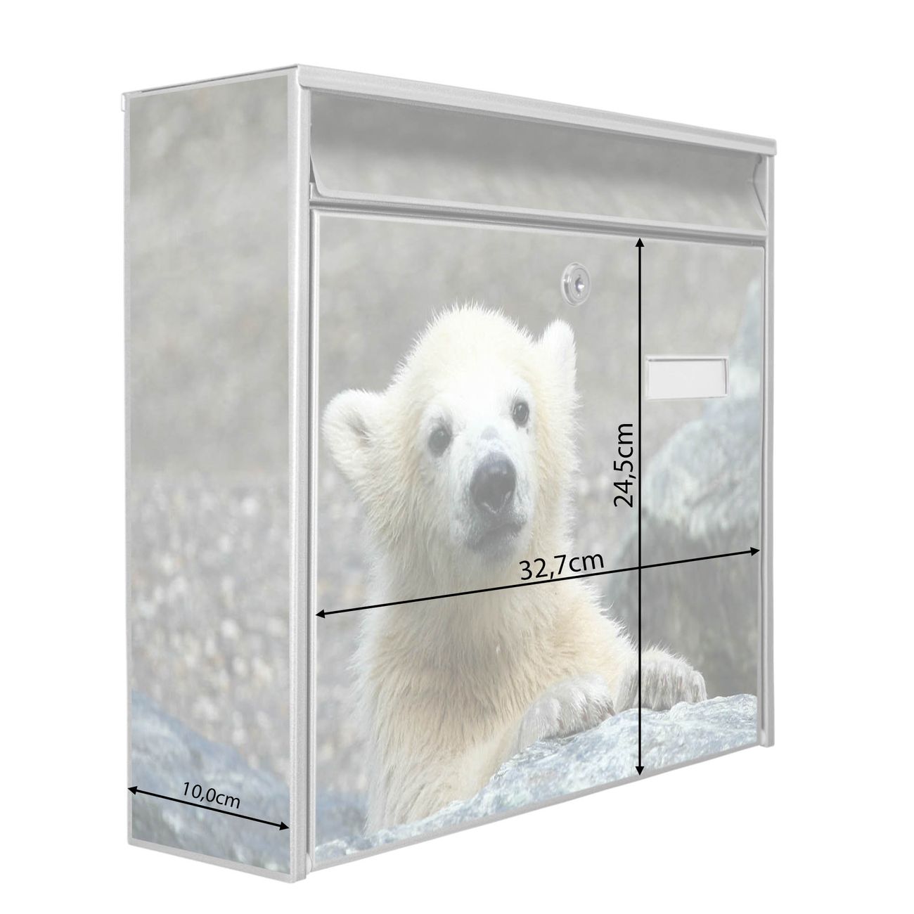 Der Burg Wächter Mail Briefkasten mit Motiv Eisbär Baby bietet Ihnen mit seinem Fassungsvermögen genügend Platz auch für große A4 Sendungen. Auf Wunsch können Sie bei uns den passenden Standfuß kaufen und so aus dem Wandbriefkasten einen Standbriefkasten machen. Wir bieten Ihnen ebenfalls Namensschilder, bereits beschriftet oder frei zu beschriften, und verschiedene selbst gestaltete Bitte-Keine-Werbung-Aufkleber.