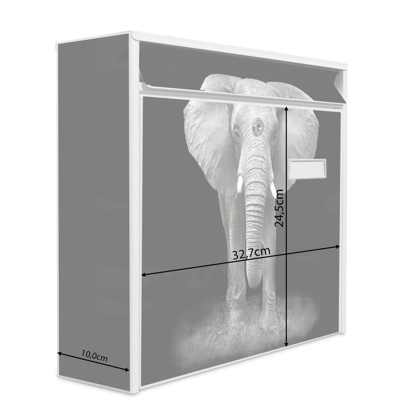 Die Größe des Briefkastens ist 36 x 32 x 10cm (BxHxT) groß. Das Motiv besteht aus einer wetter- und UV-festen Folie, die mit einem Schutzlaminat überzogen ist und Ihren Briefkasten zusätzlich vor Kratzern schützt. Sie erhalten 2 Schlüssel sowie das Montagematerial.