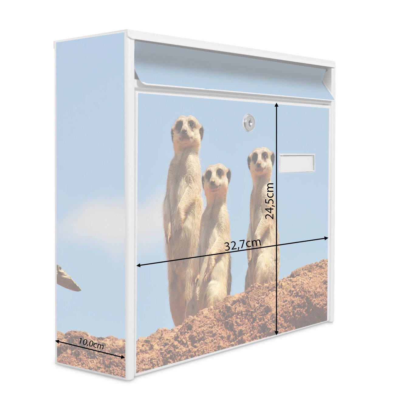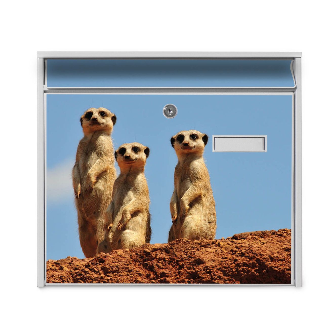 Der Burg Wächter Mail Briefkasten mit Motiv Erdmännchenfamilie bietet Ihnen mit seinem Fassungsvermögen genügend Platz auch für große A4 Sendungen. Auf Wunsch können Sie bei uns den passenden Standfuß kaufen und so aus dem Wandbriefkasten einen Standbriefkasten machen. Wir bieten Ihnen ebenfalls Namensschilder, bereits beschriftet oder frei zu beschriften, und verschiedene selbst gestaltete Bitte-Keine-Werbung-Aufkleber.