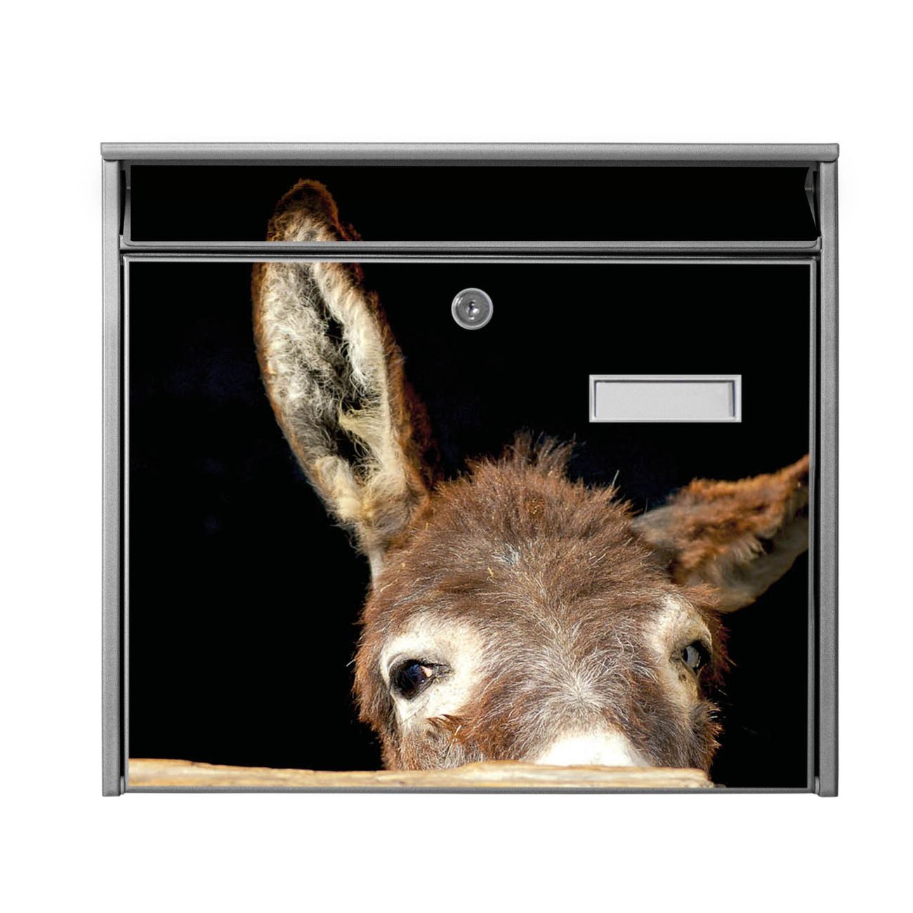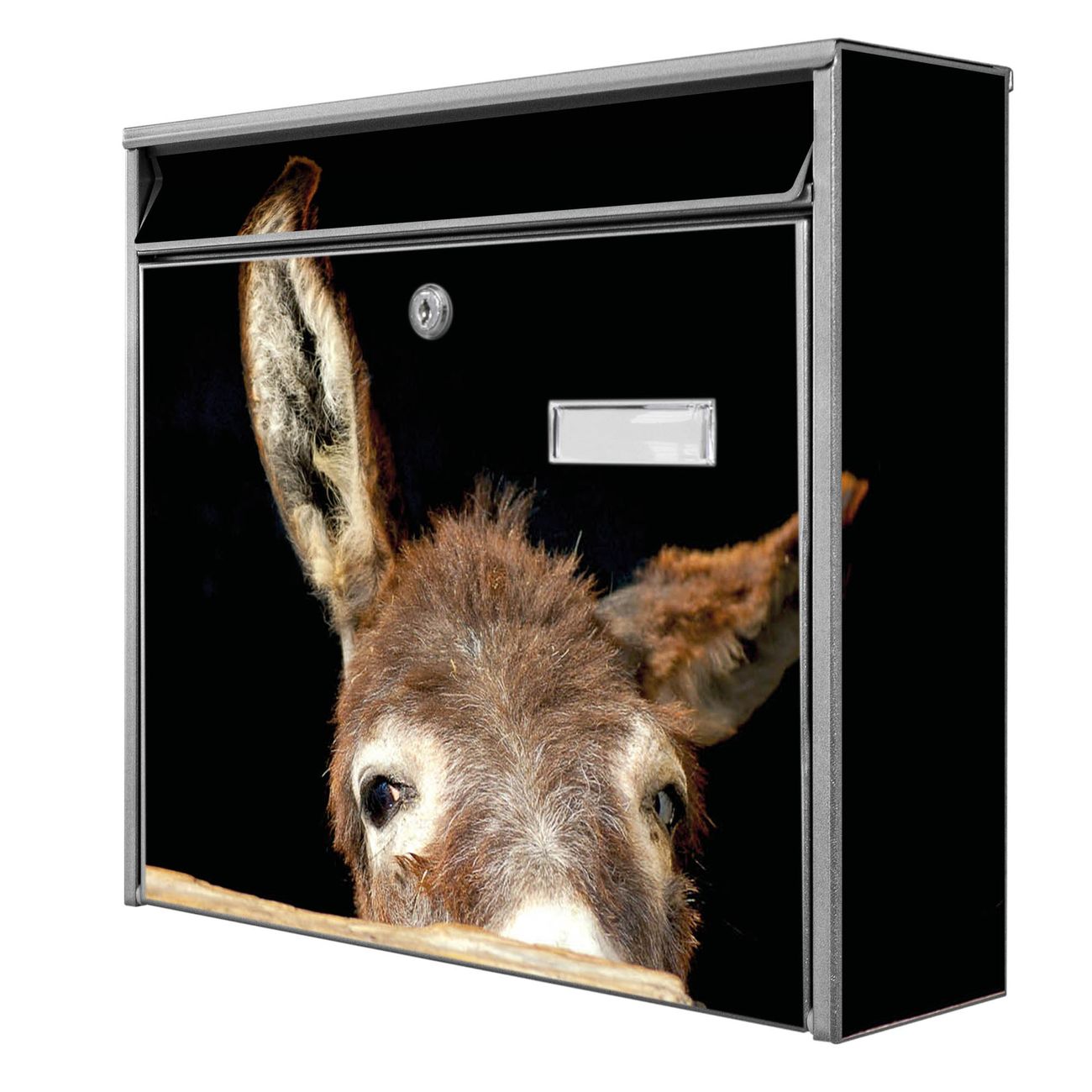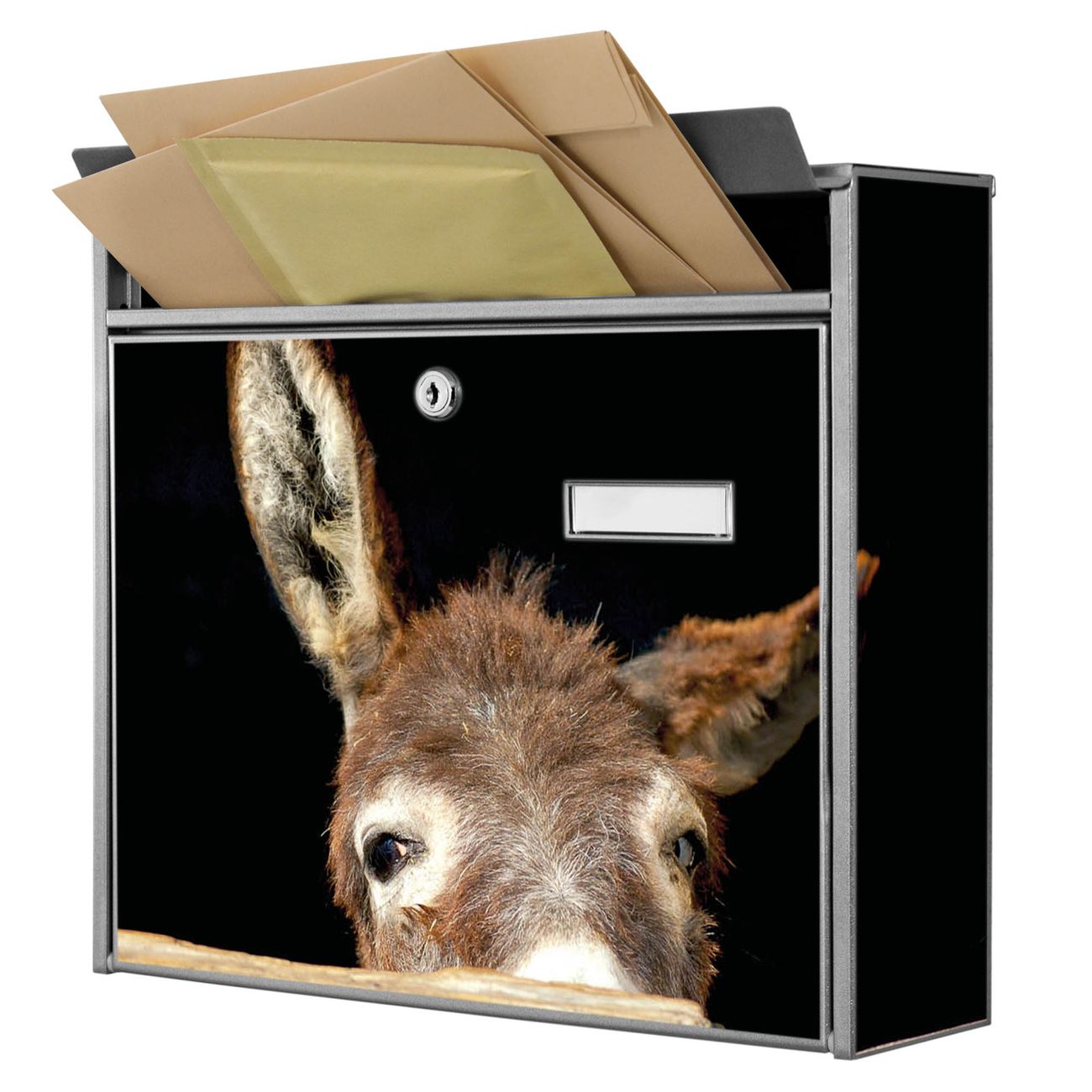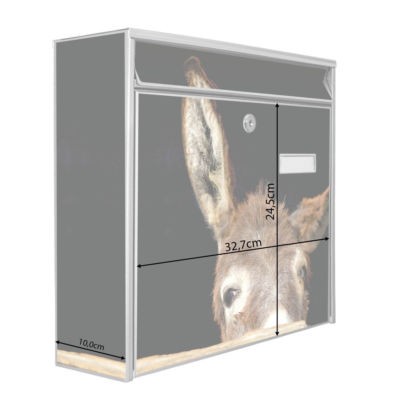 Der Burg Wächter Mail Briefkasten mit Motiv Esel bietet Ihnen mit seinem Fassungsvermögen genügend Platz auch für große A4 Sendungen. Auf Wunsch können Sie bei uns den passenden Standfuß kaufen und so aus dem Wandbriefkasten einen Standbriefkasten machen. Wir bieten Ihnen ebenfalls Namensschilder, bereits beschriftet oder frei zu beschriften, und verschiedene selbst gestaltete Bitte-Keine-Werbung-Aufkleber.